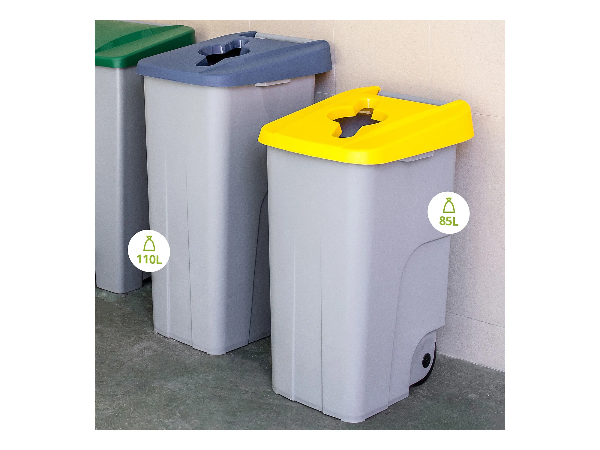 Recyclage Cube 45L Keden en plastique avec un couvercle jaune ouvert. 39x29x61