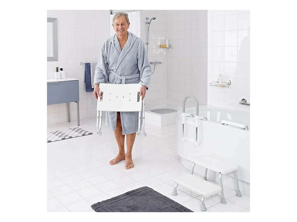 Siège de baignoire - siège de bain suspendu réglable - tabouret de salle de bain - dim. 71-81L x 22l x 18H cm - alu. HDPE blanc