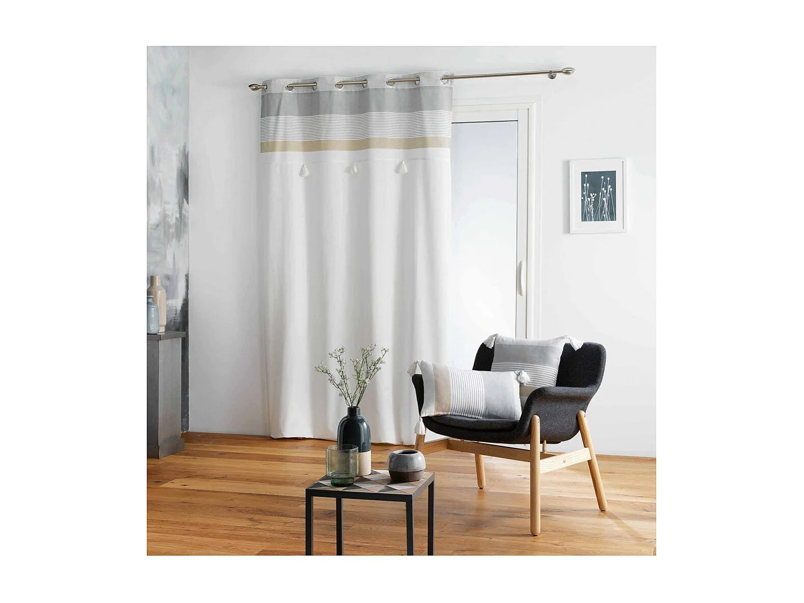 Rideau à Œillets Avec Pompons "Iliade" 140x240cm Blanc & Gris