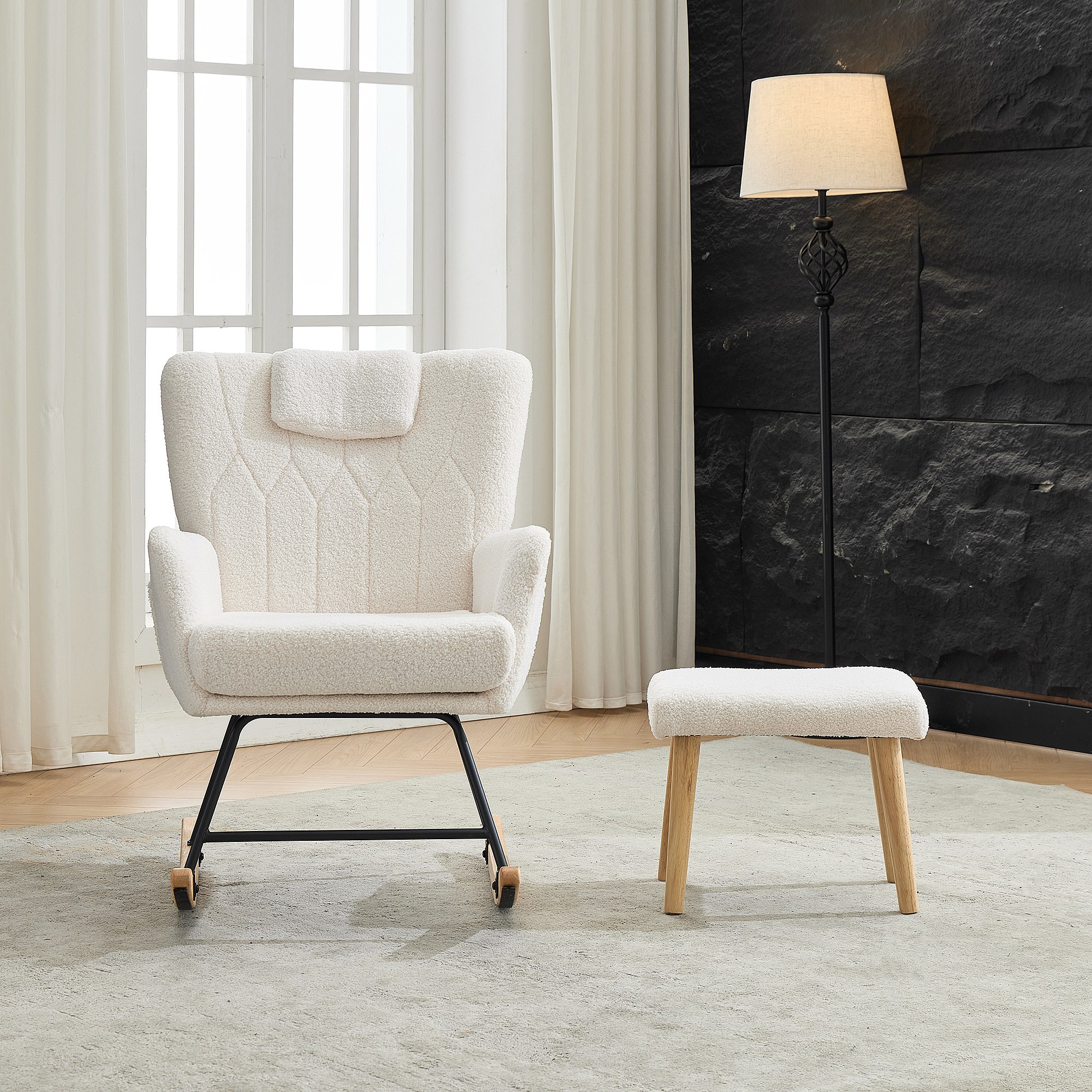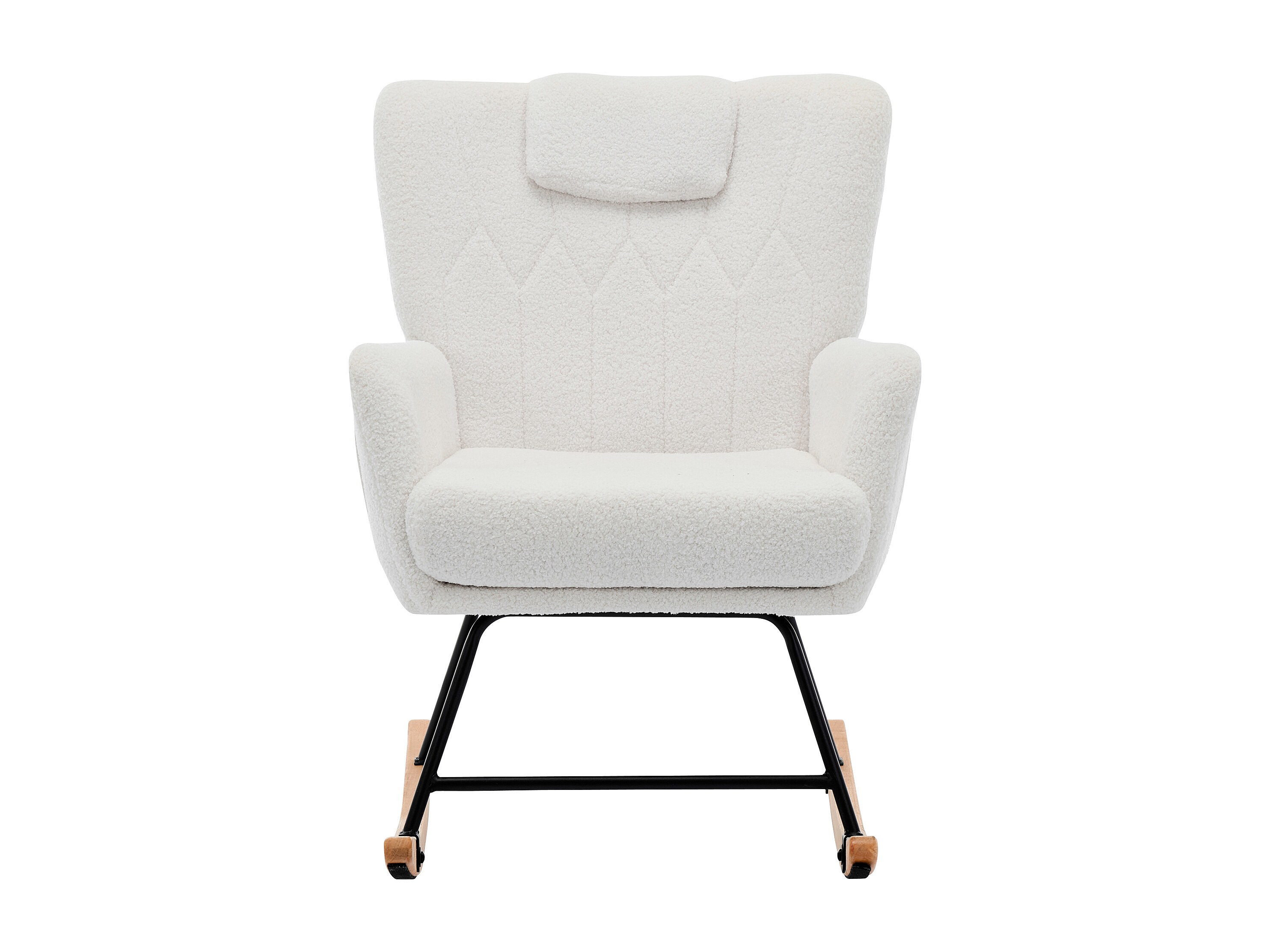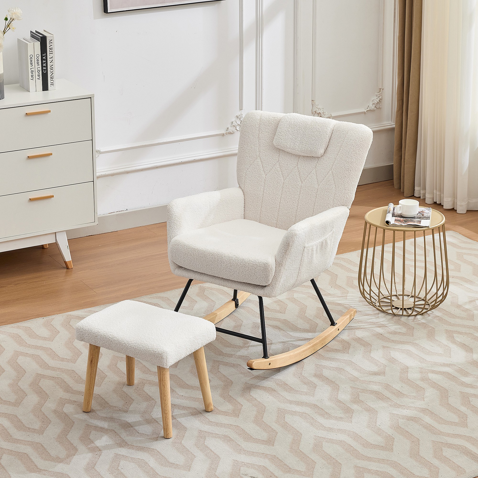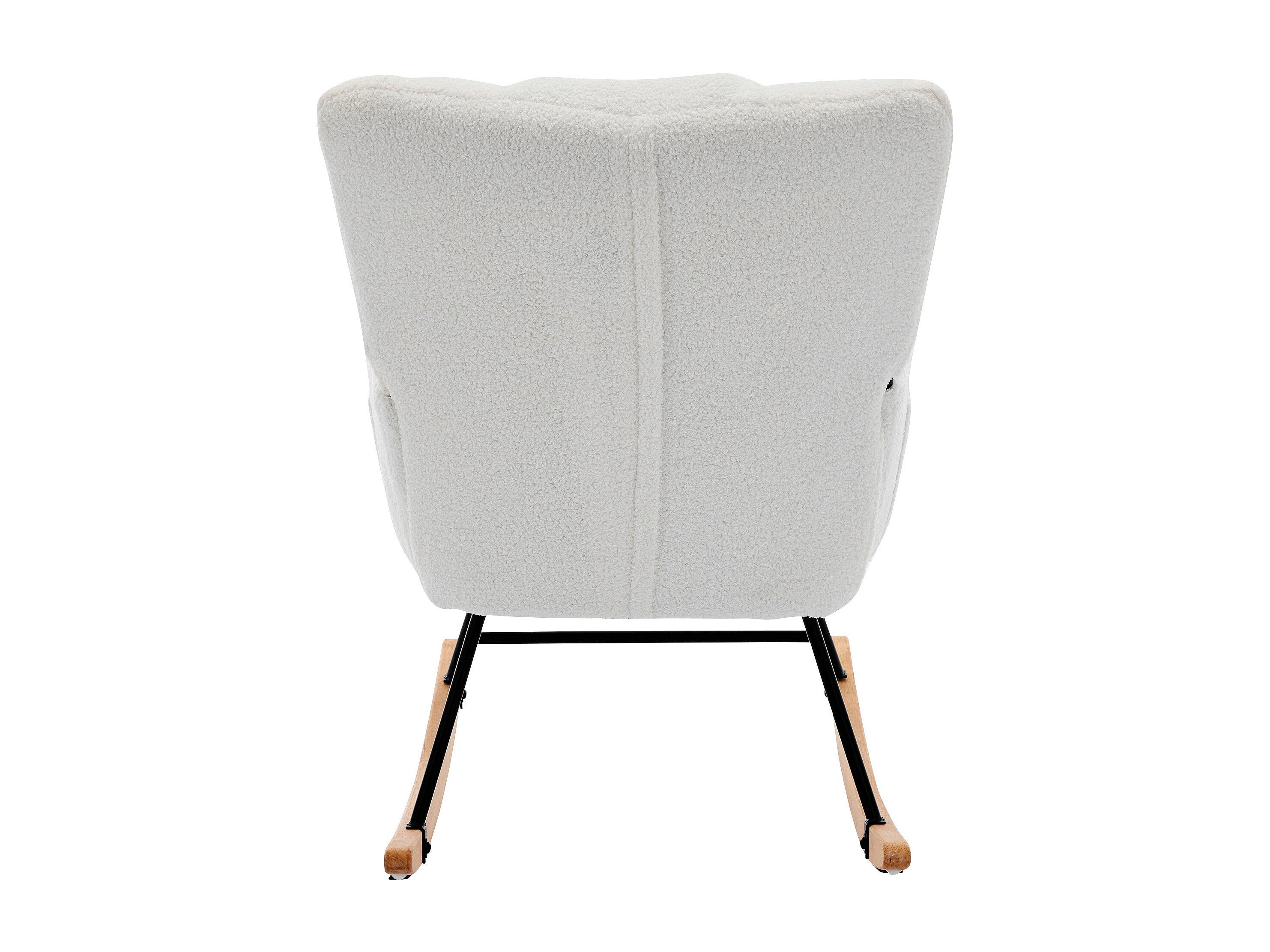 Rocking chair en tissu Teddy blanc,fauteuil à bascule avec repose-pieds et poches latérales