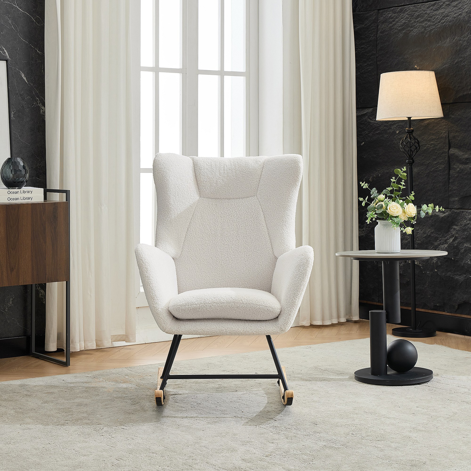 Chaise à bascule avec repose-pieds et appui-tête - 65 x 94 x 92 cm - Teddy-Polaire, boid d'évéa et métal - Blanc