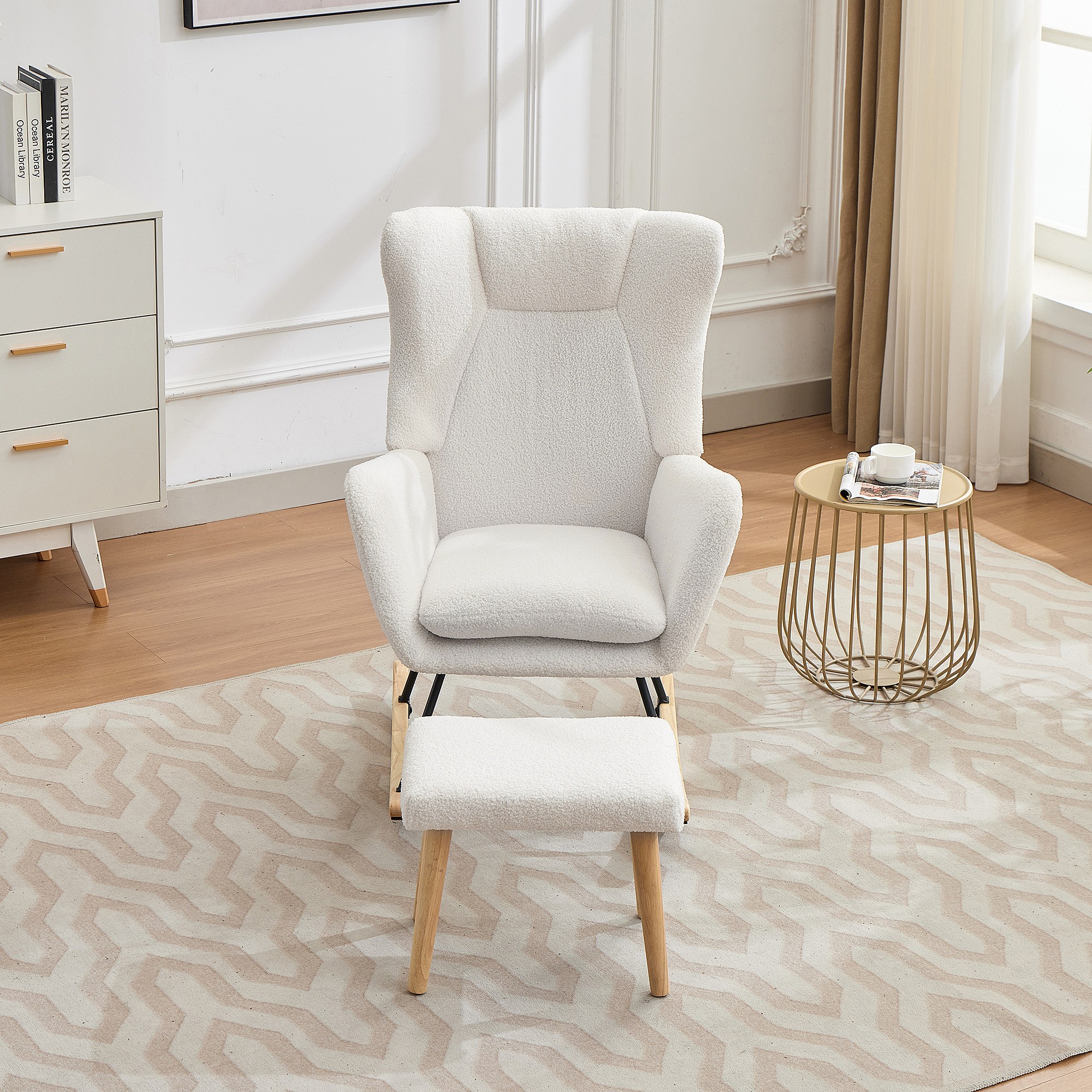 Fauteuil à bascule avec pouf en tissu blanc, avec sac de rangement et pieds de bois massif, 66.5x84x92.5cm