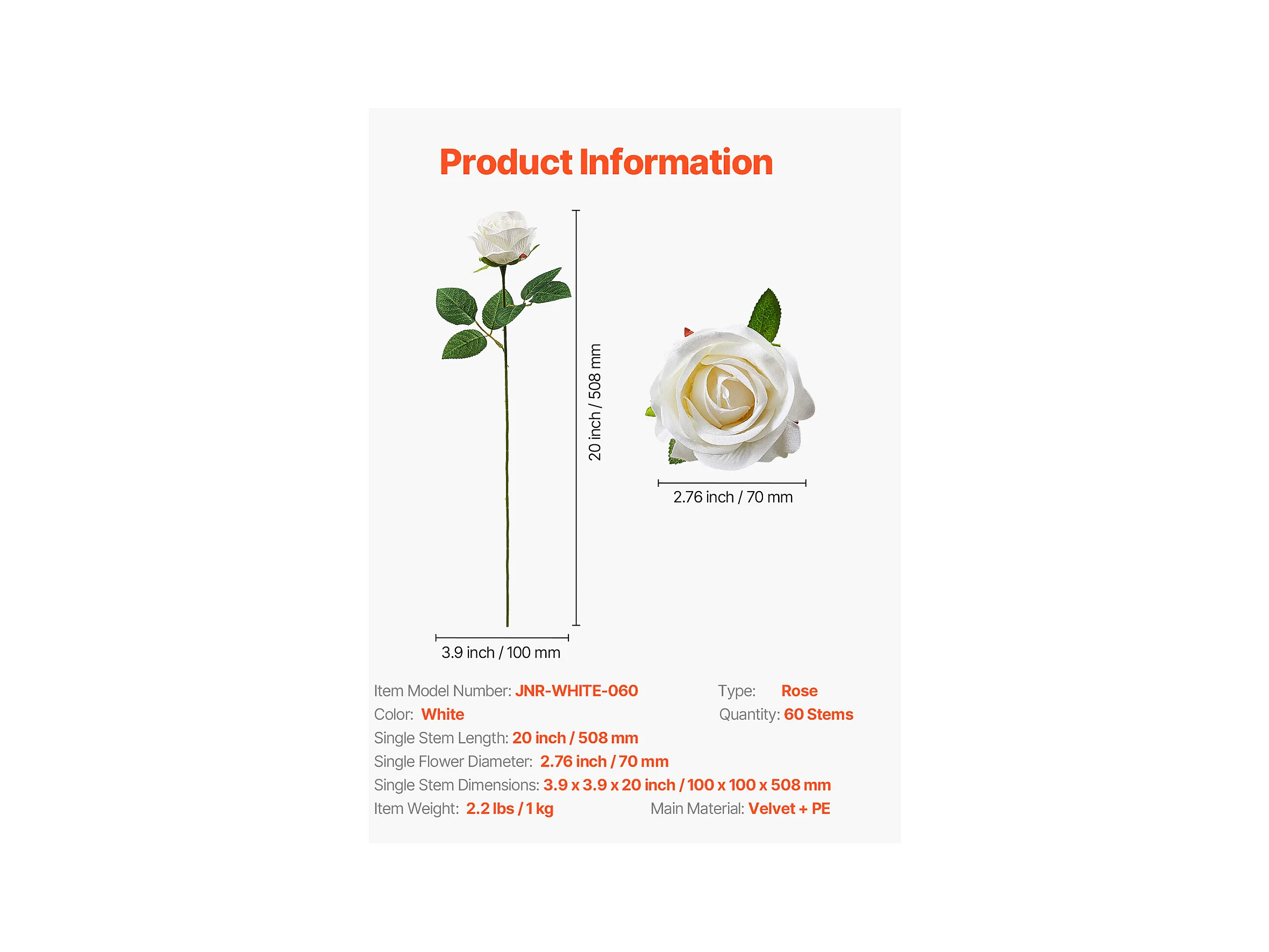 Rose Artificielle SucceBuy Fleurs Artificielles 508 mm, Bouquets de Fausses Fleurs Aspect Réaliste avec Tête de Rose 70 mm, Lot de 60, Blanc