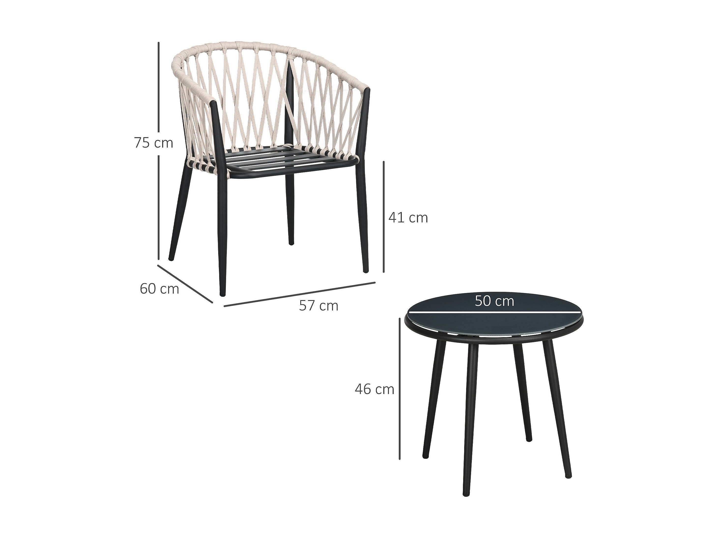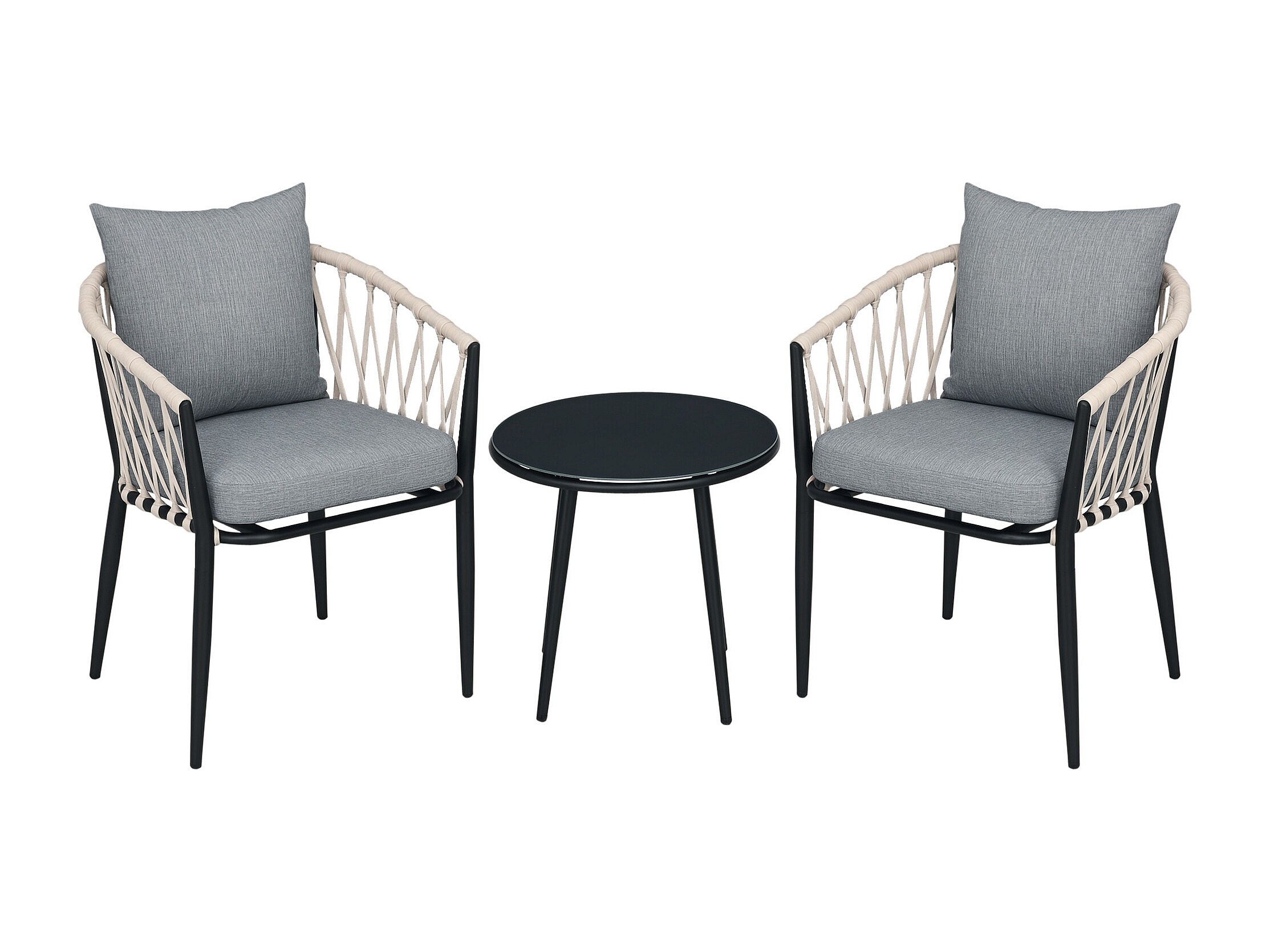 Salon de jardin 2 personnes 3 pièces 2 fauteuils avec coussins table basse ronde plateau verre trempé corde tressée métal gris