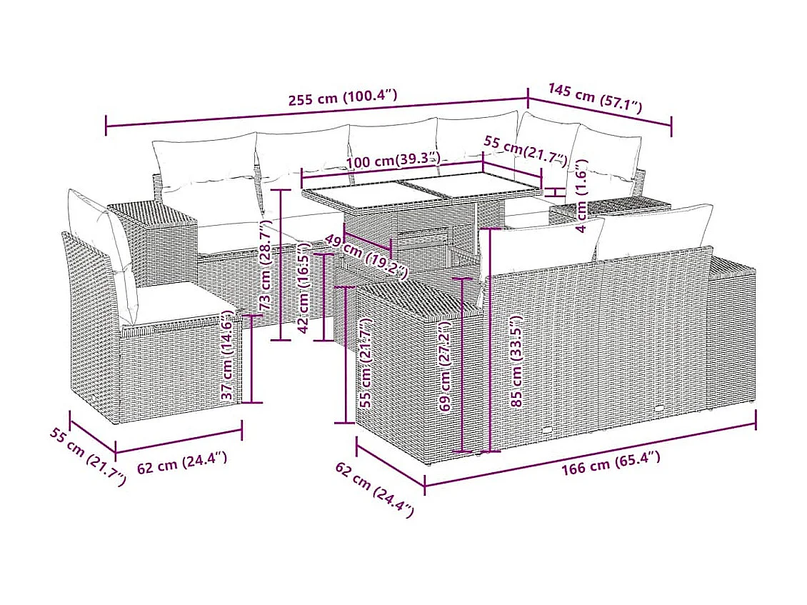 Salon de jardin 9 pcs avec coussins noir résine tressée