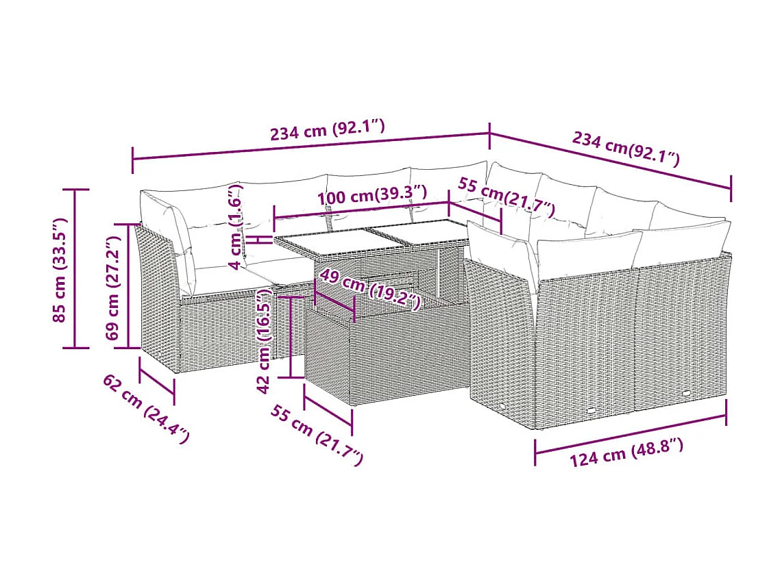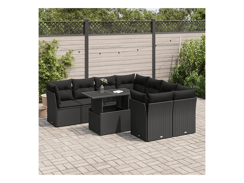 Salon de jardin 9 pcs avec coussins noir résine tressée