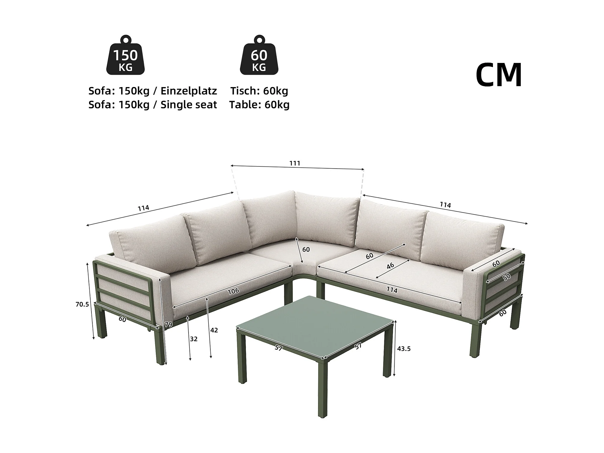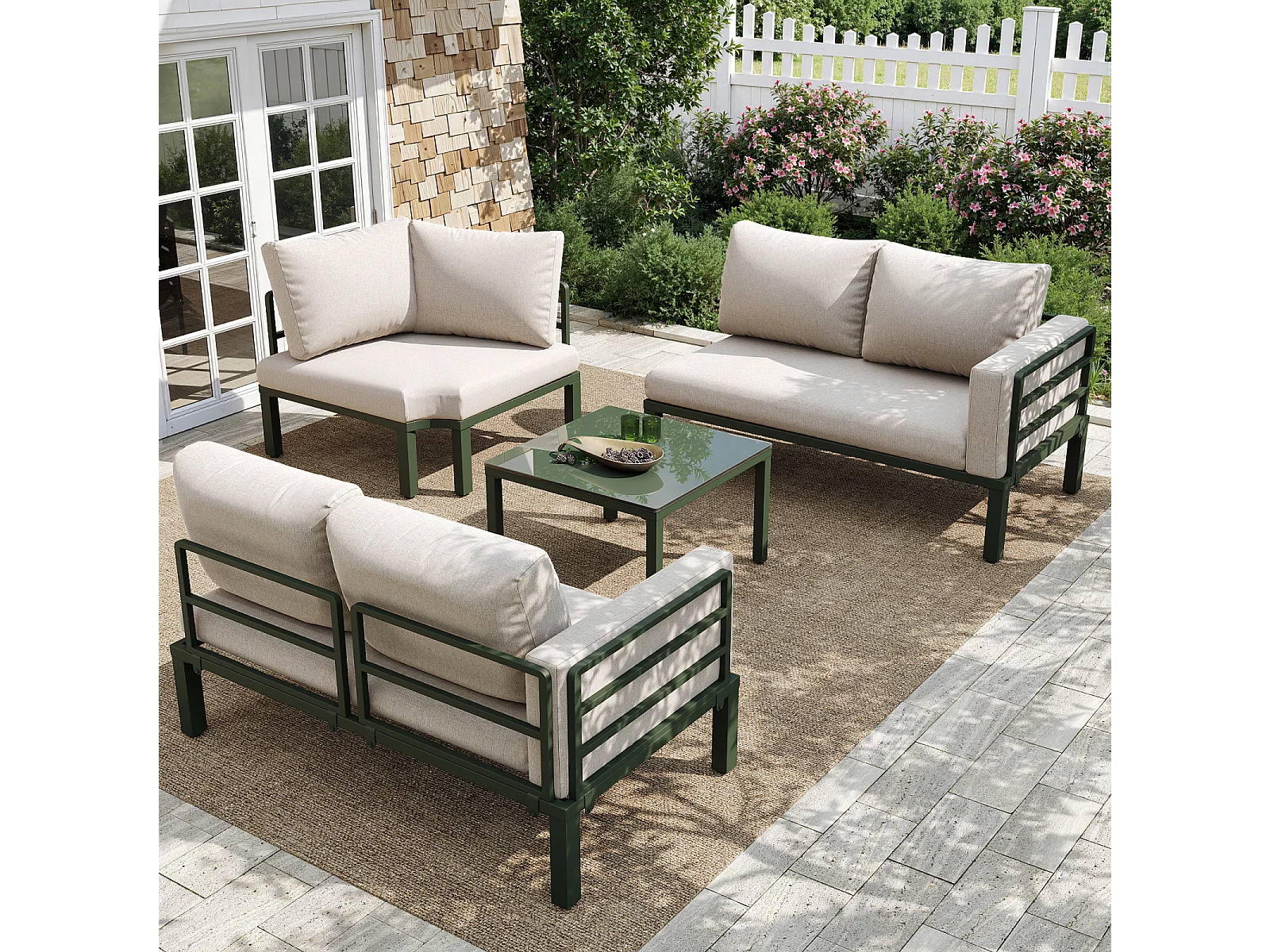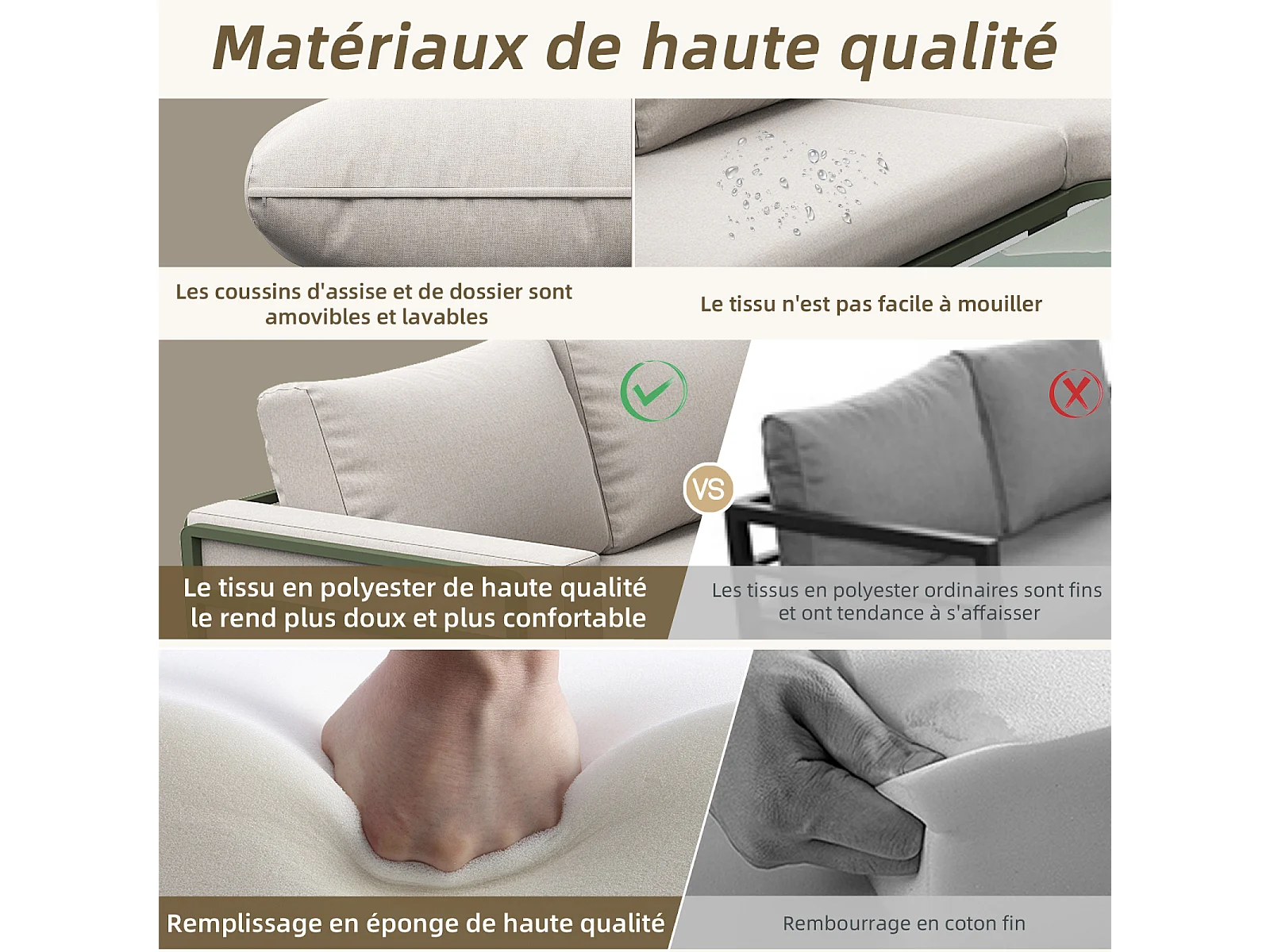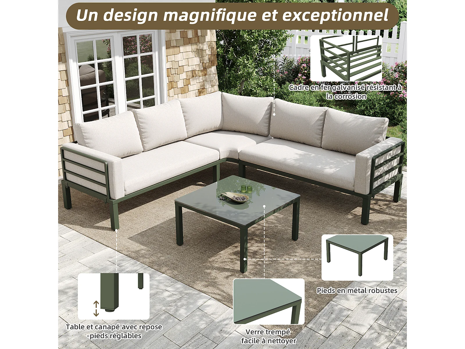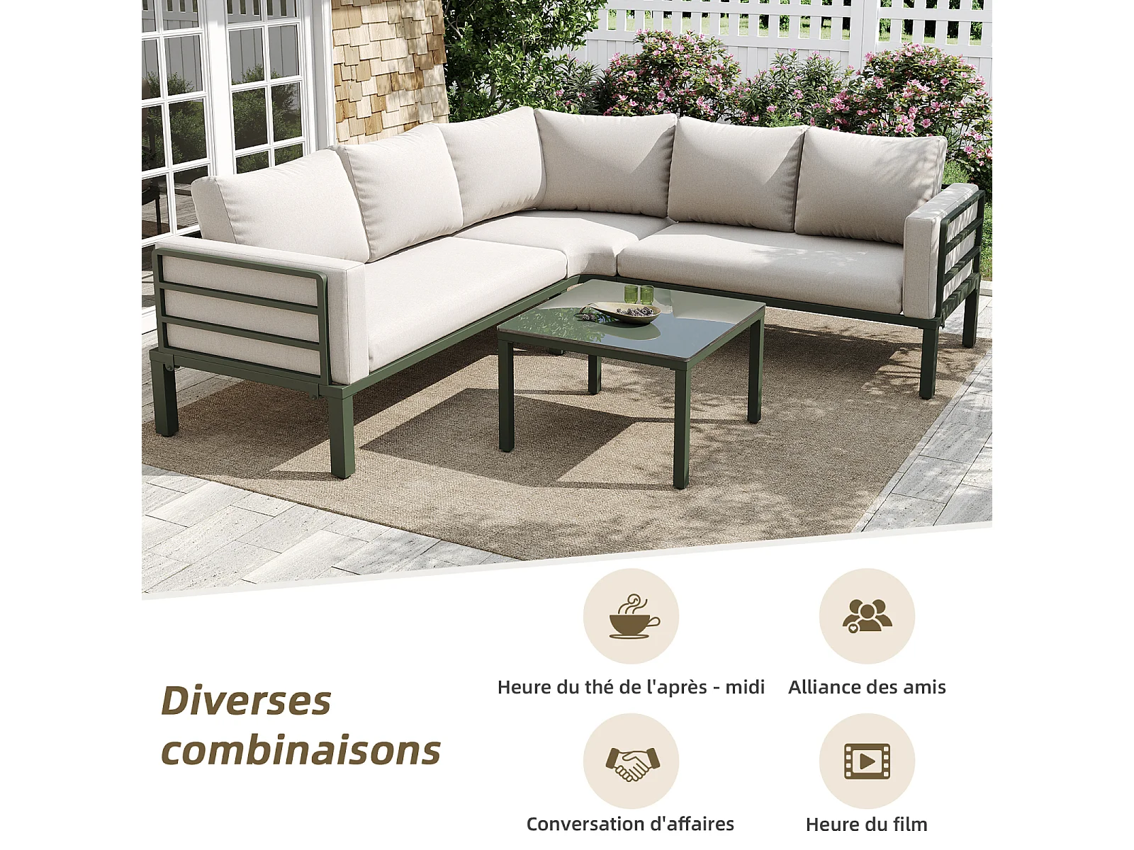 Salon de jardin avec 2 causeuses, 1 canapé d'angle et 1 table basse - avec coussins et dossiers - beige