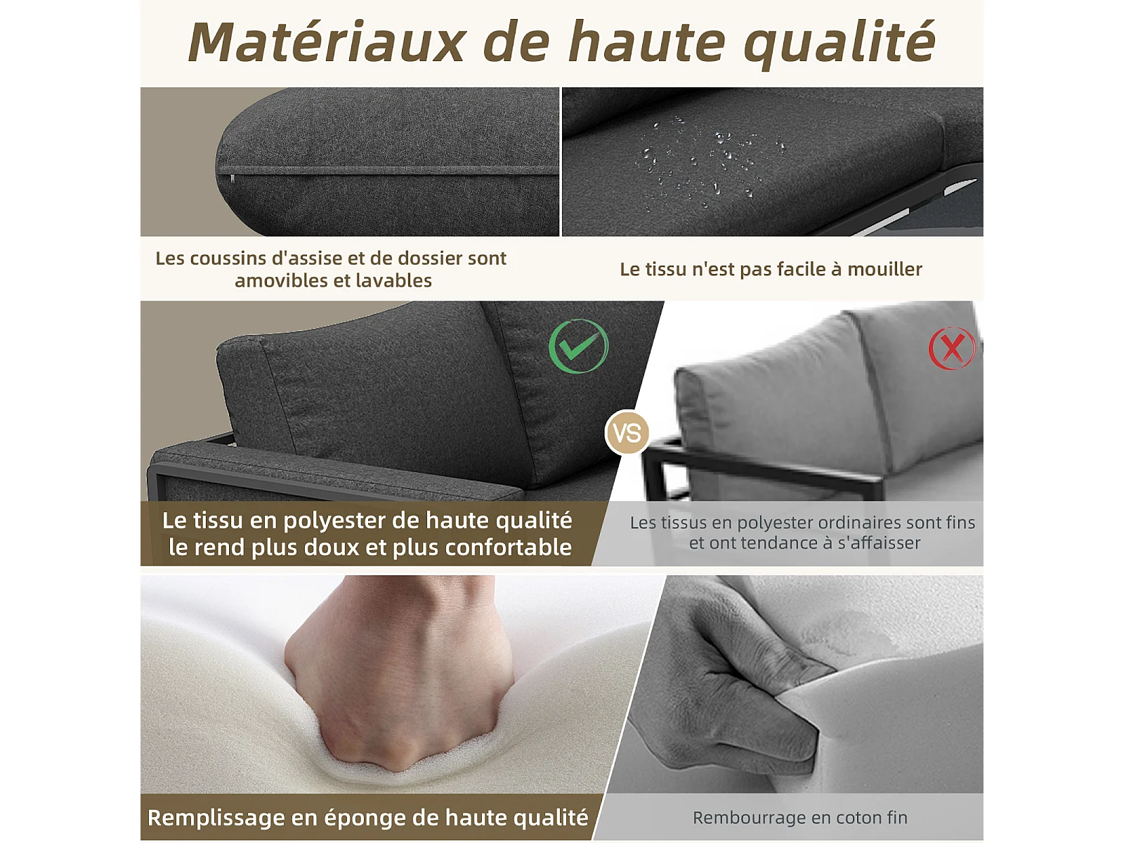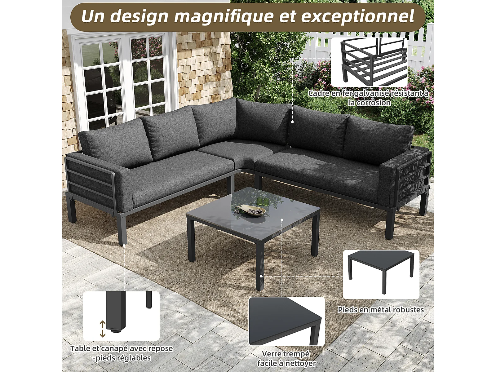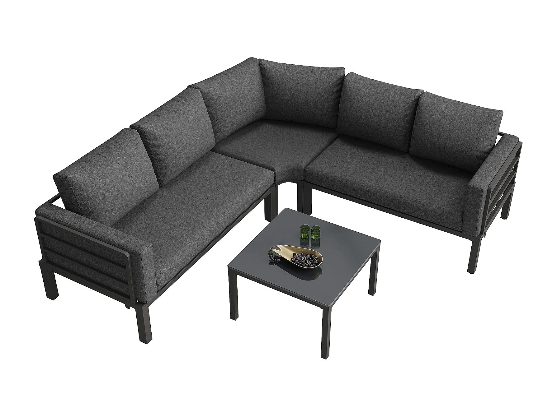 Salon de jardin avec 2 causeuses, 1 canapé d'angle et 1 table basse - avec coussins et dossiers - gris
