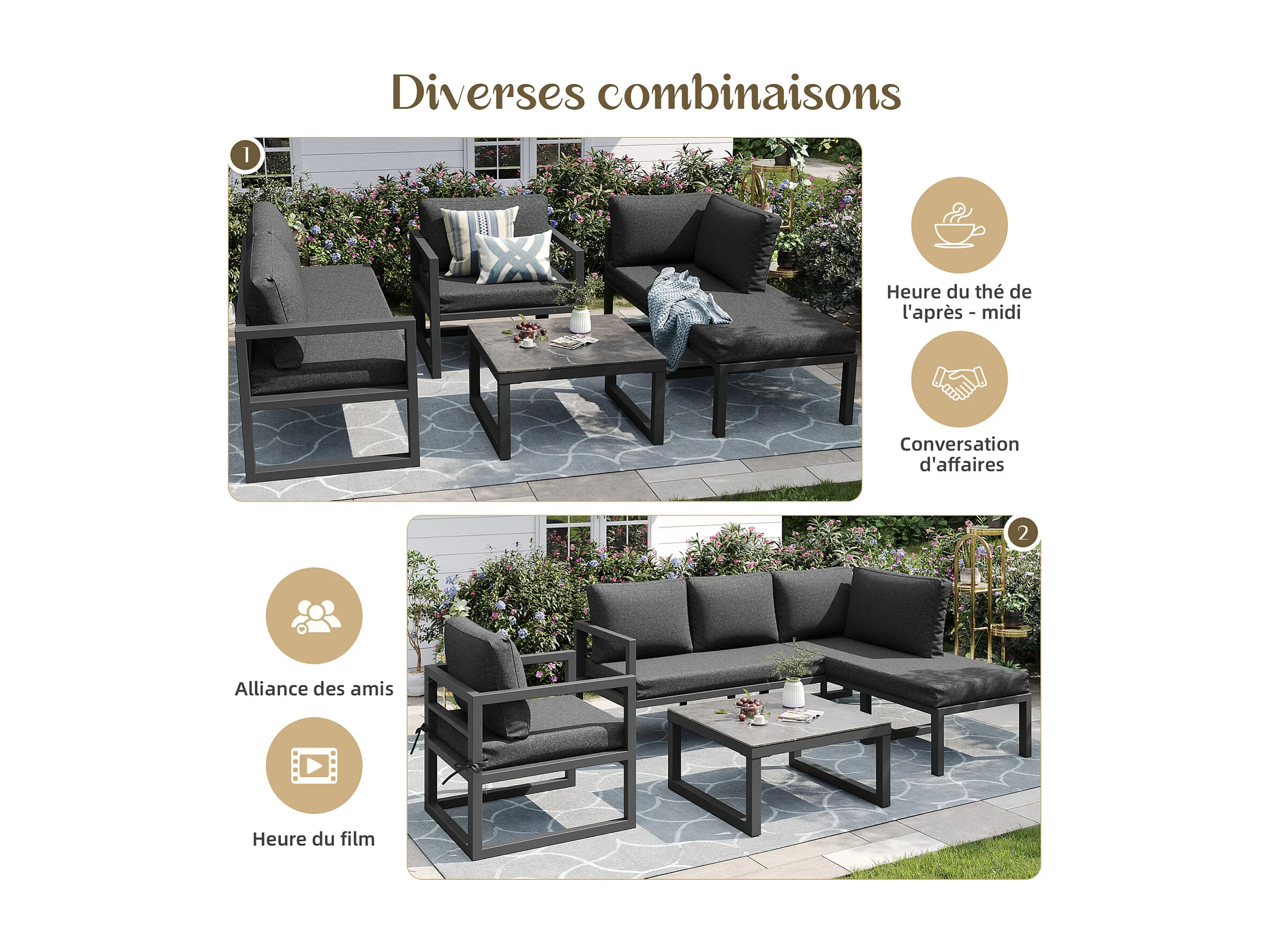 Salon de jardin avec canapé deux places, fauteuil et table basse - avec coussins et dossiers - gris