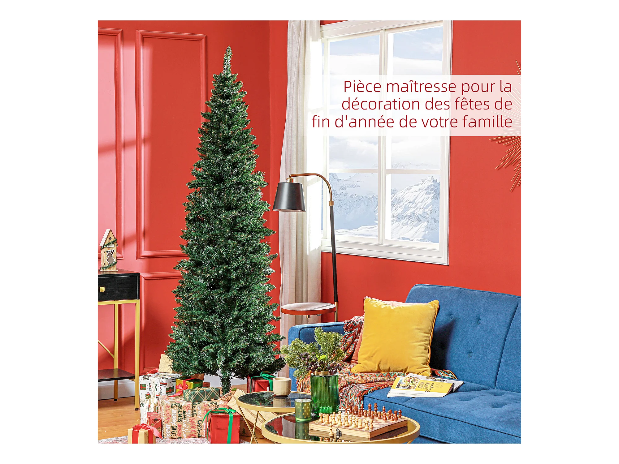 Sapin de Noël artificiel décoré Ø 78 x 210H cm 746 branches épines grand réalisme 45 baies rouges