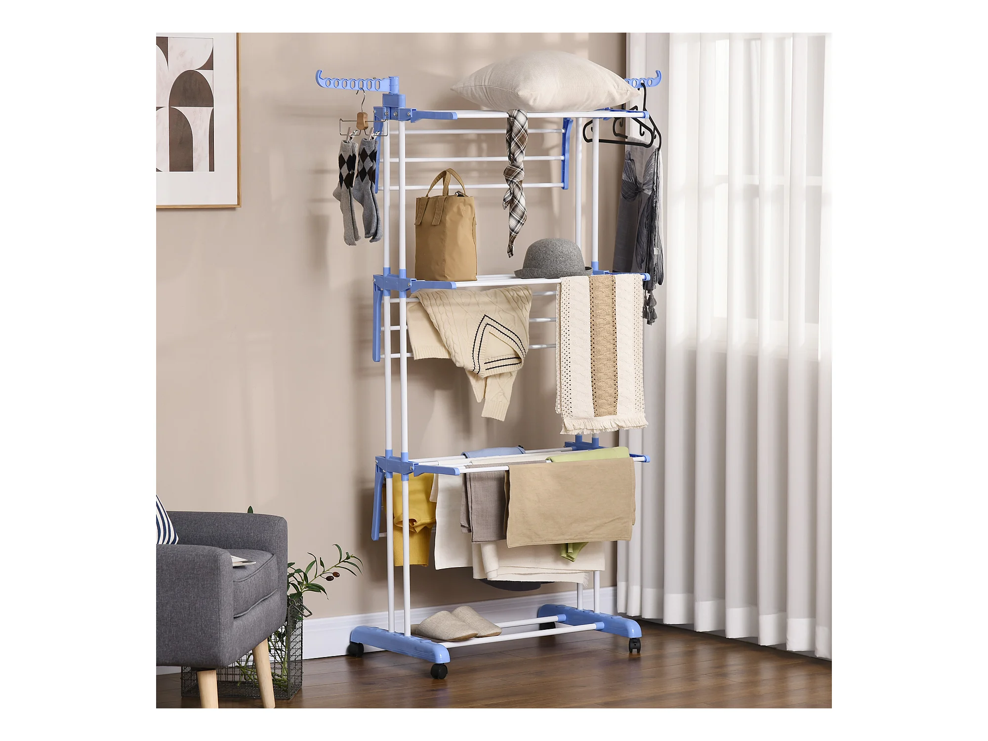 Séchoir à linge en colonne bleu acier, 4 niveaux, extensible avec roulettes