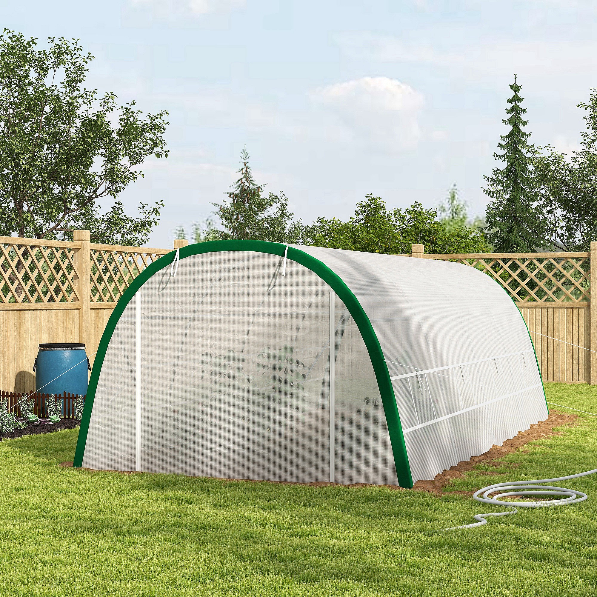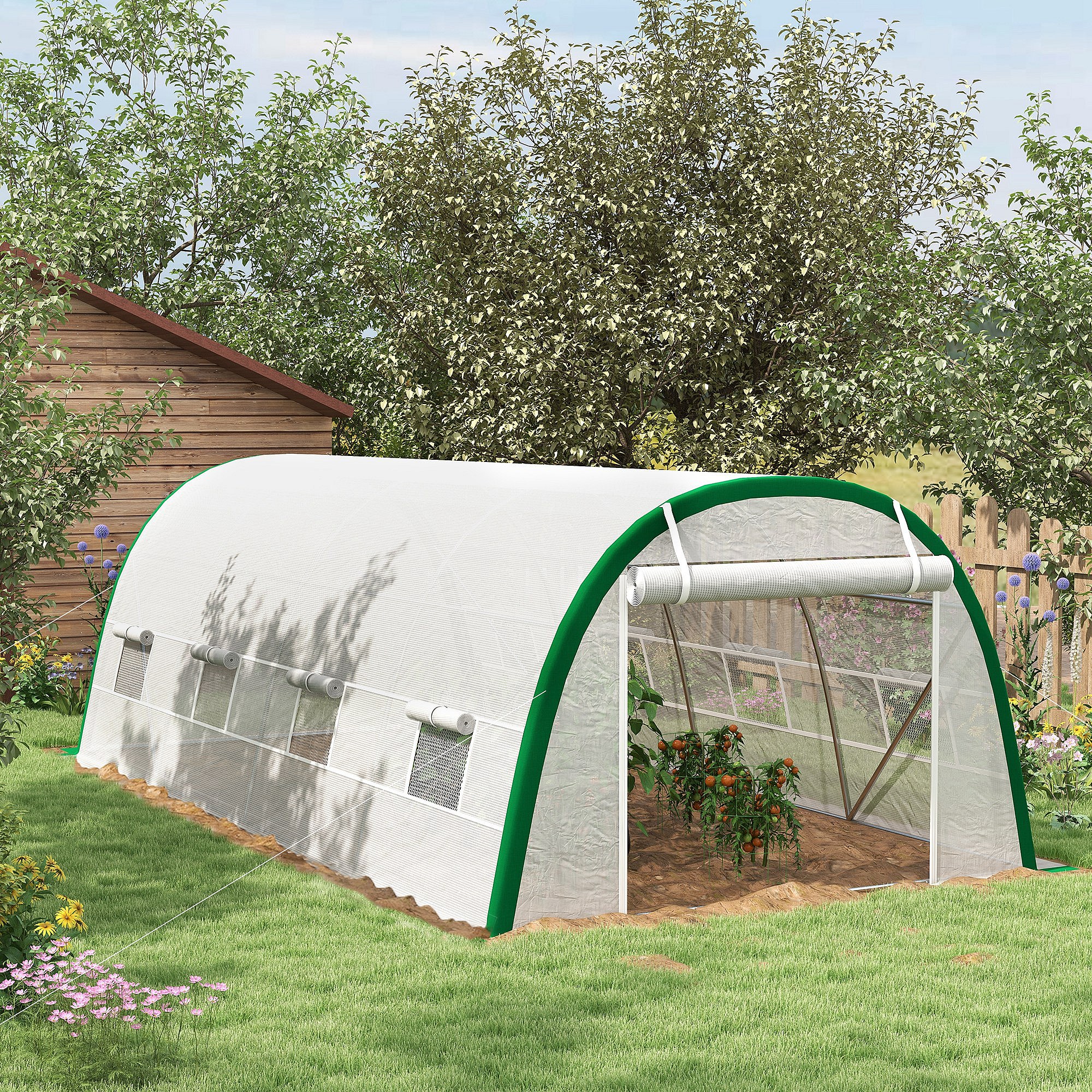 Serre de jardin tunnel surface sol 18 m² châssis tubulaire acier galvanisé renforcé 24 mm 8 fenêtres PE maillé blanc vert