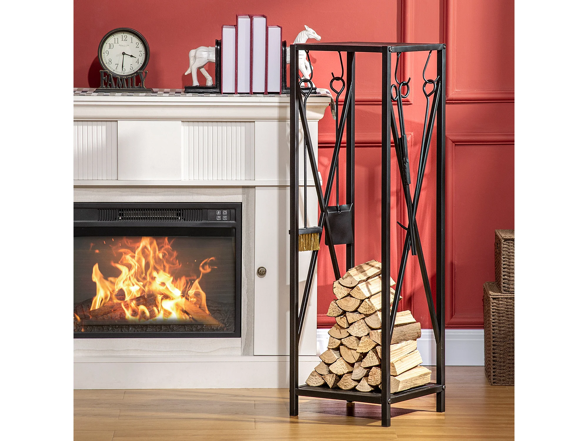 Serviteur de cheminée - porte bûches - range bûches multi accessoires étagère bûche et petit bois métal noir