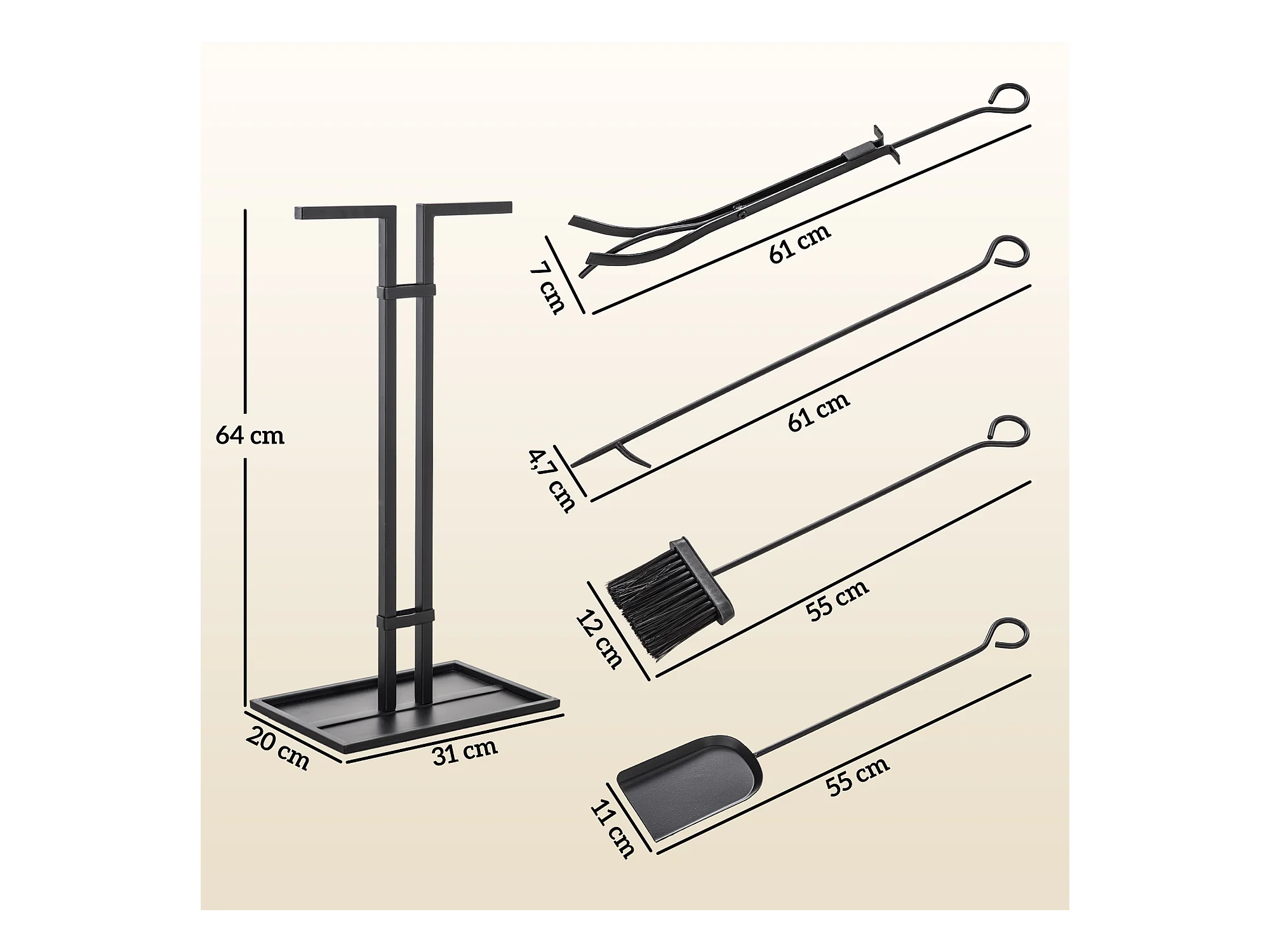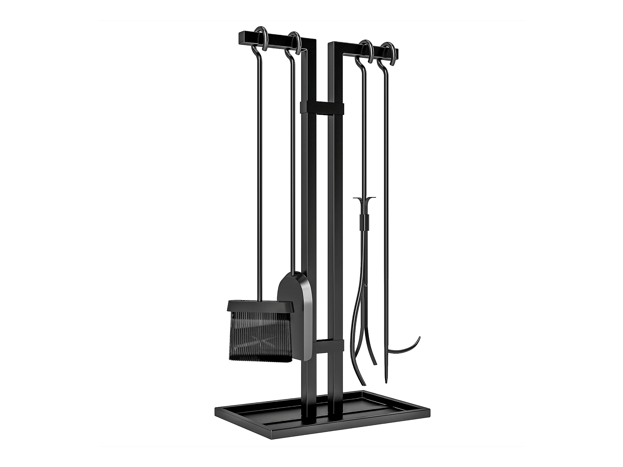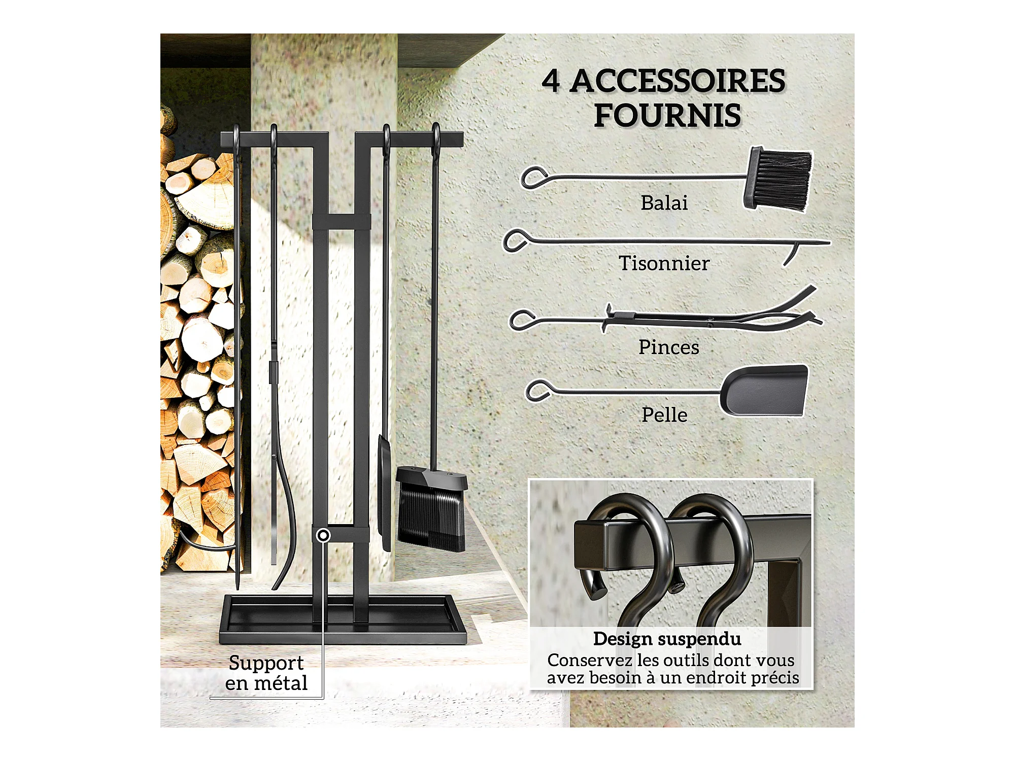 Serviteur de cheminée moderne 5 pièces - balai, pelle, pince, tisonnier, support - métal noir