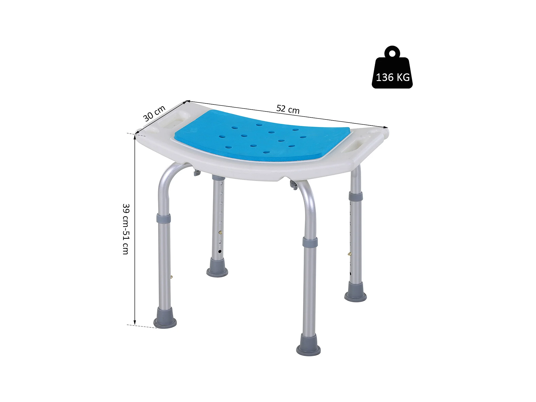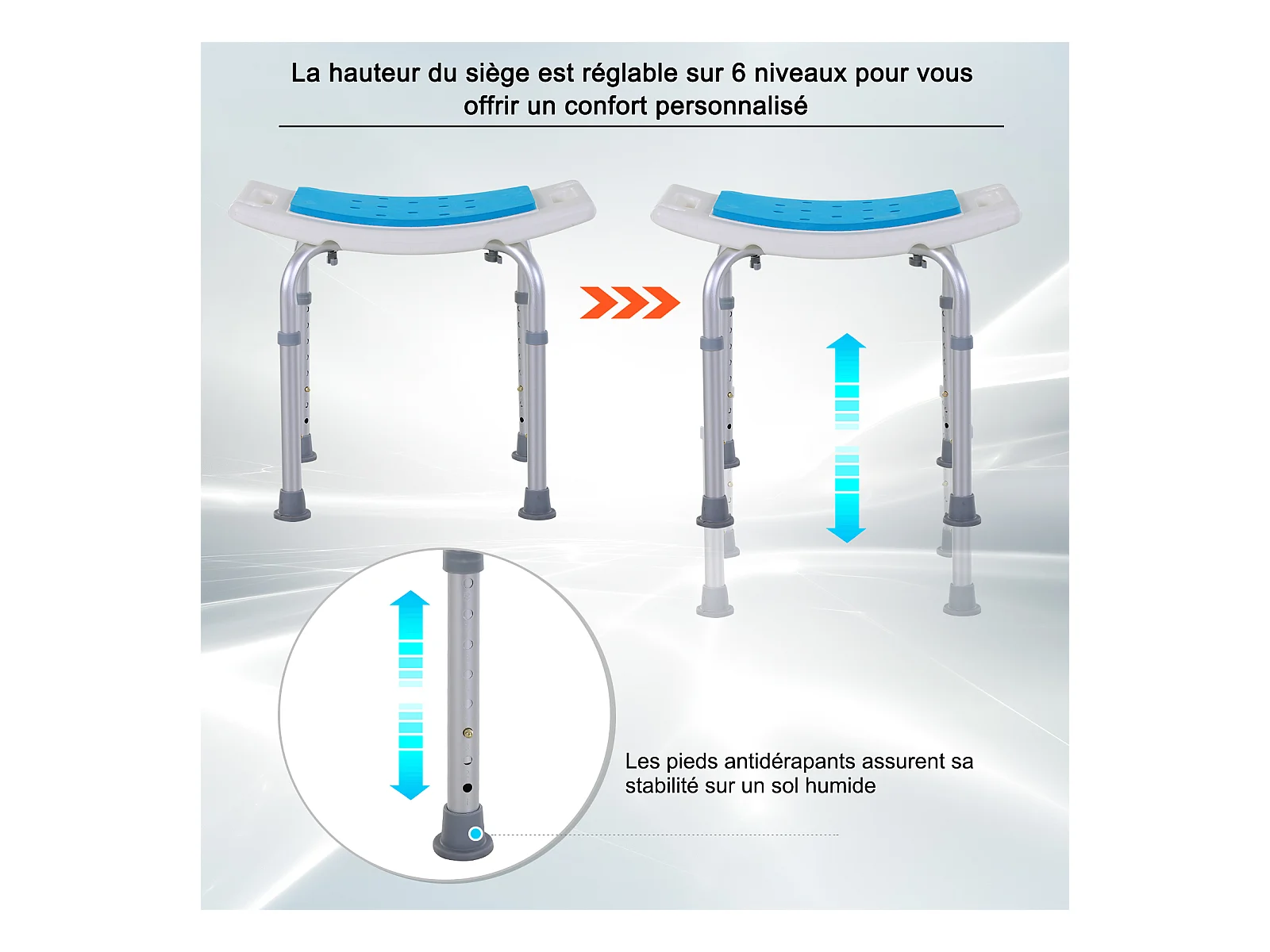 Siège de douche réglable en hauteur tabouret de douche ergonomique pieds antidérapants charge max. 135 Kg alu HDPE blanc bleu