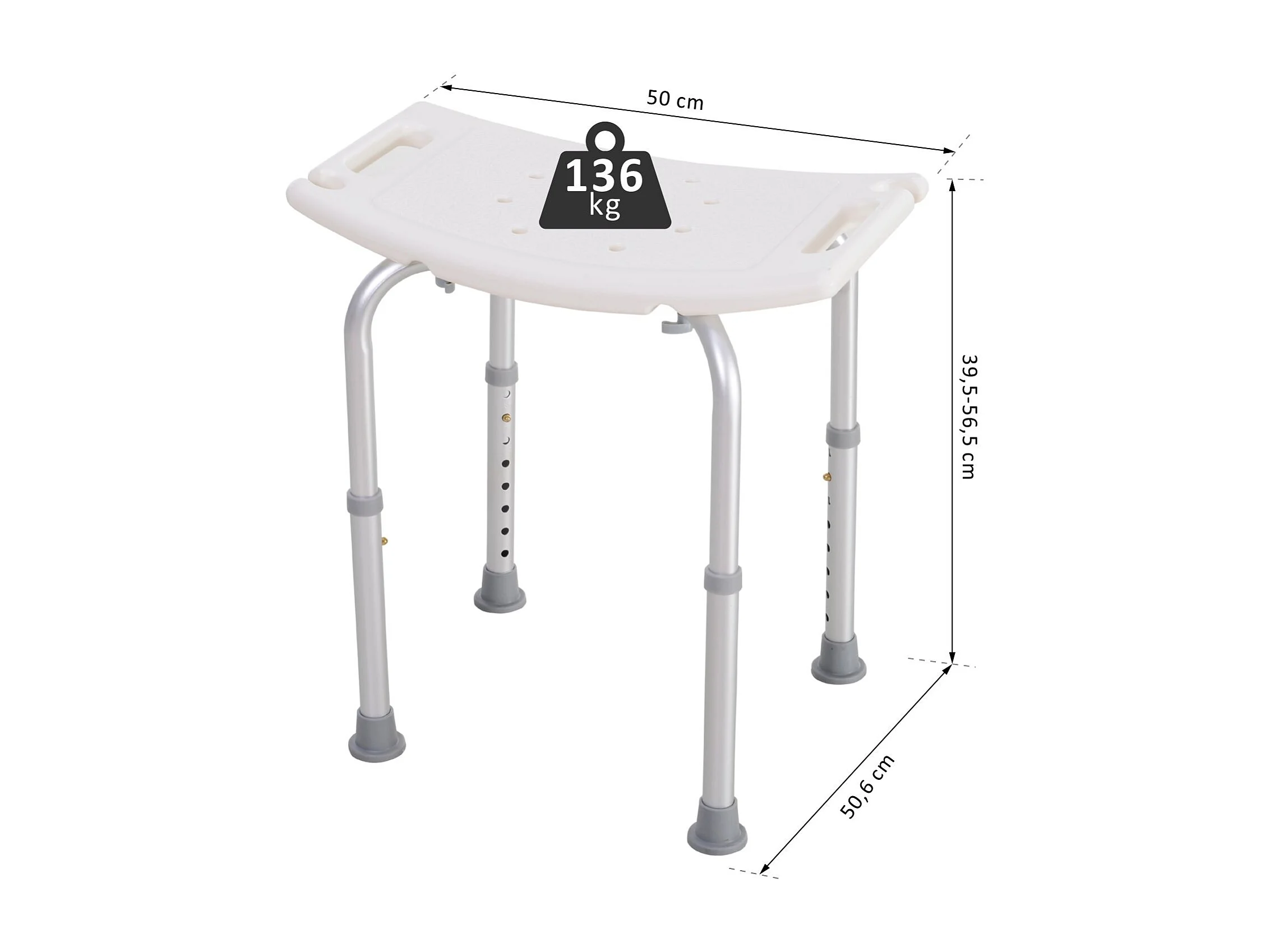 Chaise de douche siège de douche ergonomique hauteur réglable pieds antidérapants charge max. 135 Kg alu HDPE blanc