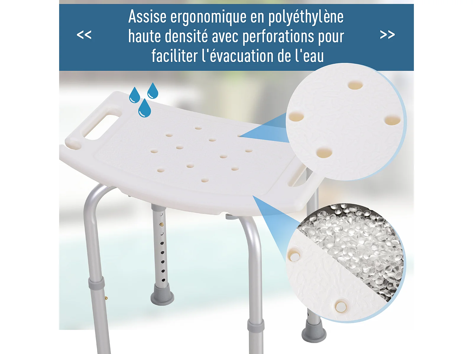 Chaise de douche siège de douche ergonomique hauteur assise réglable pieds antidérapants charge max. 136 Kg alu HDPE blanc