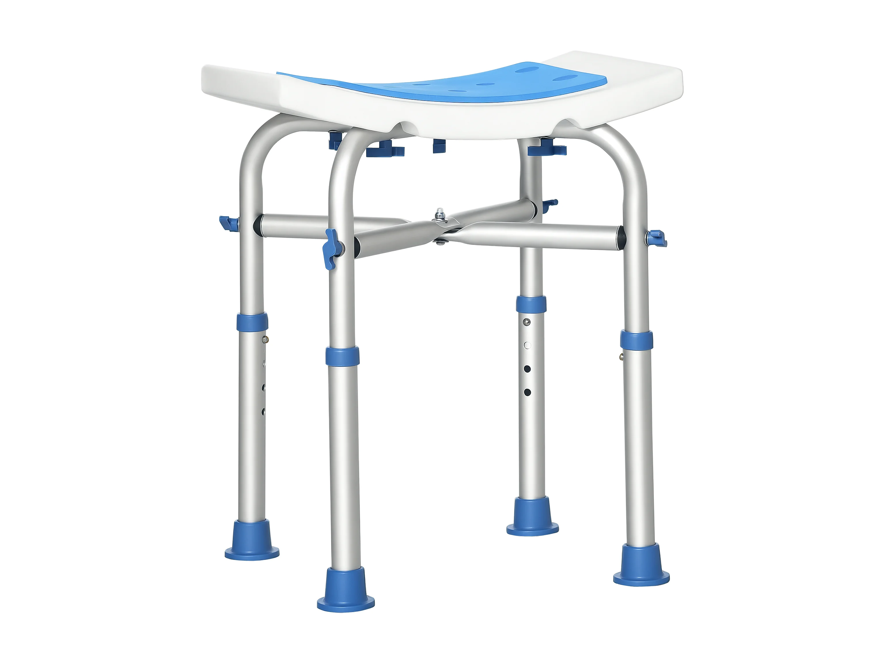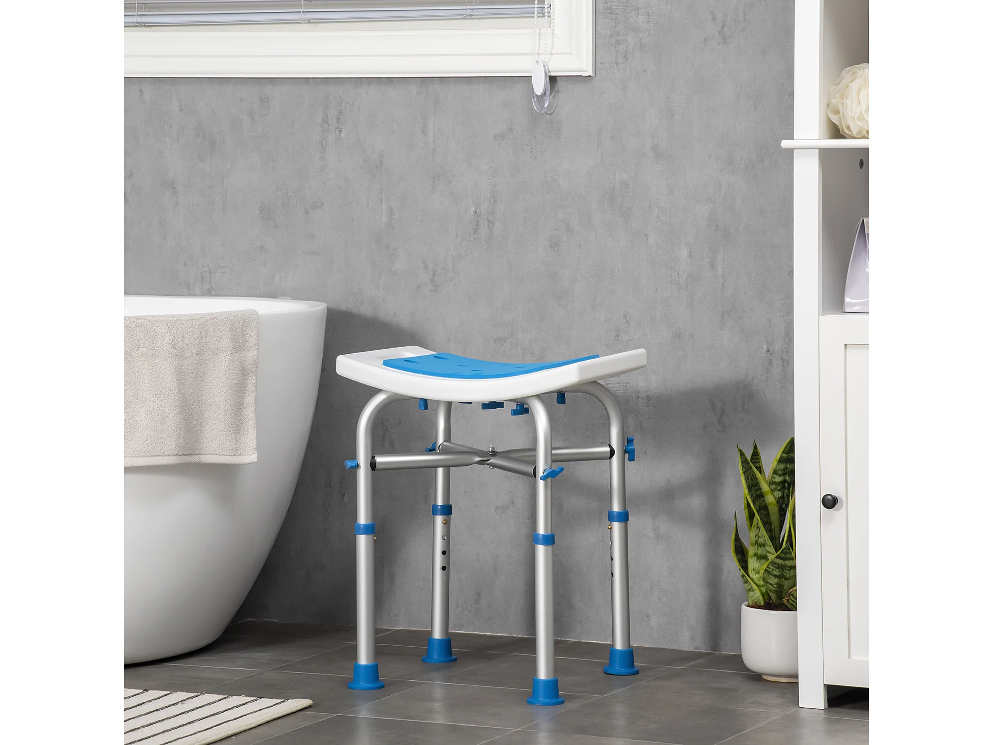 Siège de douche réglable en hauteur tabouret de douche ergonomique pieds antidérapants charge max. 150 Kg alu HDPE blanc bleu