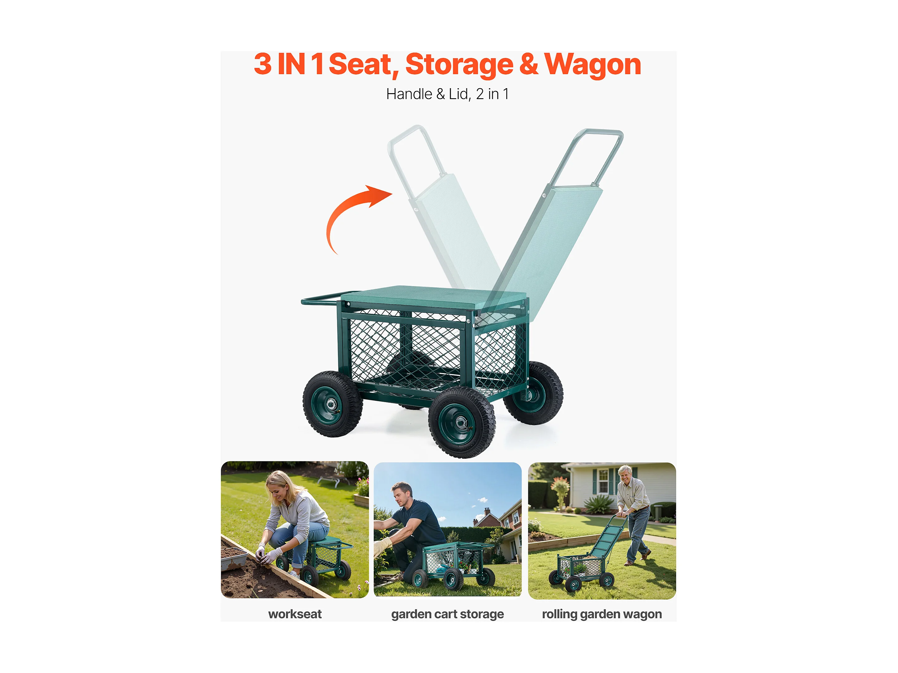 Siège de Jardin Roulant SucceBuy, Tabouret de Jardinage sur Roues Léger 2 en 1 avec Bac de Rangement, Capacité 123 kg, pour Plantation, Terrasse, Extérieur