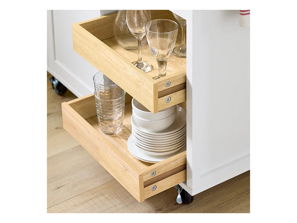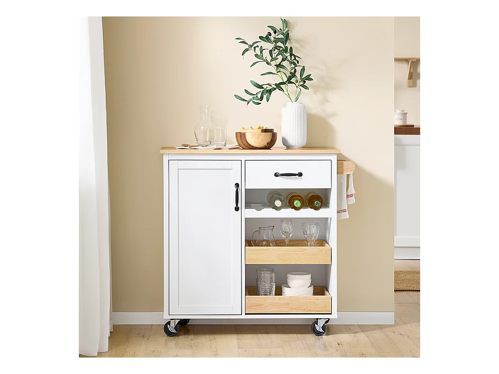 Chariot de service desserte de cuisine à roulettes tiroir placard 2 portes étagère panneaux particules blanc aspect chêne clair