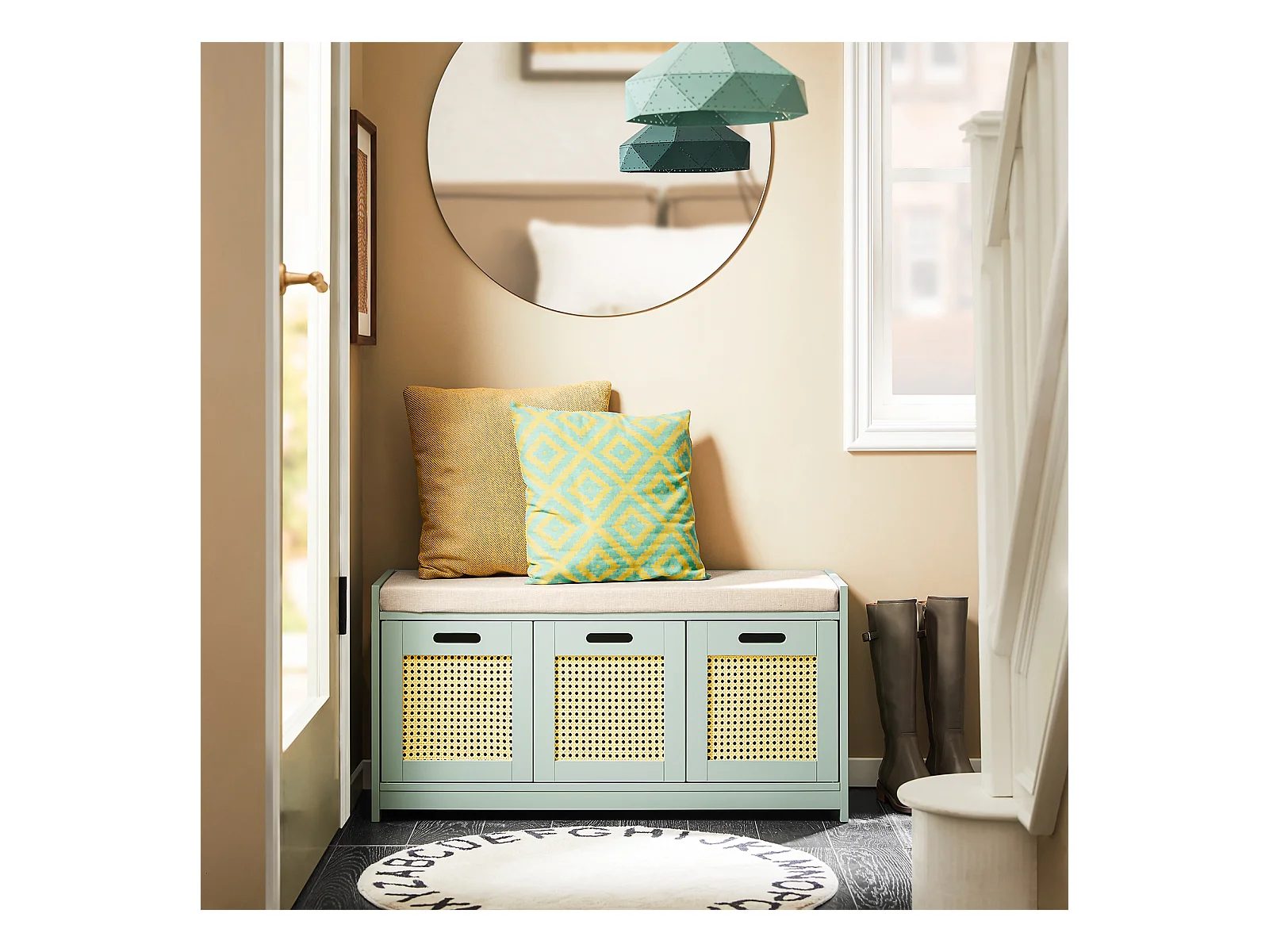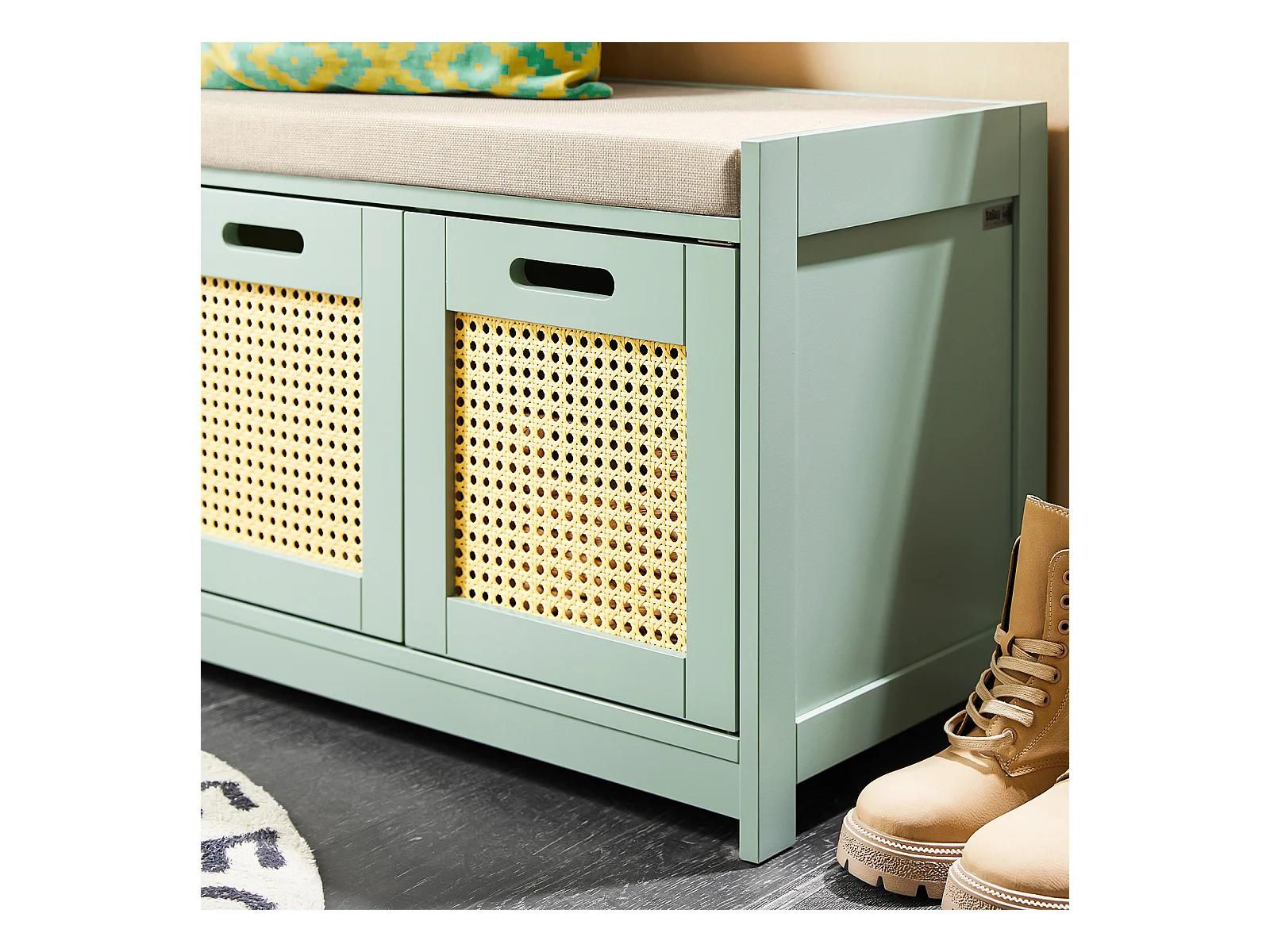 Meuble chaussures banc à chaussures 2 en 1 style bohème chic 2 portes étagère réglable - MDF vert d'eau aspect chêne clair rotin