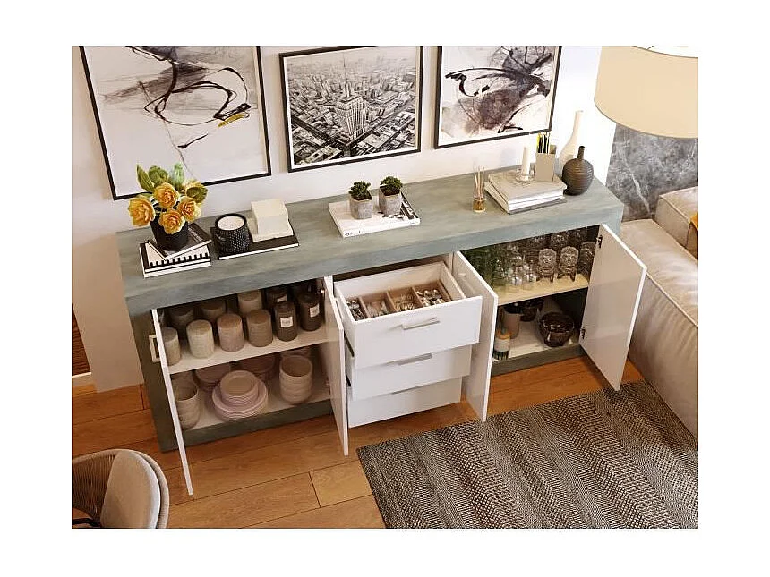 STONE Buffet 4 portes 3 tiroirs - Décor béton et blanc - L 206 x P 45 x H 83,4 cm