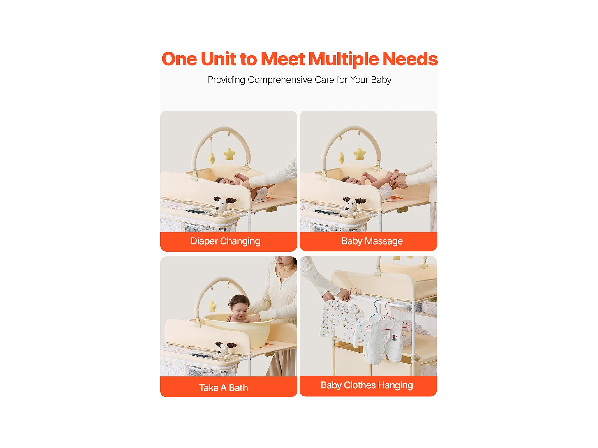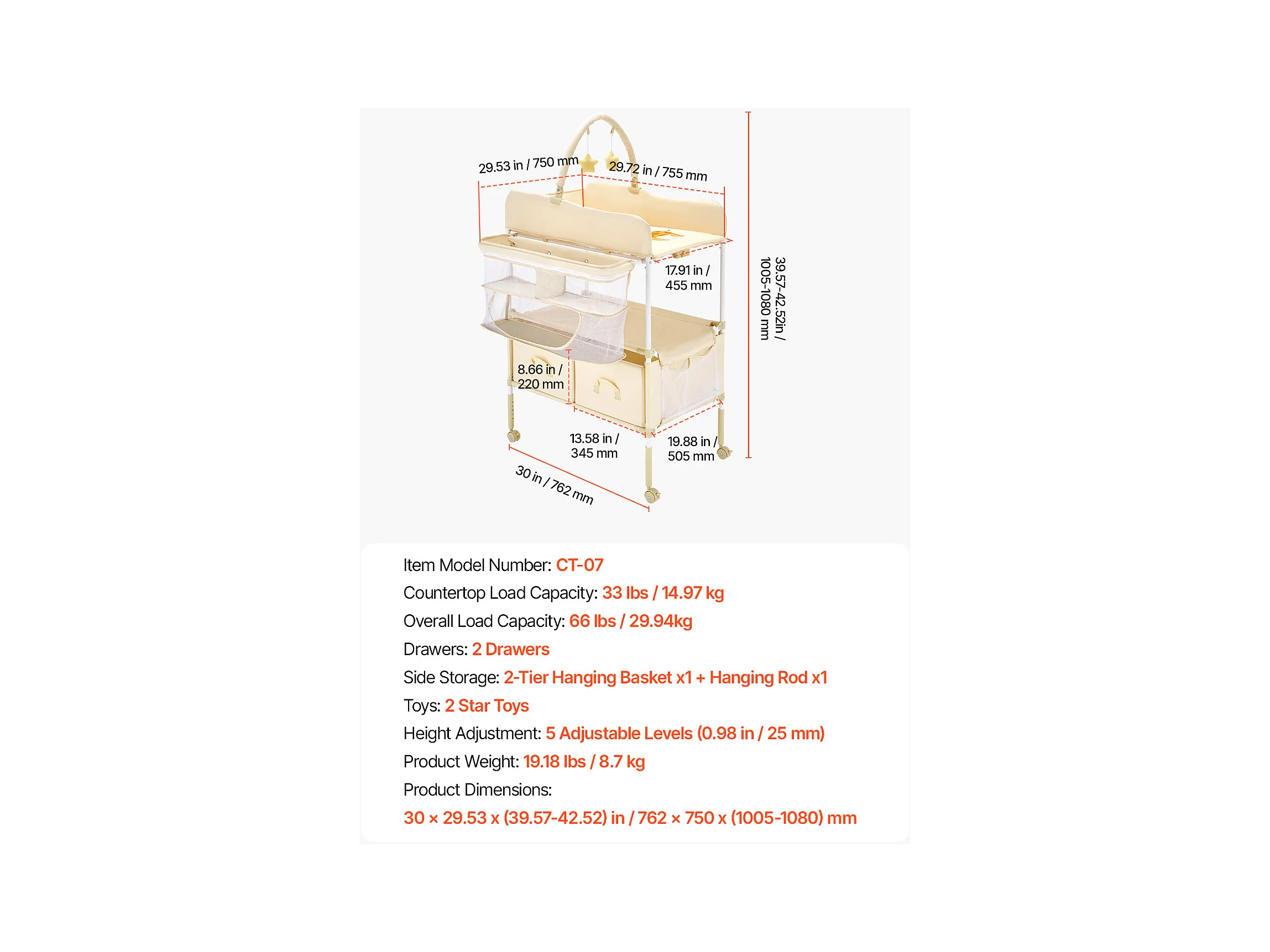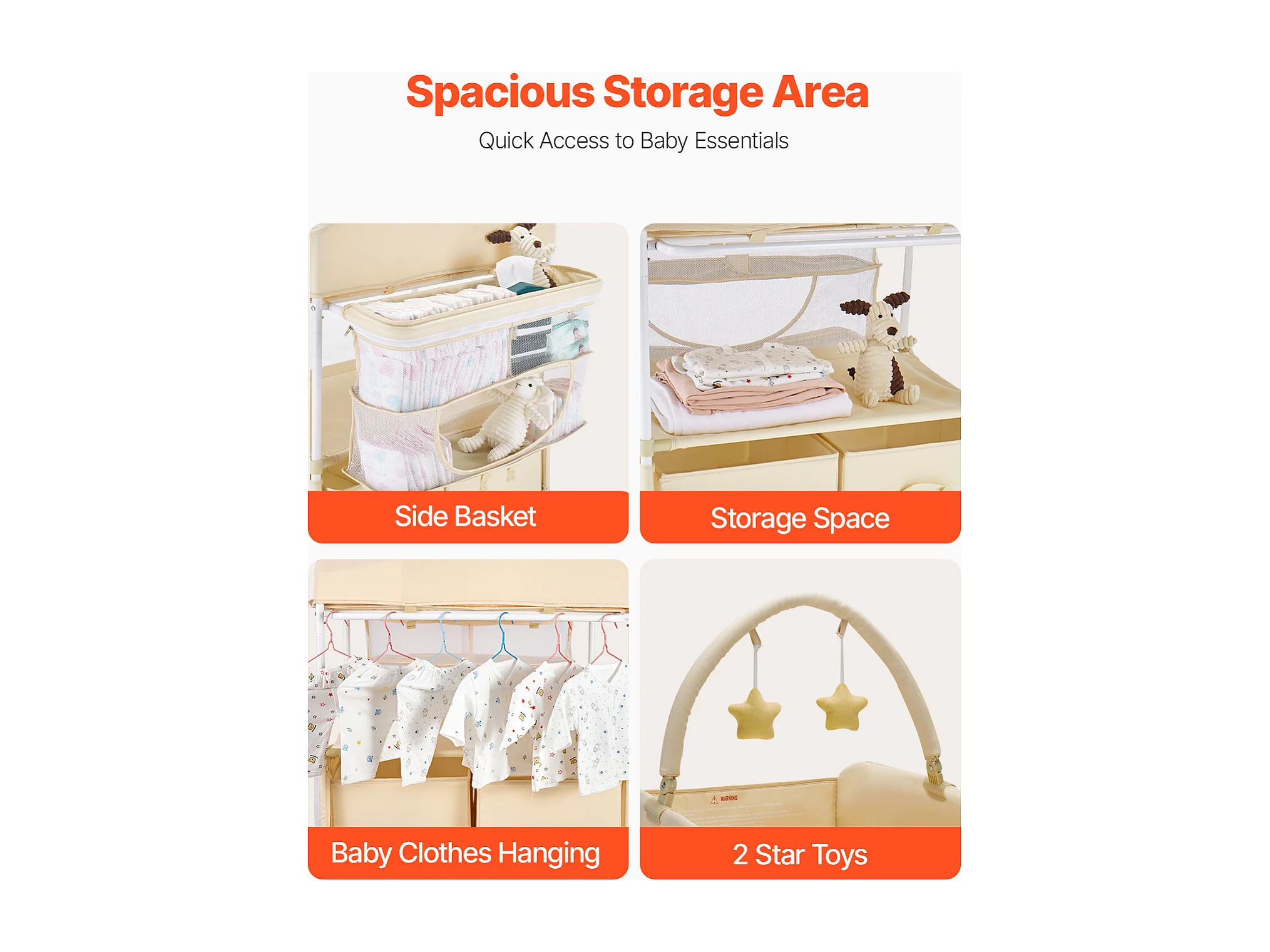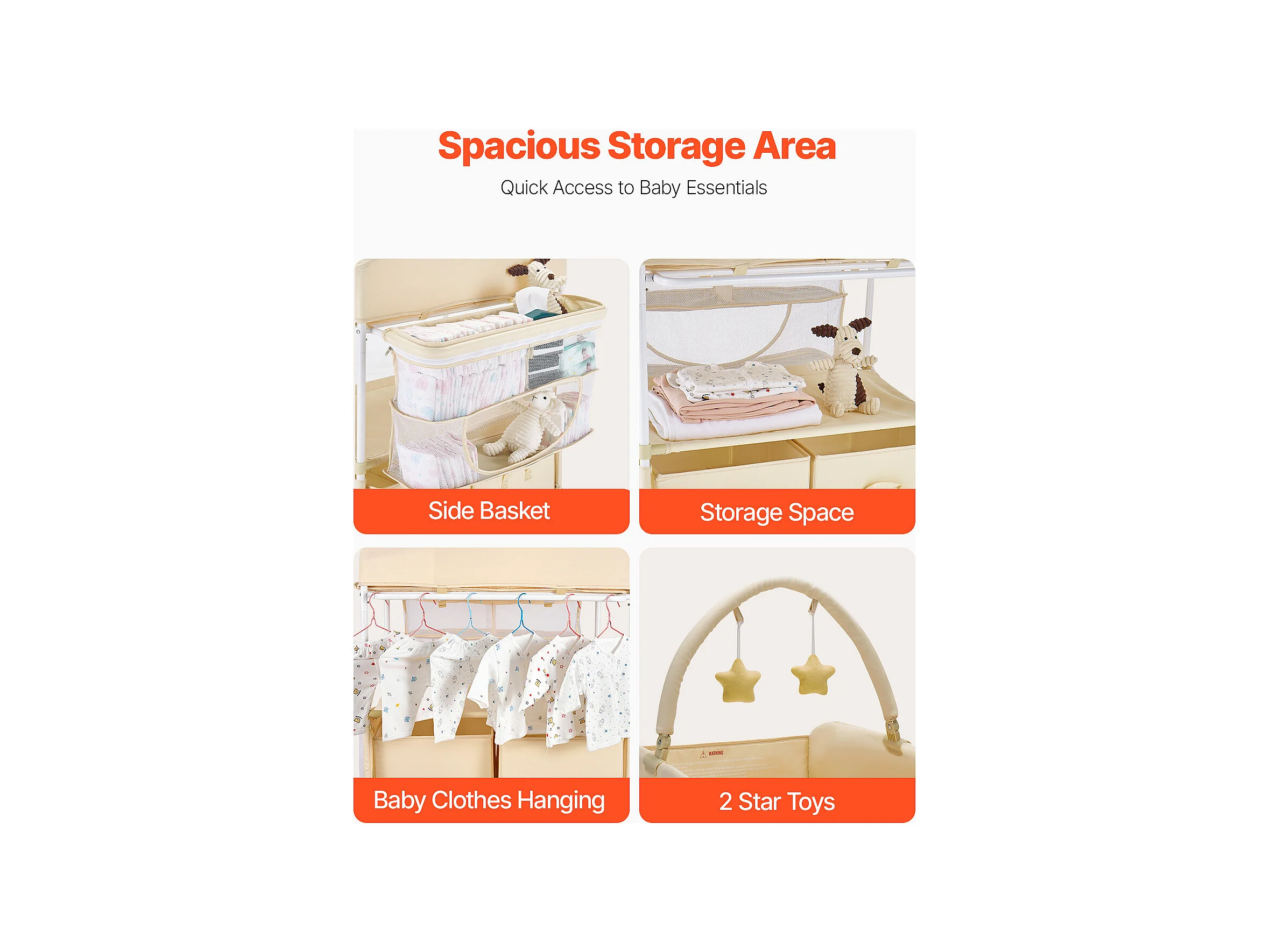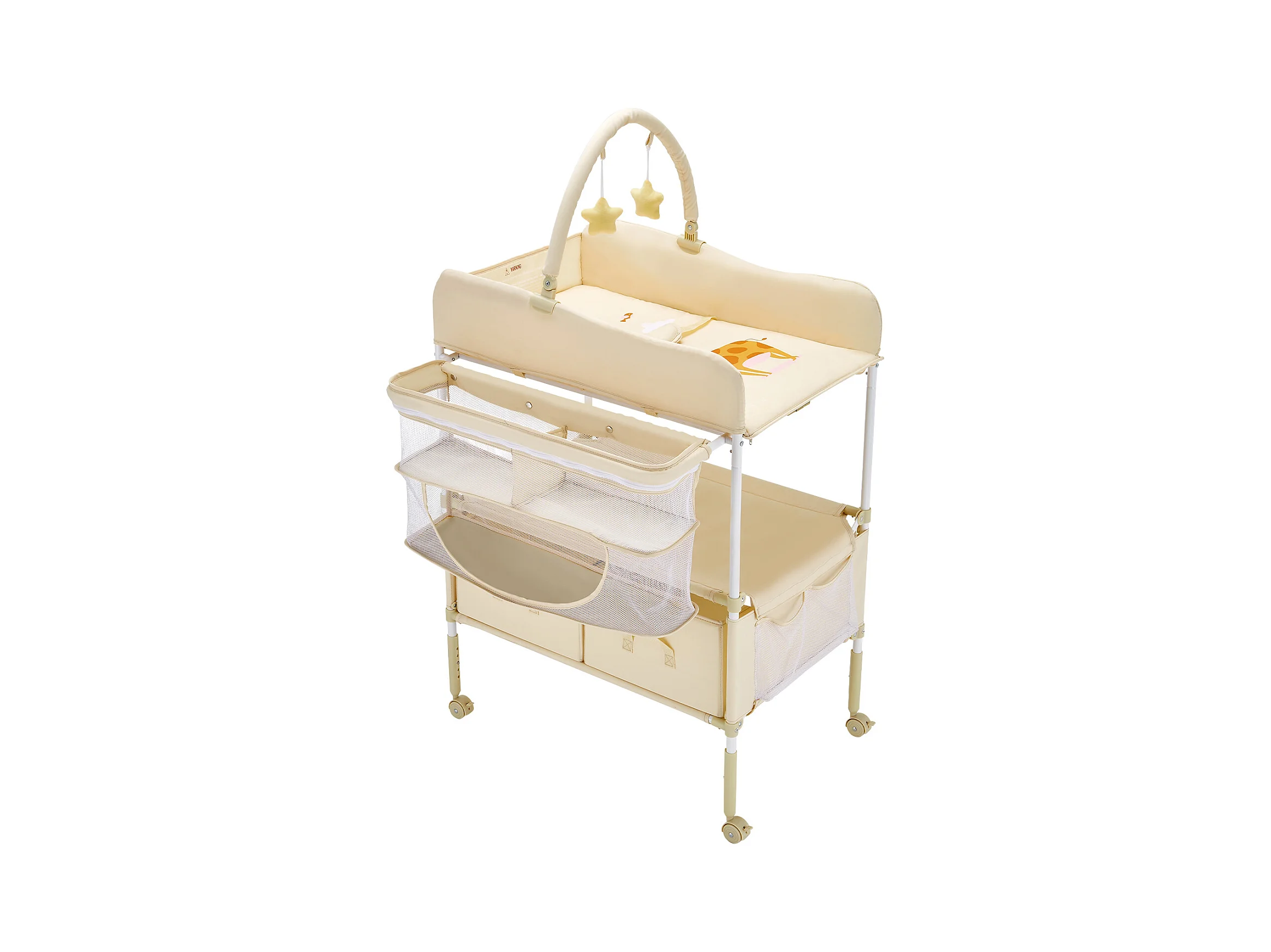Table à Langer Pliable SucceBuy Plan à Langer avec 2 Tiroirs en Tissu, Panier Latéral et Tringle de Suspension, Roulettes Verrouillables et 2 Jouets Étoiles, Beige