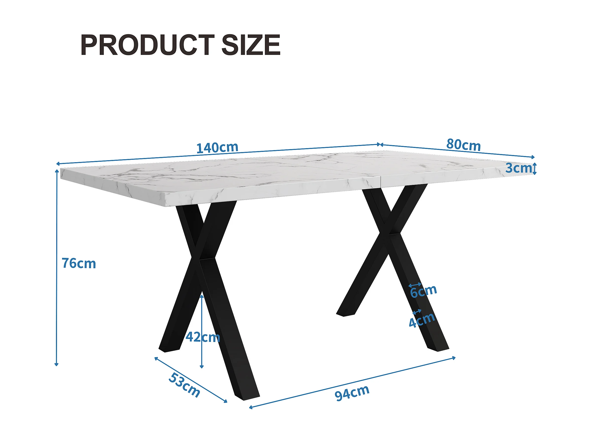 Table à manger 140x80cm avec pieds métal noir - Effet marbre blanche