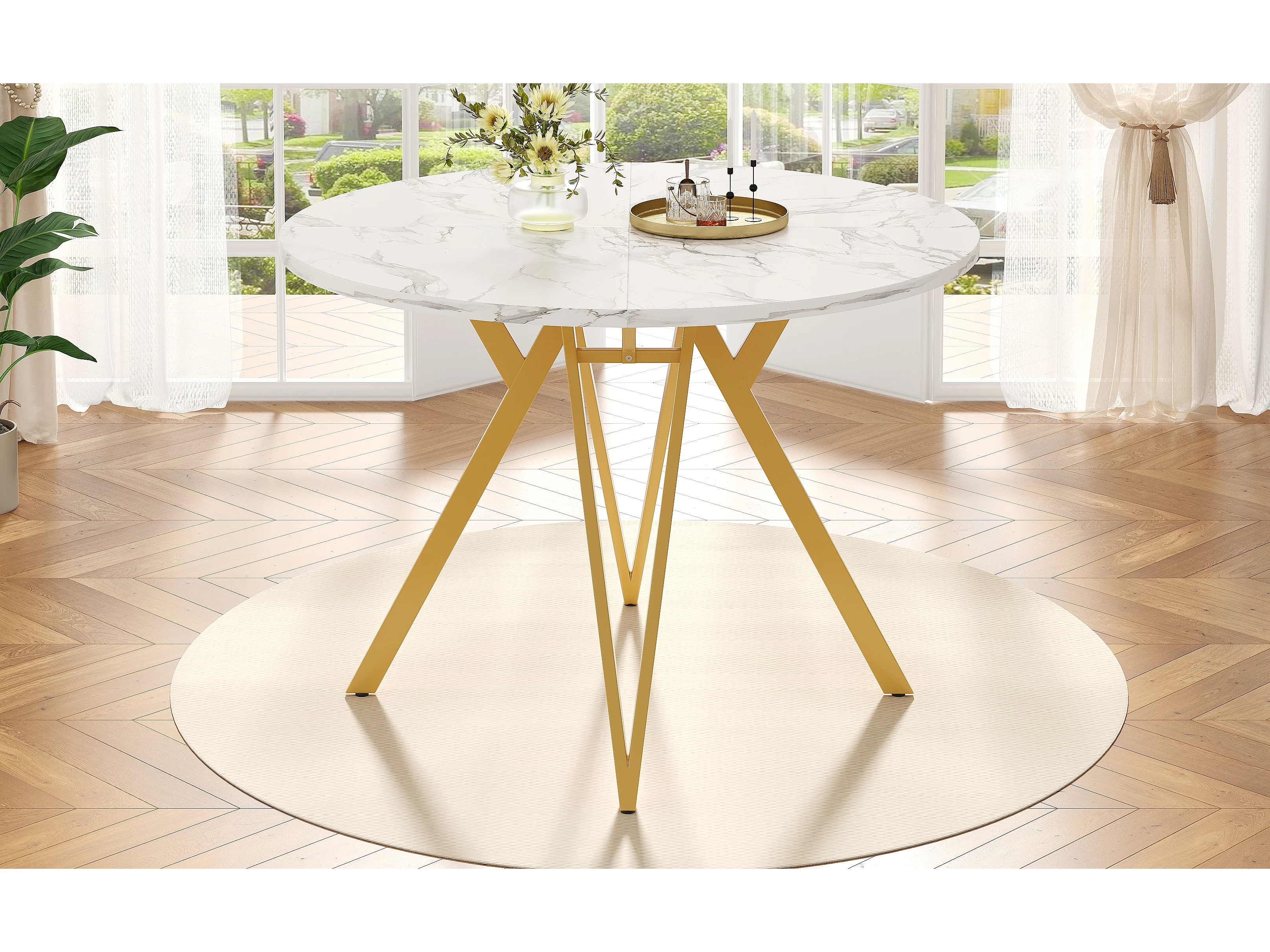 Table à manger ronde 100x100x76 cm, pieds réglables, structure stable, plateau en MDF aspect marbre, doré