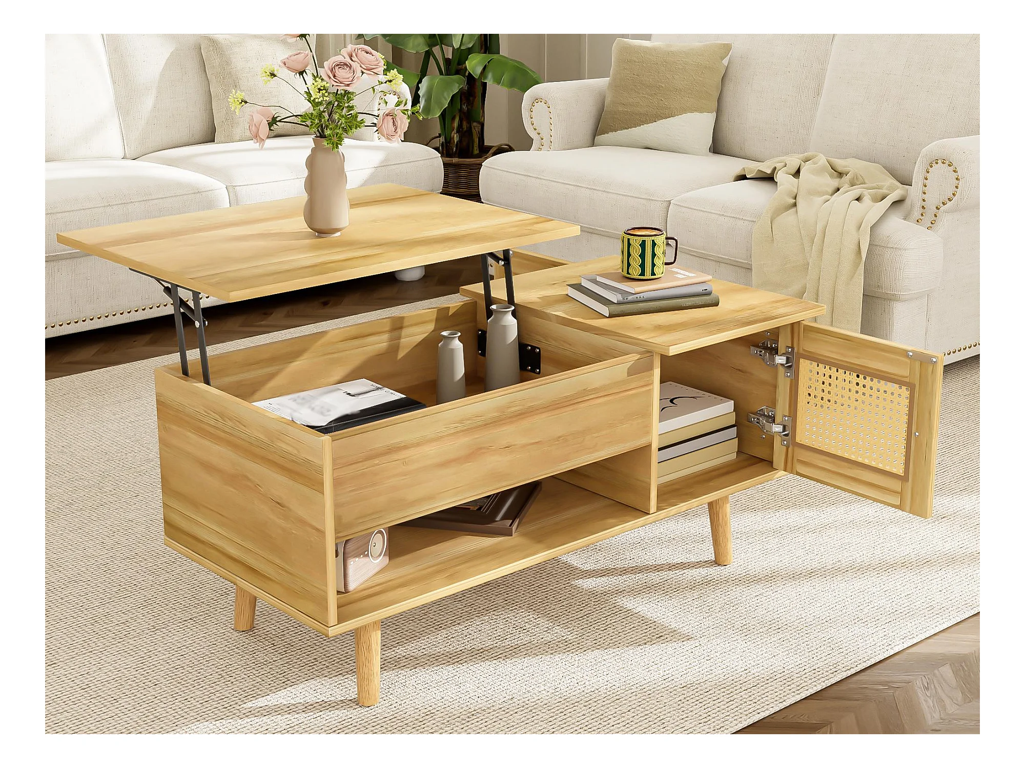 Table basse 103x50x46 cm - avec plateau relevable - avec 2 portes en rotin - naturel