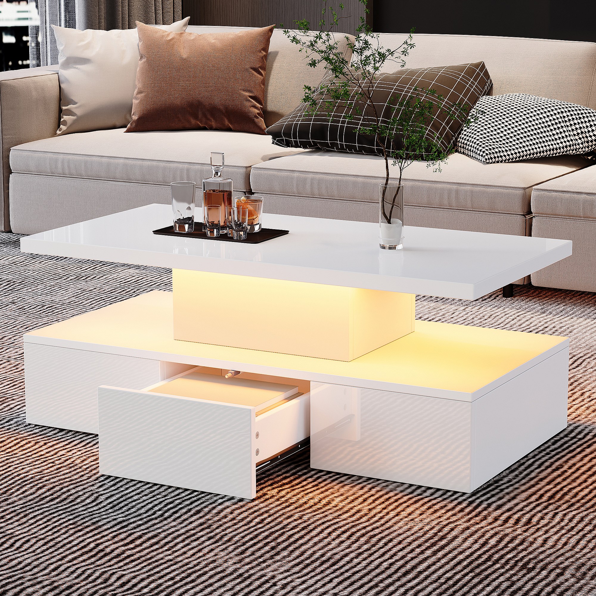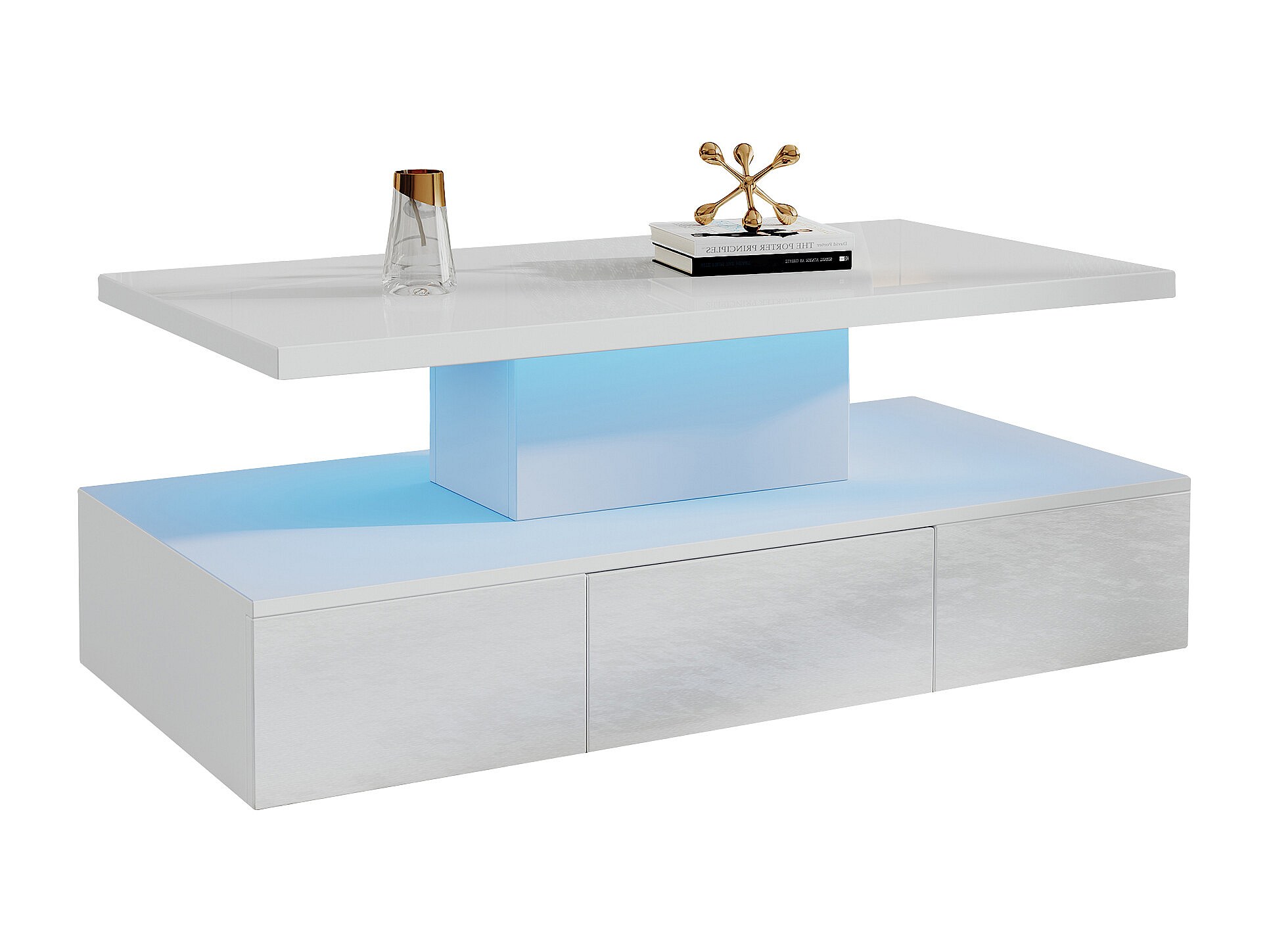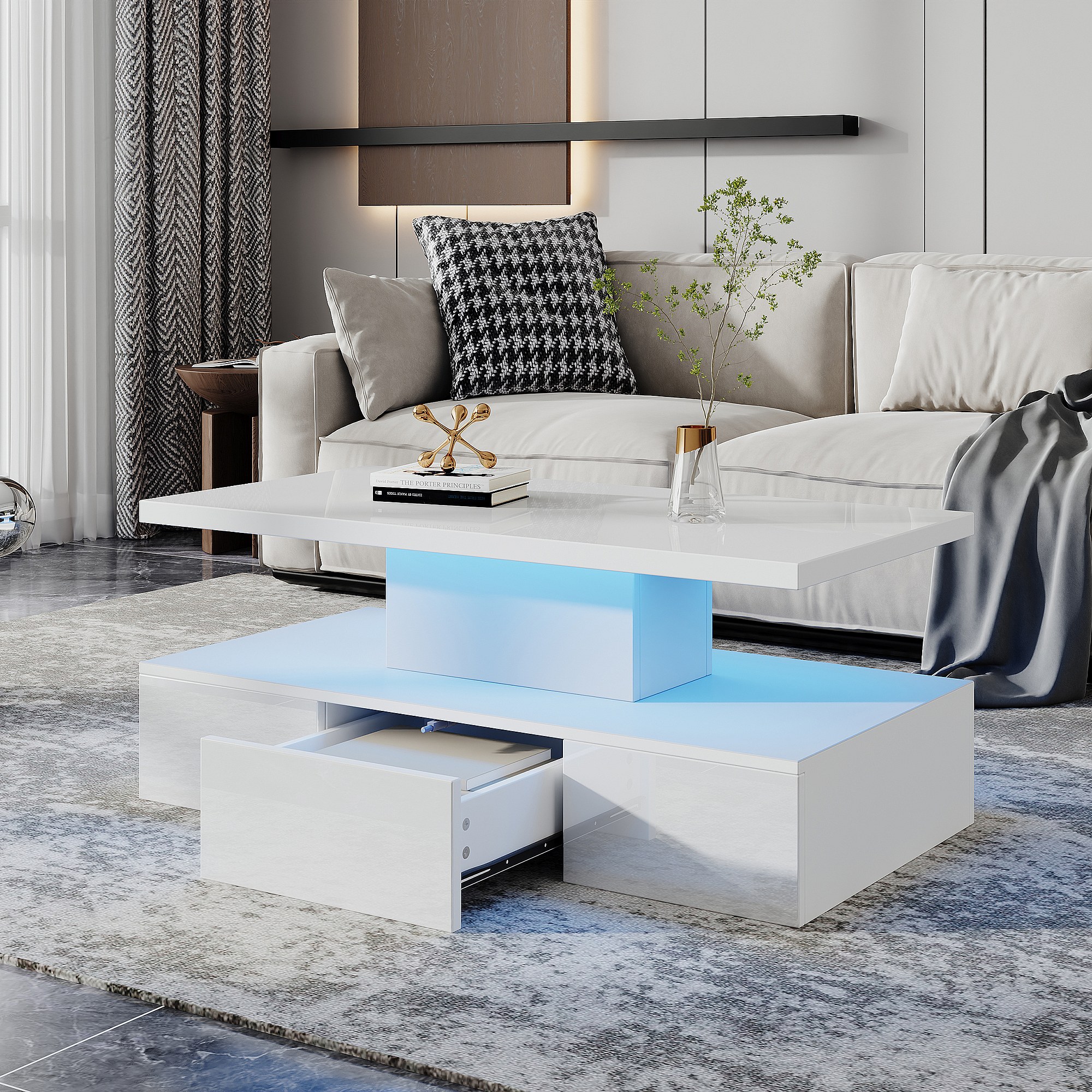 Table basse brillante à 2 niveaux avec Leds + étagère ouverte + 1 tiroir coulissant - 100 x 50 x 39 cm - aggloméré - blanc