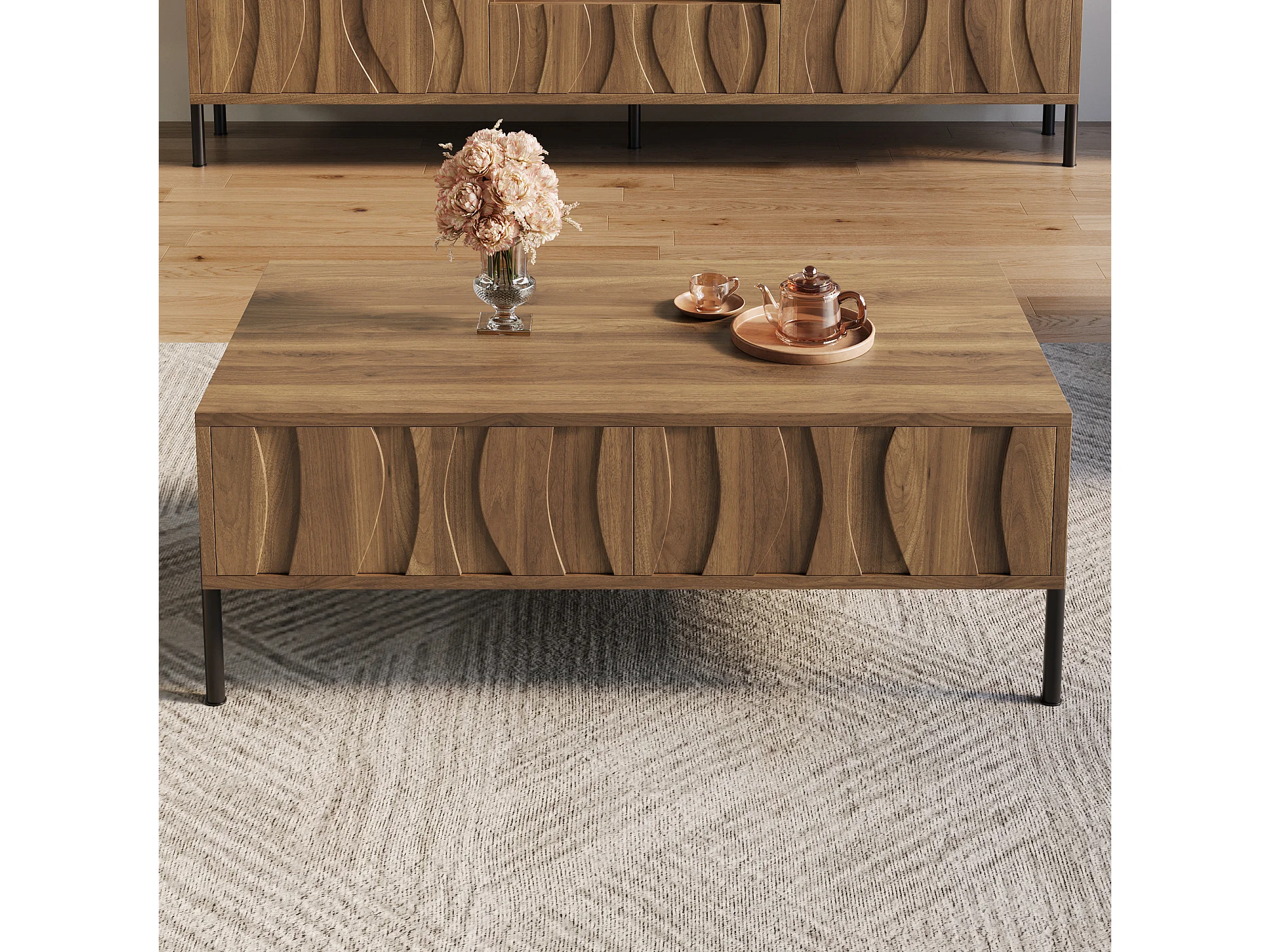 Table basse en bois texturé, pieds noirs 55,5x45x53cm