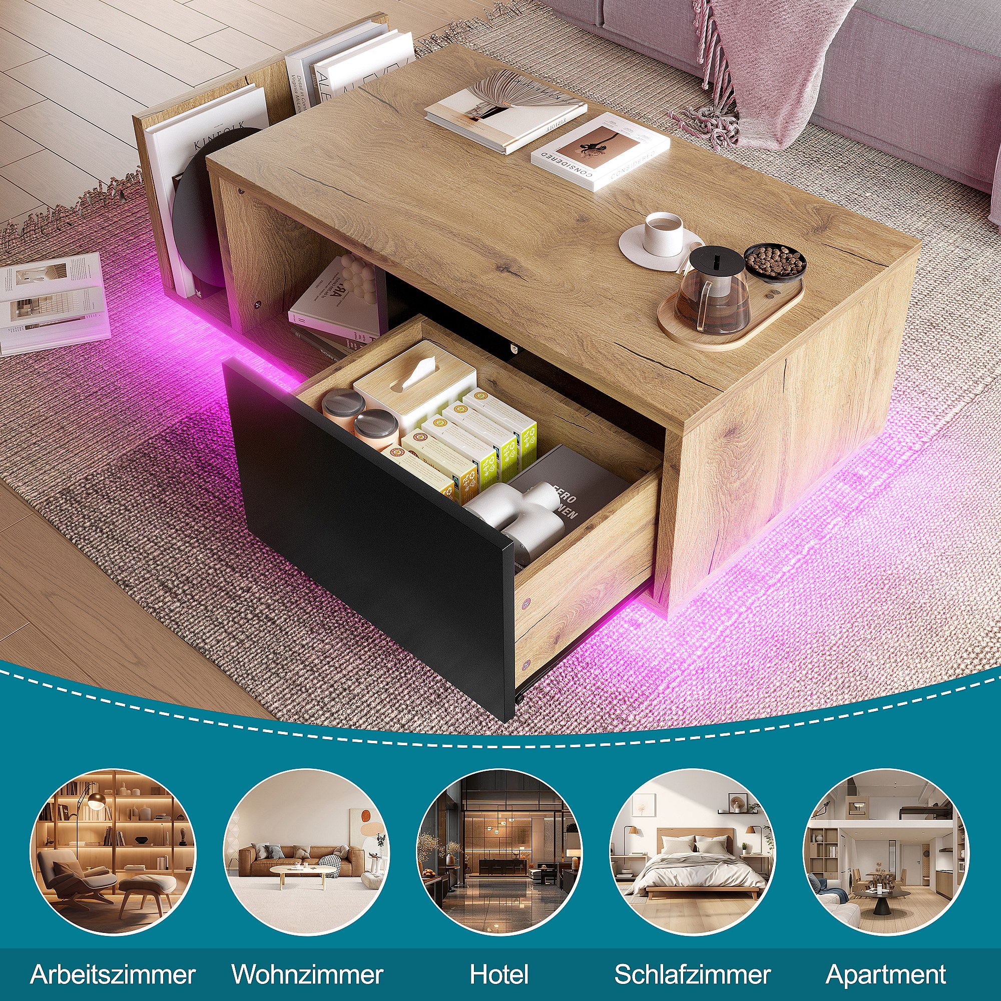Table basse relevable avec Leds - 103.5 x 50 x 27.5 cm - avec 1 tiroir + compartiments - bois - naturel