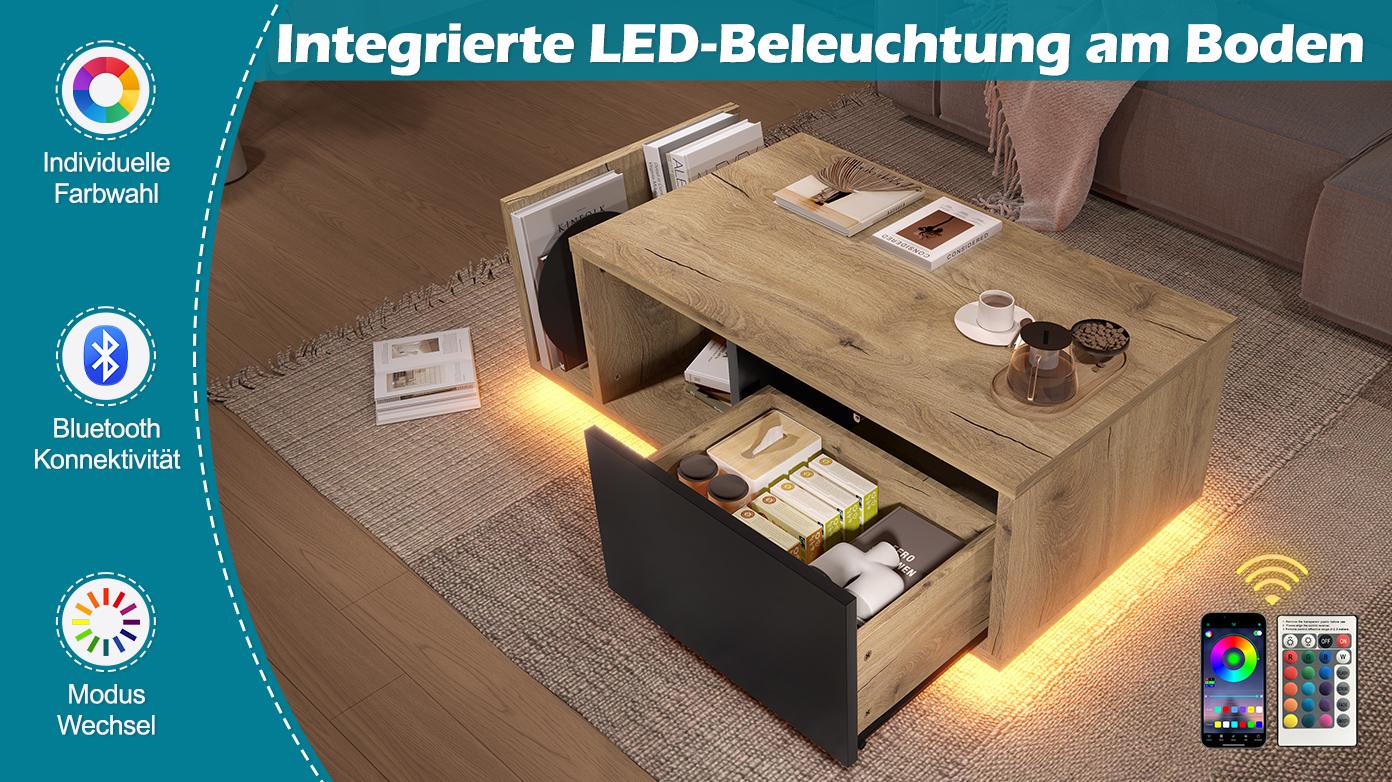 Table basse en bois - 99.5 x 53 x 38 cm - avec 1 tiroir + étagère + Leds - bois - naturel