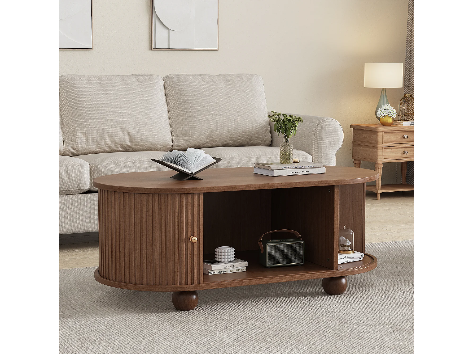 Table basse en bois de noyer 100×50×40 cm, multifonction avec espace de rangement, porte coulissante 360° et 4 pieds, gain de place.