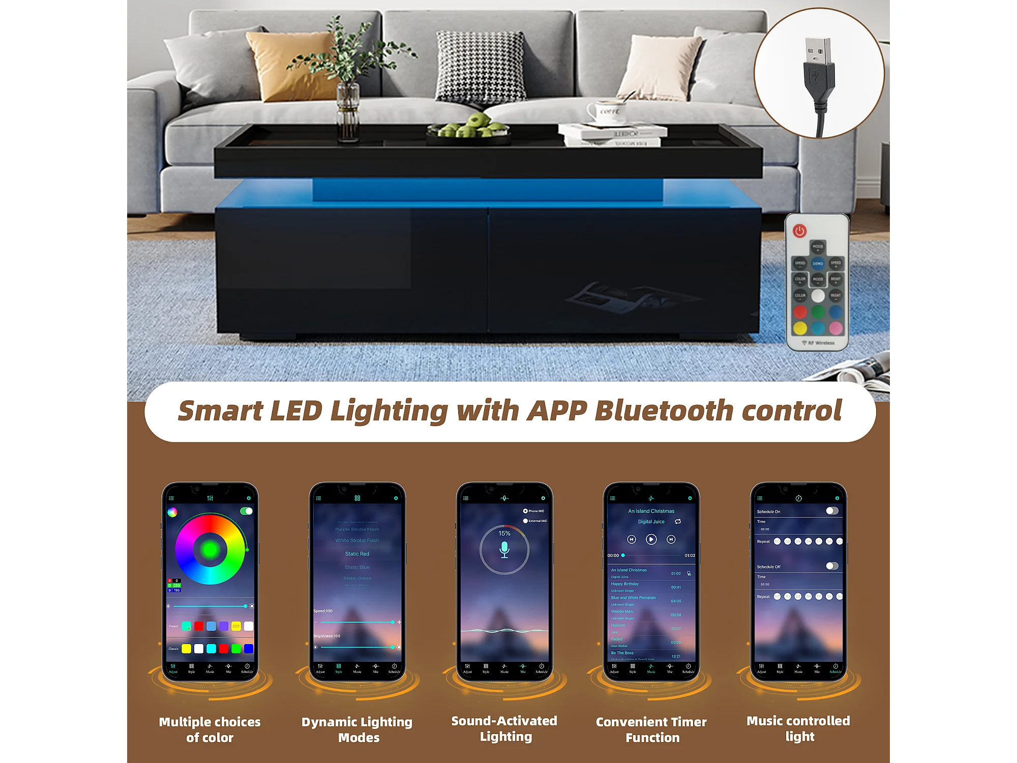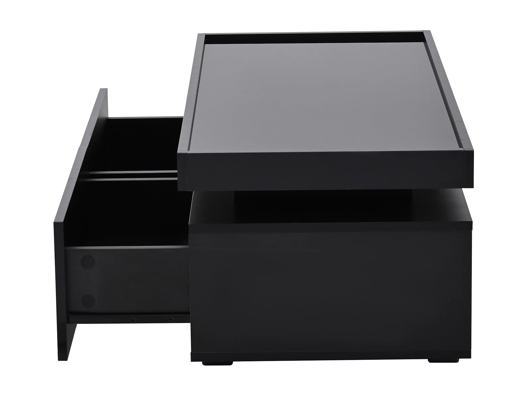 Table basse haute brillance 95x45x35 cm - avec éclairage LED - avec 2 tiroirs - Panneaux de particules - Noir