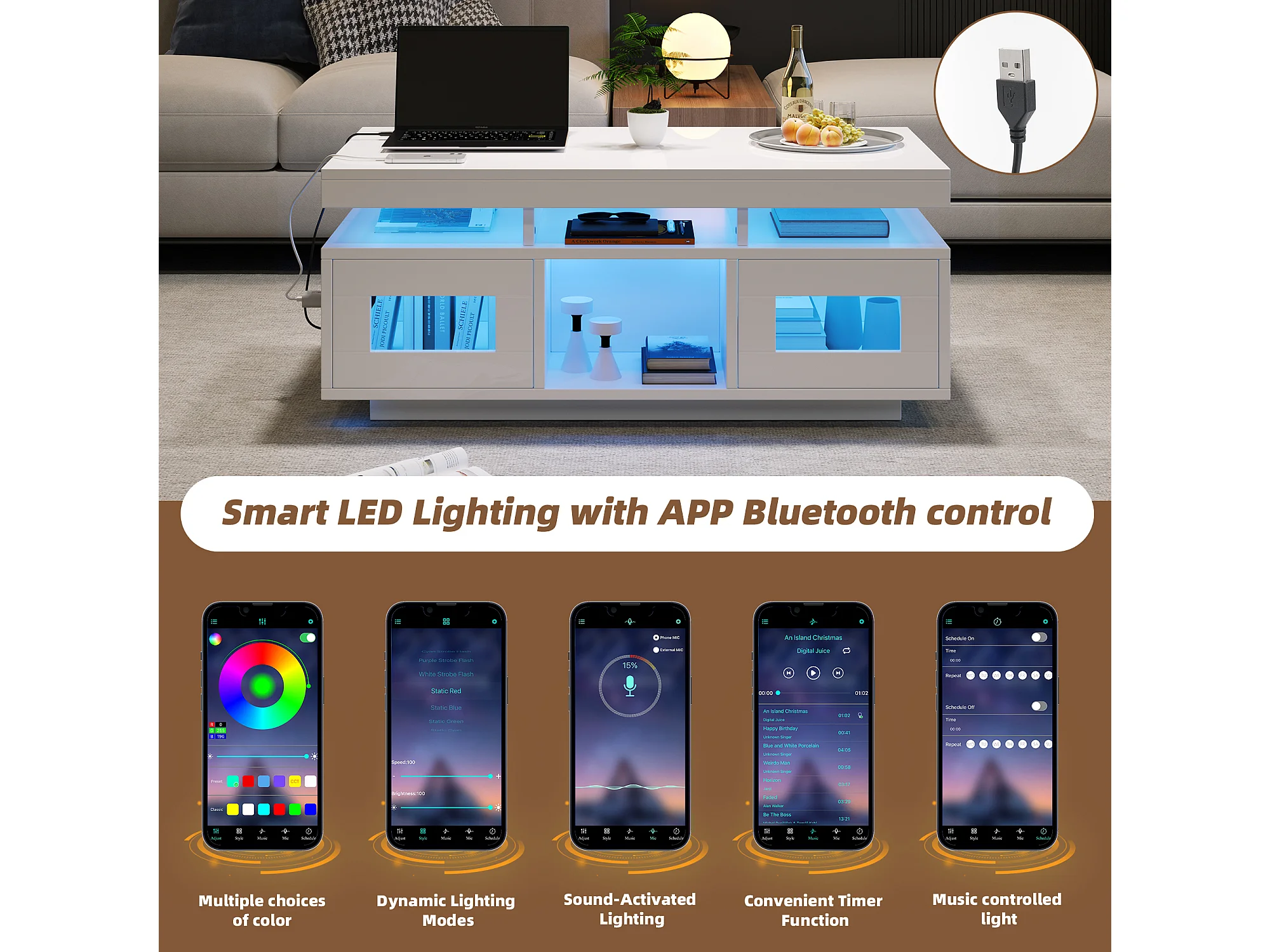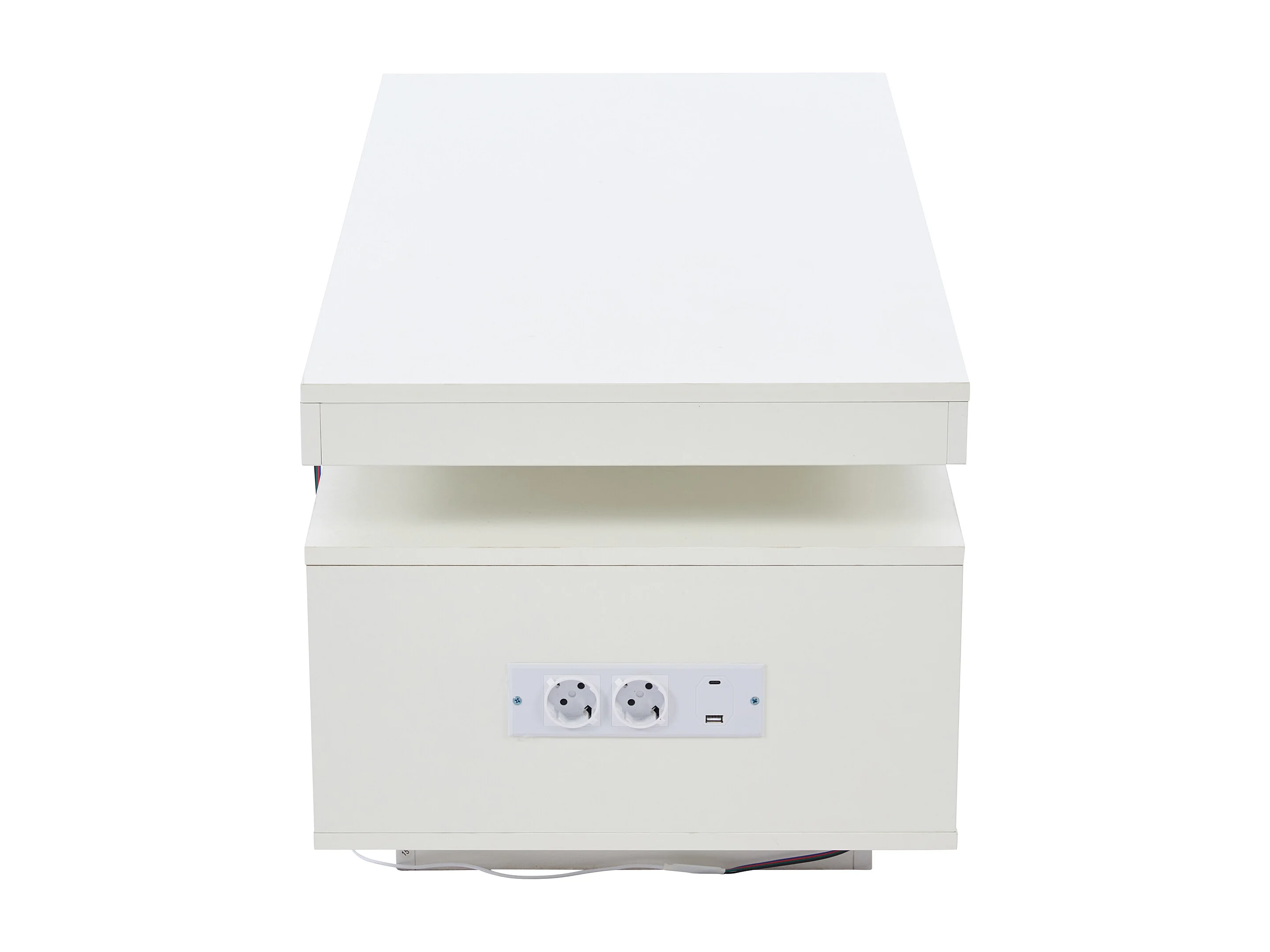 Table basse haute brillance, avec LED, Panneau de Particules + Verre Trempé, 100 x 50 x 43 cm, Blanc