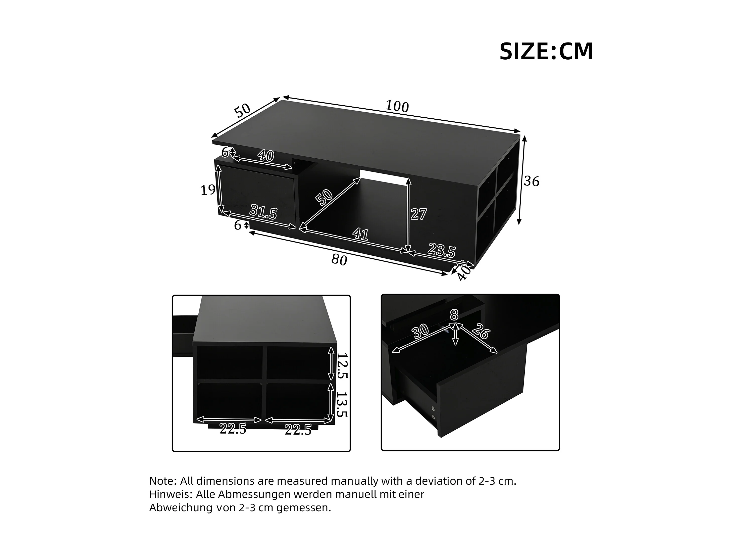 Table basse laquée - 100 x 50 x 36 cm - avec tiroir + Leds + 4 compartiments de rangement - aggloméré - noir