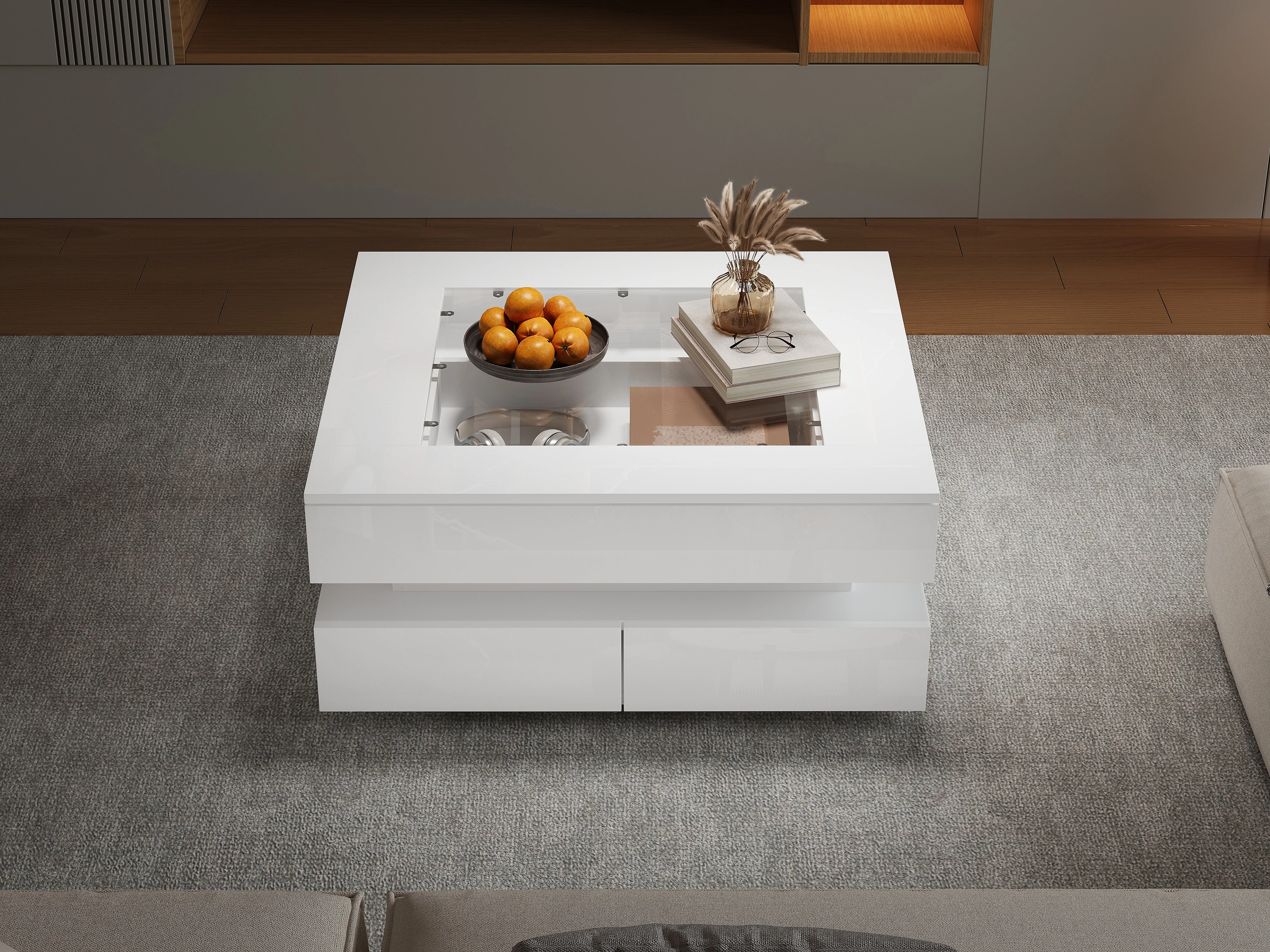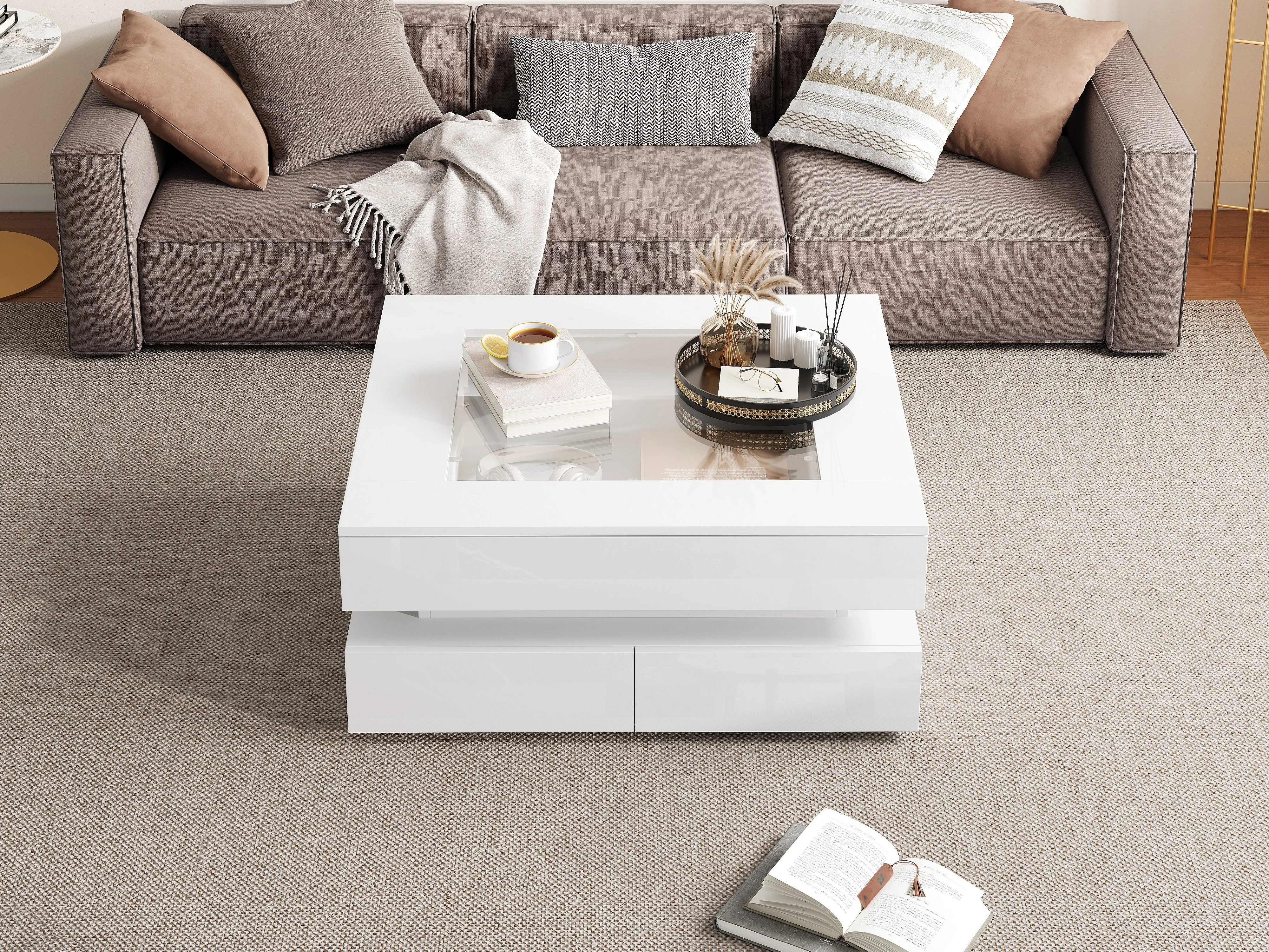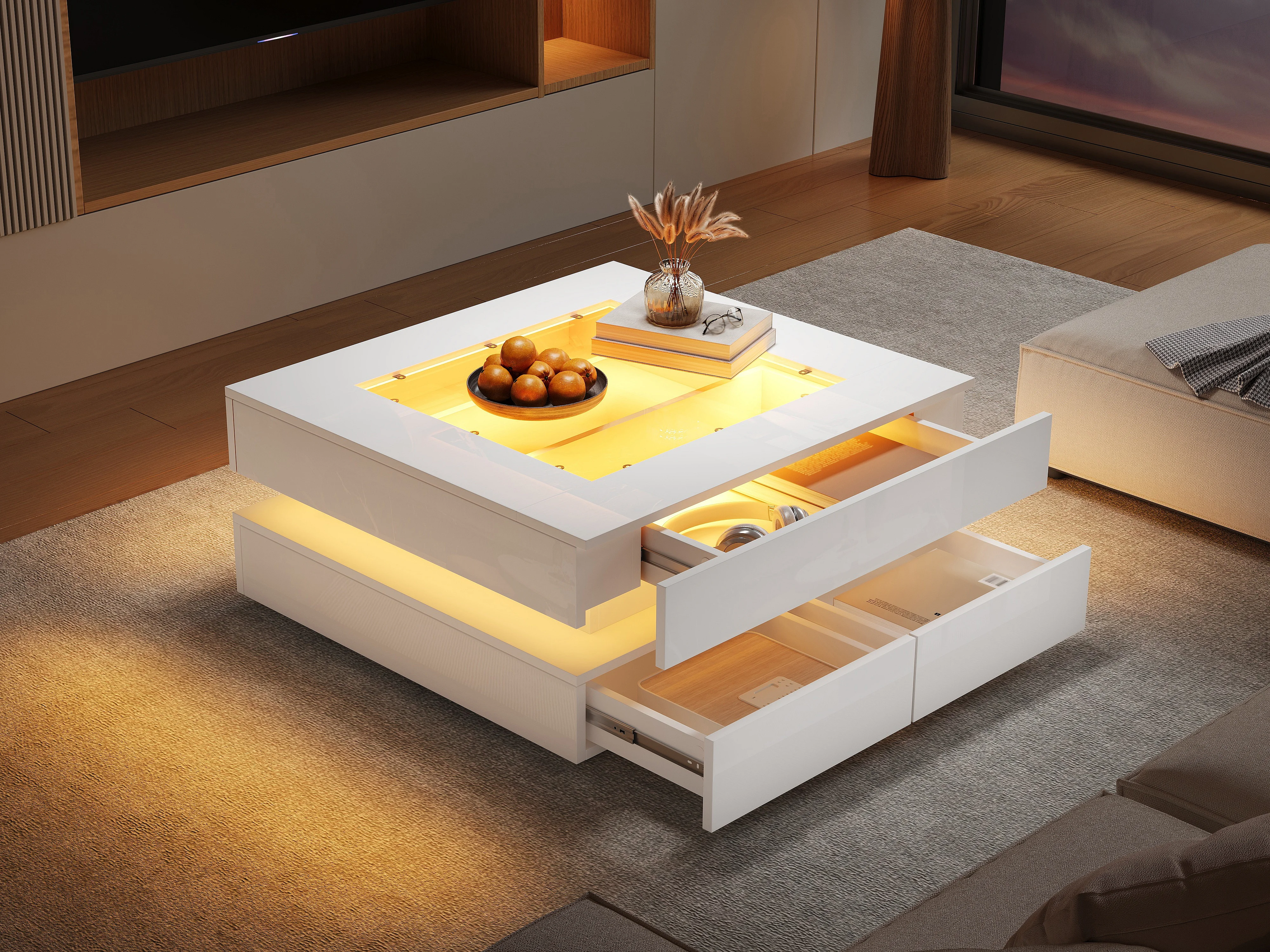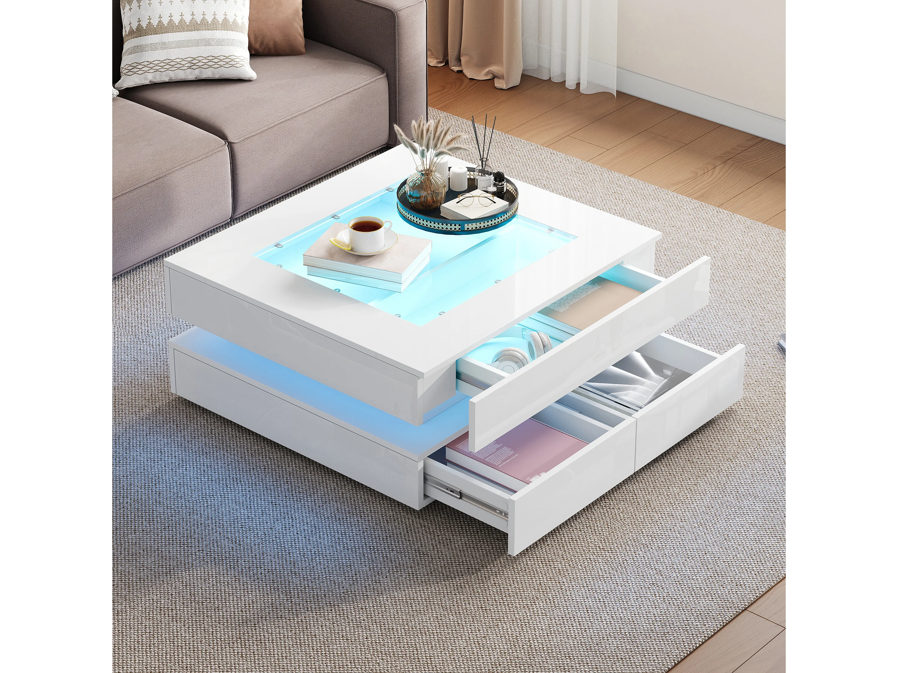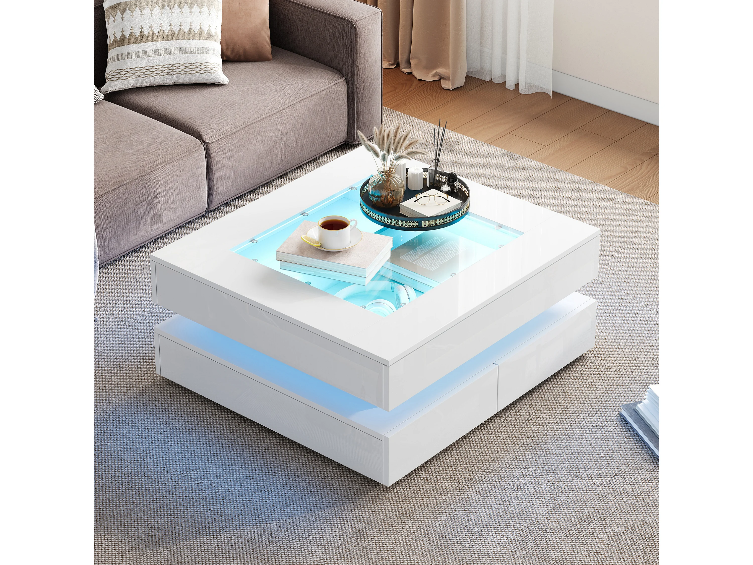 Table basse laquée brillante - 70 x 70 x 35 cm - avec plateau en verre + 3 tiroirs + Leds - verre + aggloméré - blanc