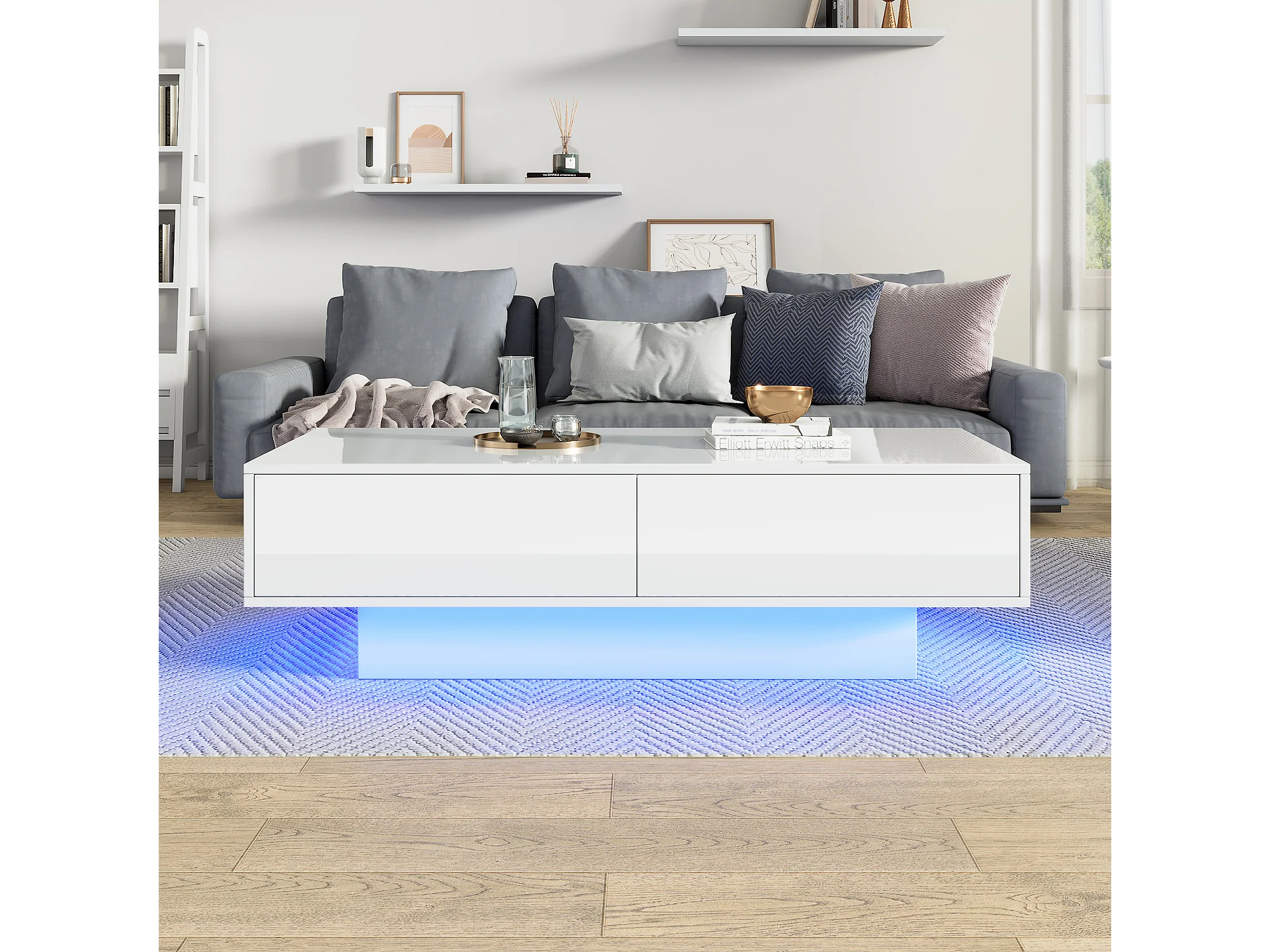 Table basse moderne blanche à haute brillance 115 x 55 x 34 cm : Avec 2 tiroirs, éclairage LED et 30 kg de charge, table basse élégante pour salon