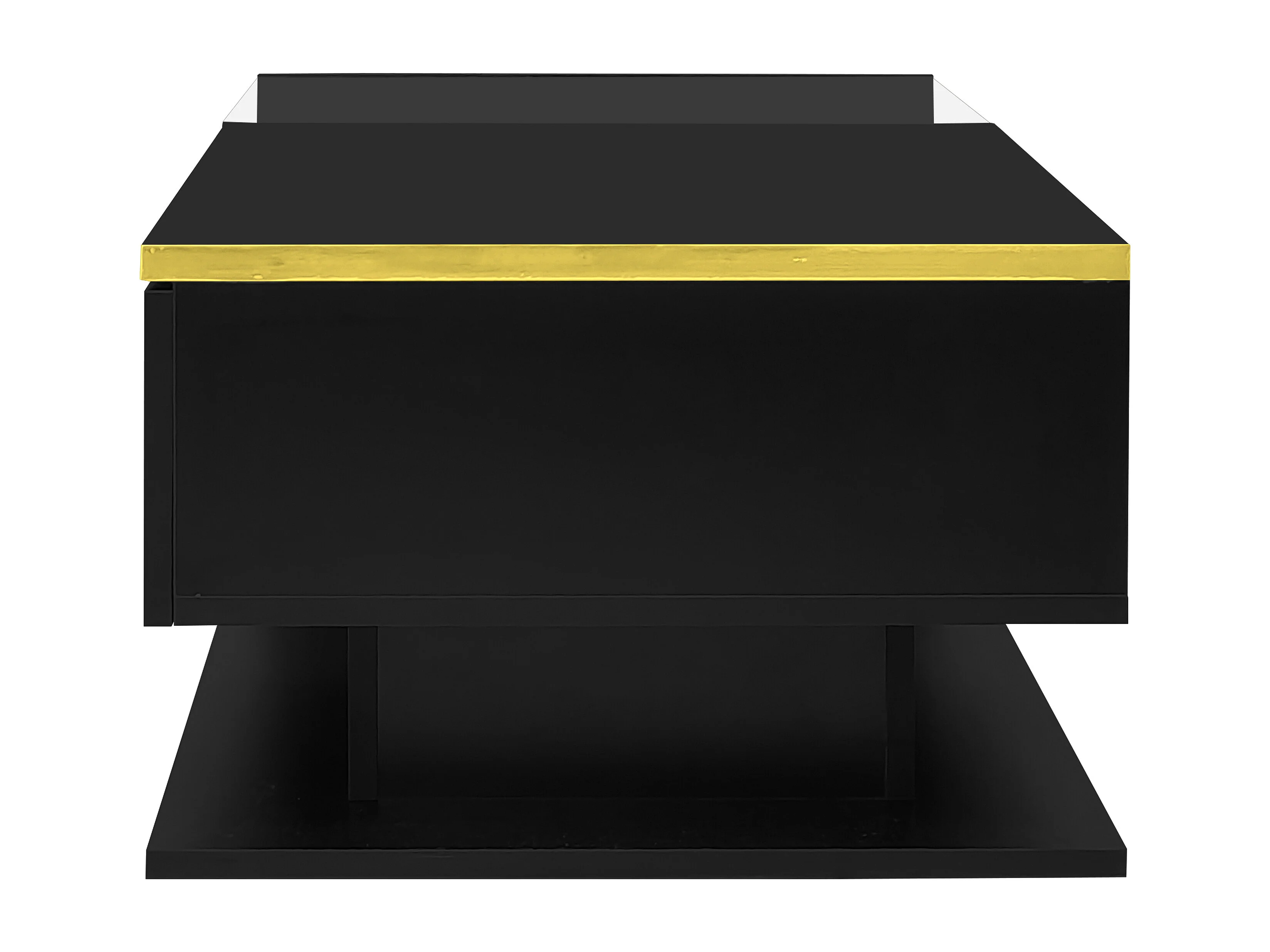 Table basse rectangle 90x50x32.5cm avec compartiment de rangement, corps en noir et plateau en verre, LED inclus