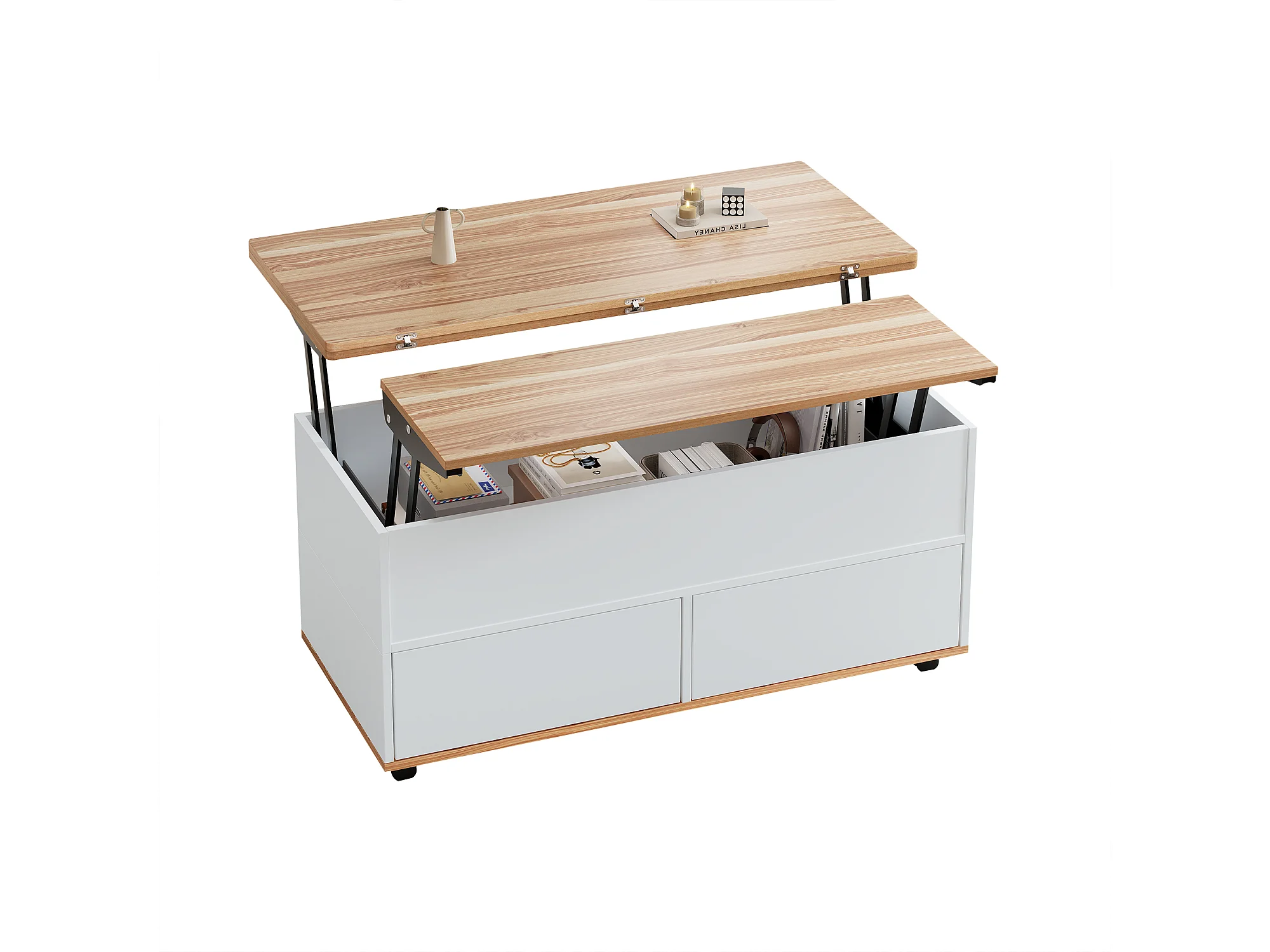 Table basse relevable à roulettes - 100 x 98 x 65 cm - avec rangement + étagère + tiroirs - aggloméré - blanc + naturel