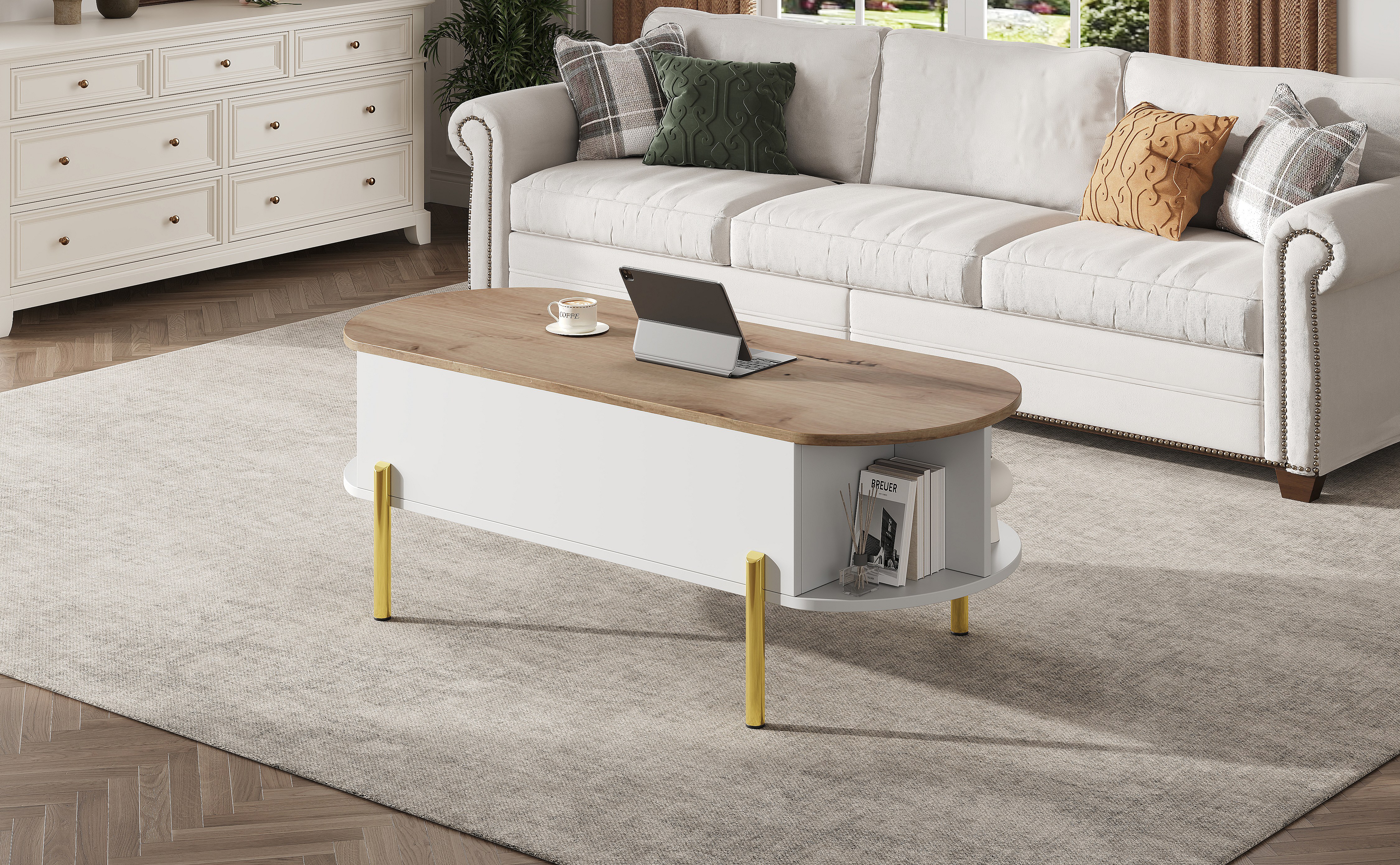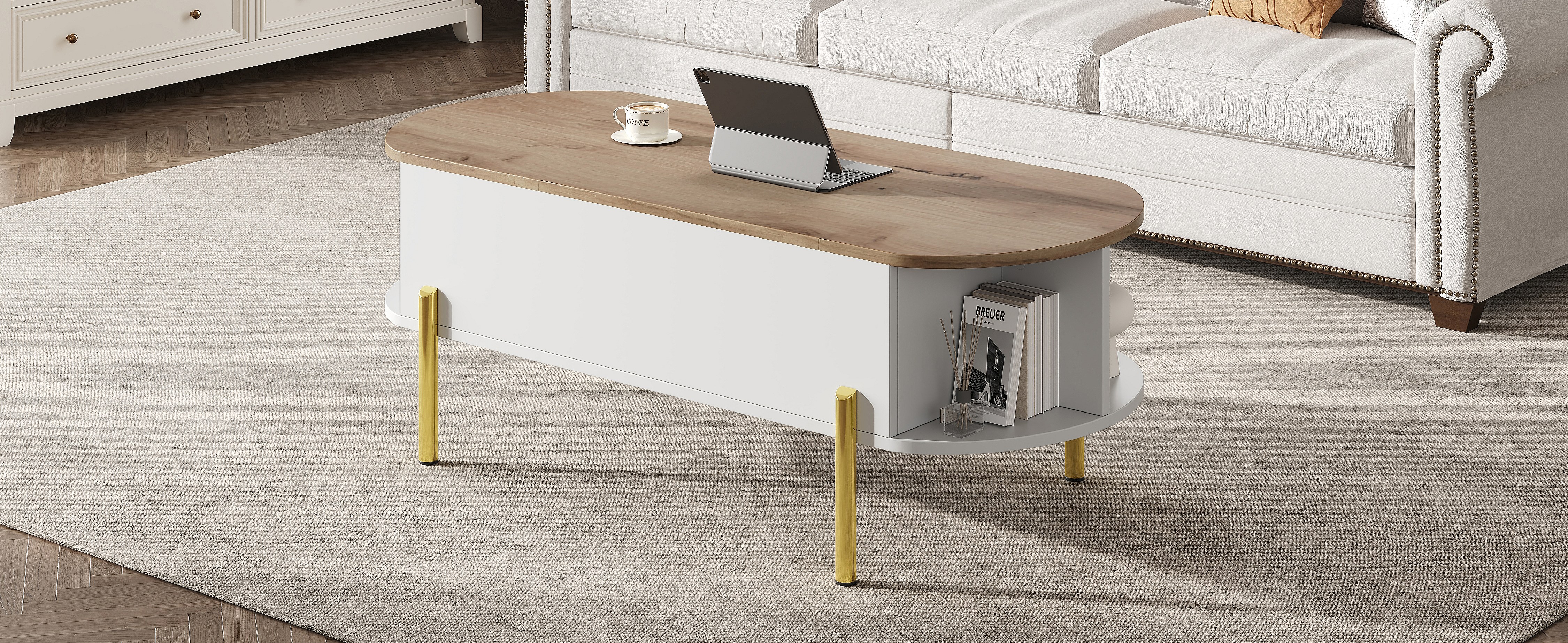 Table basse relevable avec 4 roulettes - 100 x 50 x 52 cm - avec 4 tiroirs - aggloméré - blanc + naturel