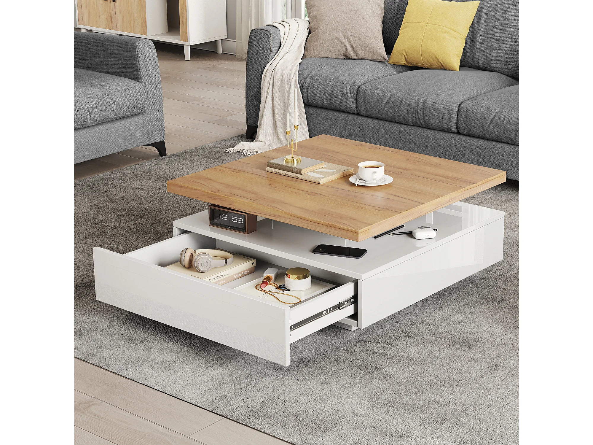Table basse carrée rotative à 360° - 70x70x36 cm - avec 1 tiroir - Blanc & Naturel
