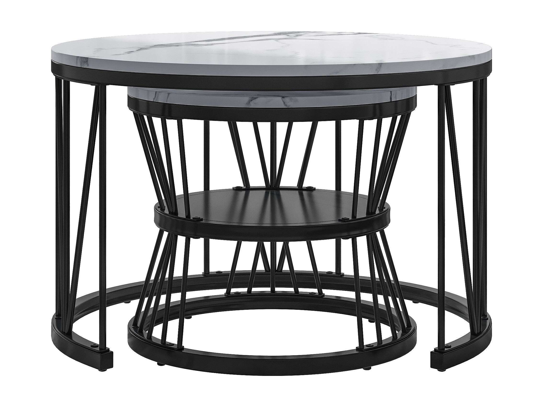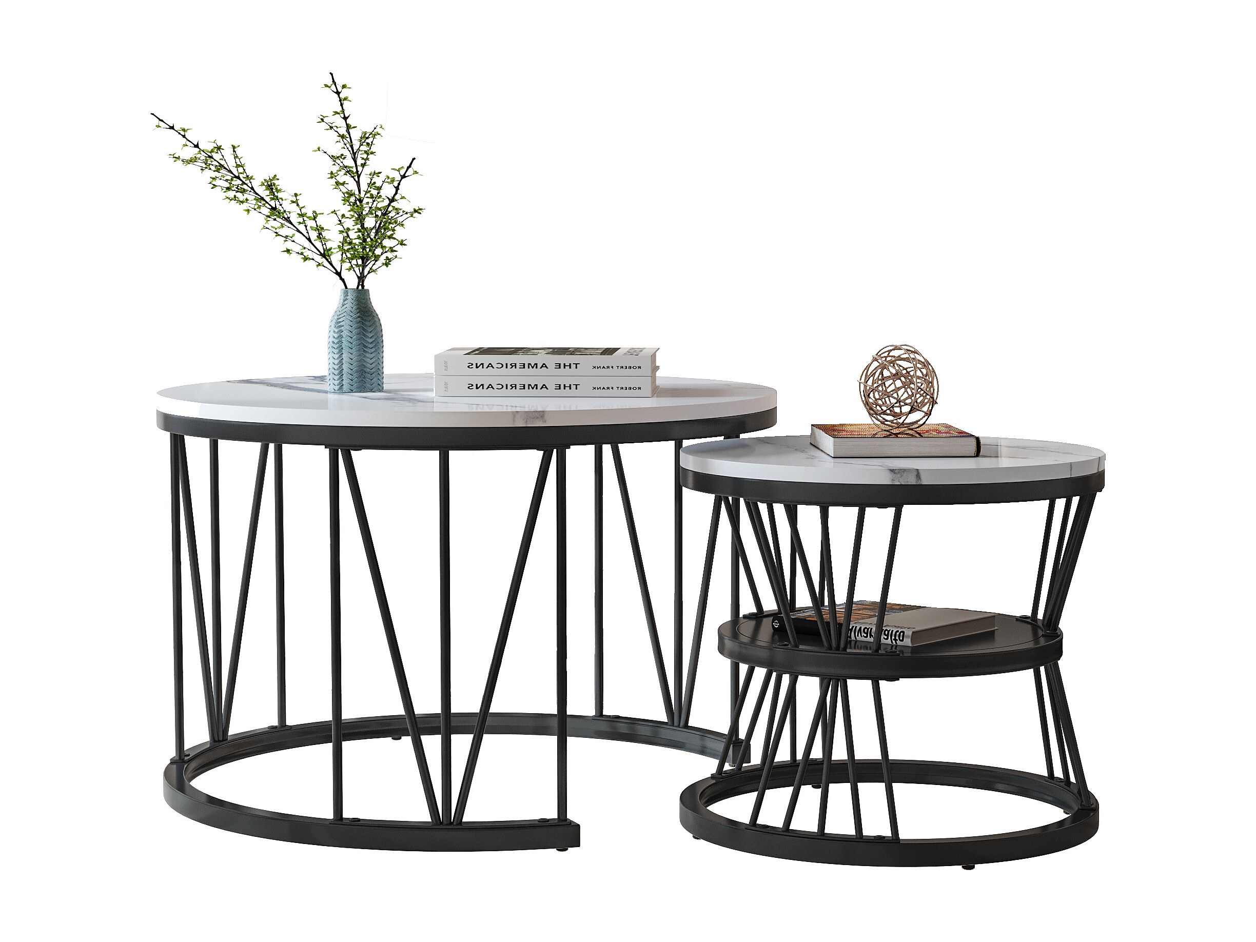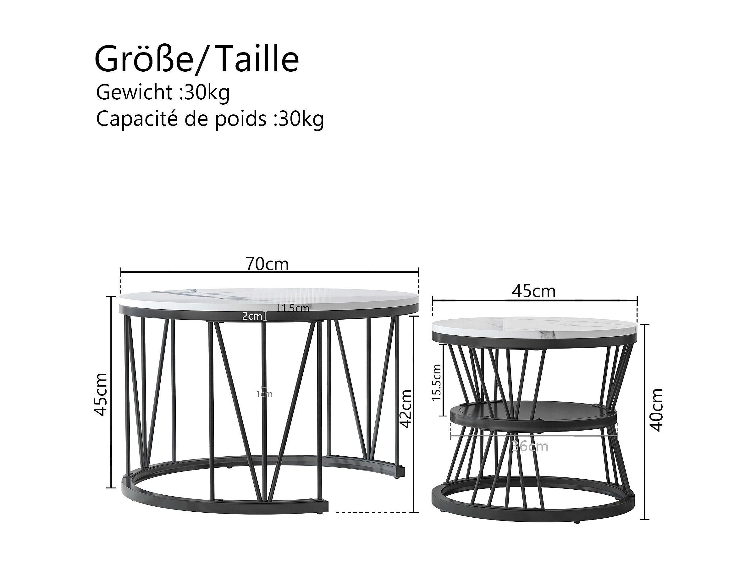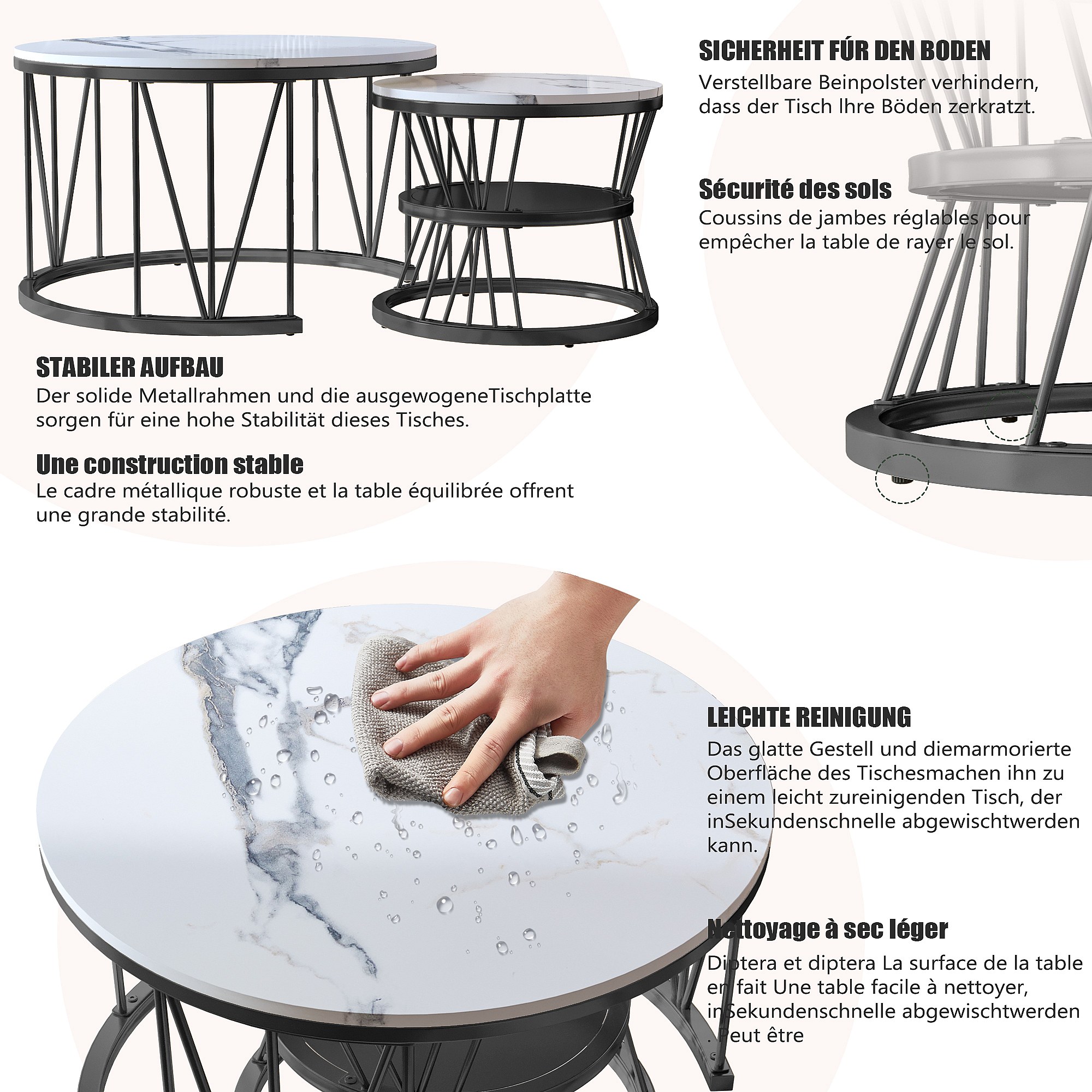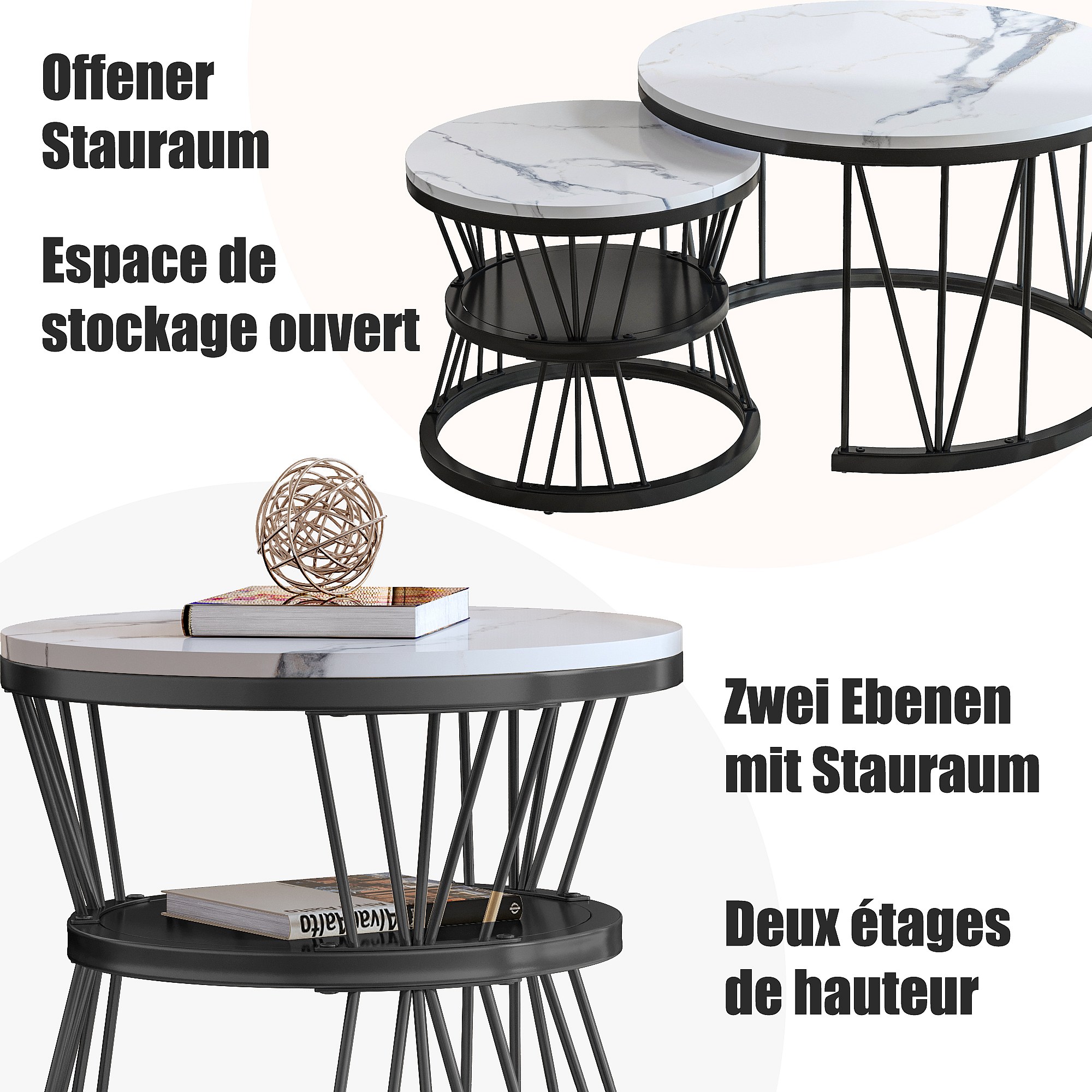 Table Basse Salon Gigogne, Placage en Marbre, Structure en Métal, Noir et Blanc