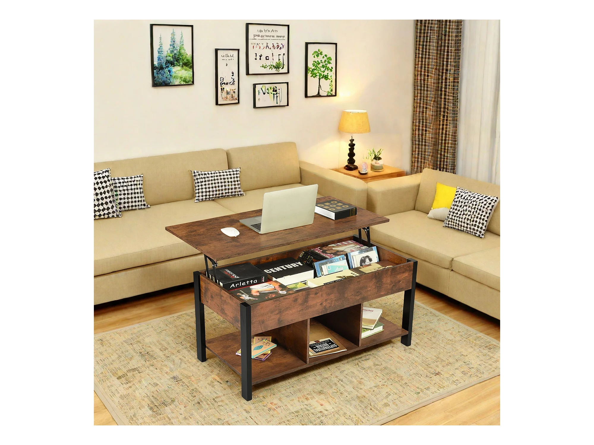 Table Basse Plateau Relevable Marron Rustique Noir 48 x 100 cm - Rangement Ouvert et Caché, Style Industriel