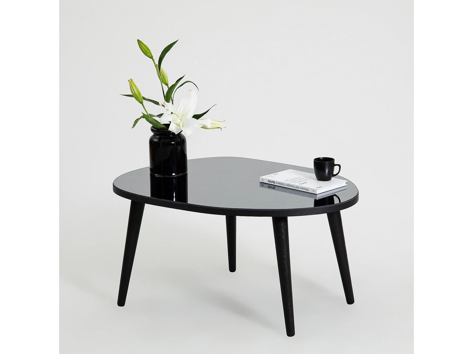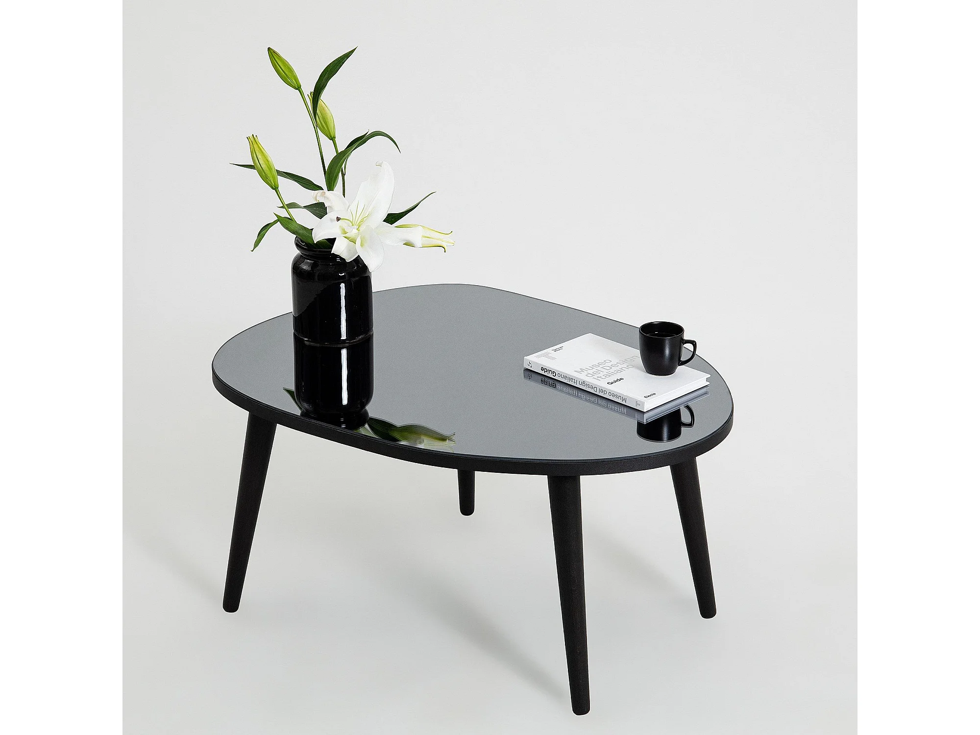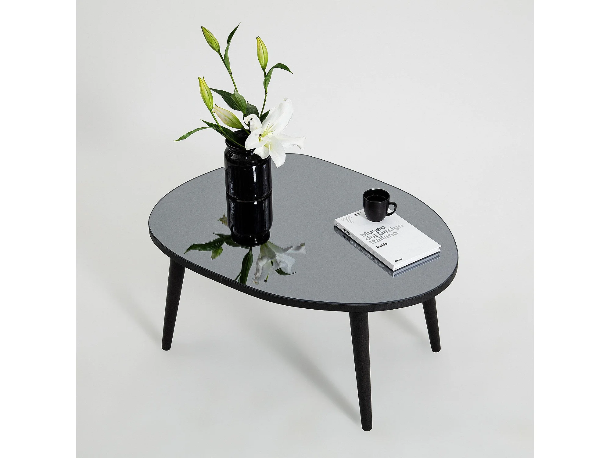 Table basse trépied ovale Casina 55x75cm Bois Noir et Verre trompé Miroir fumé