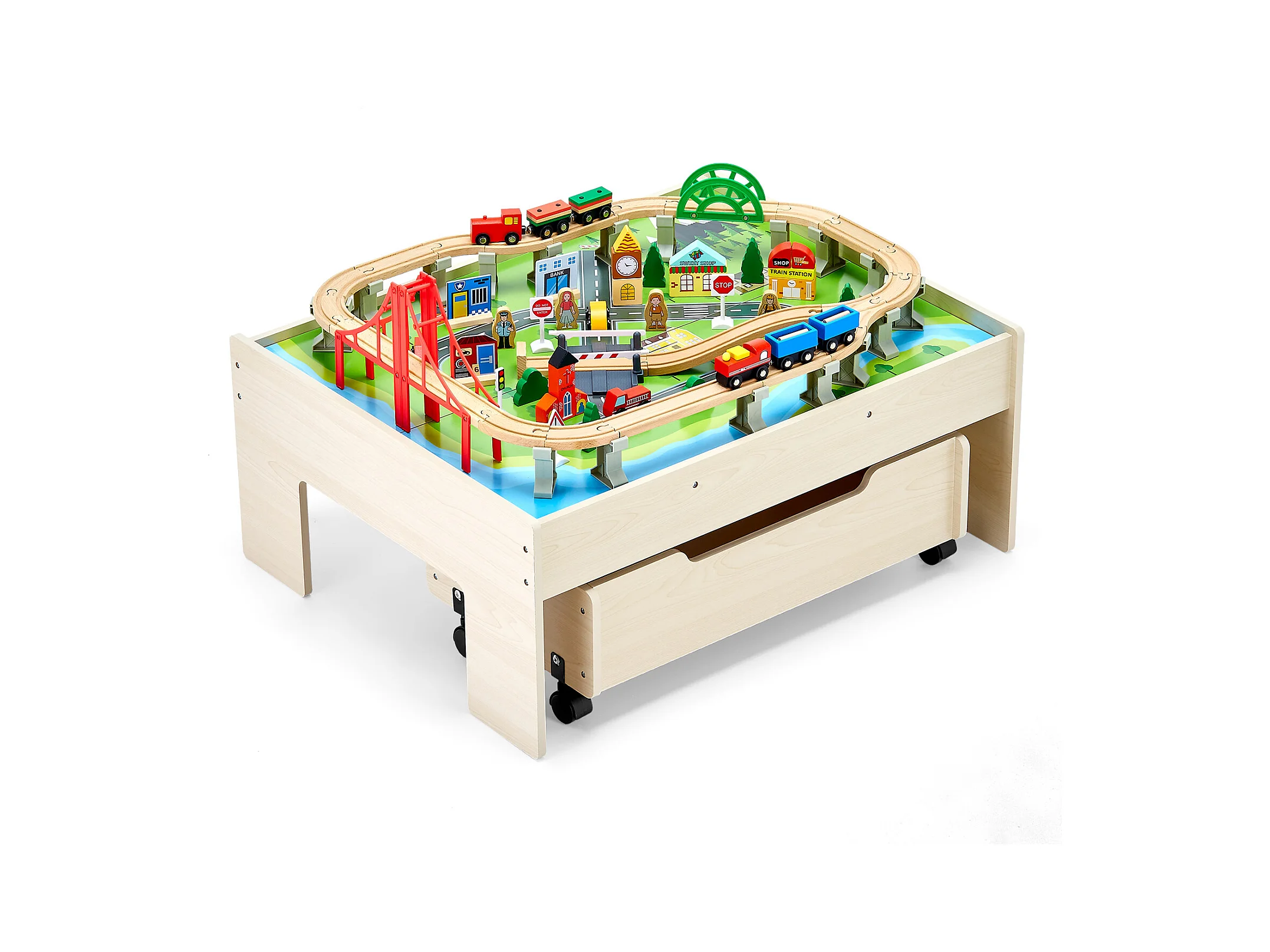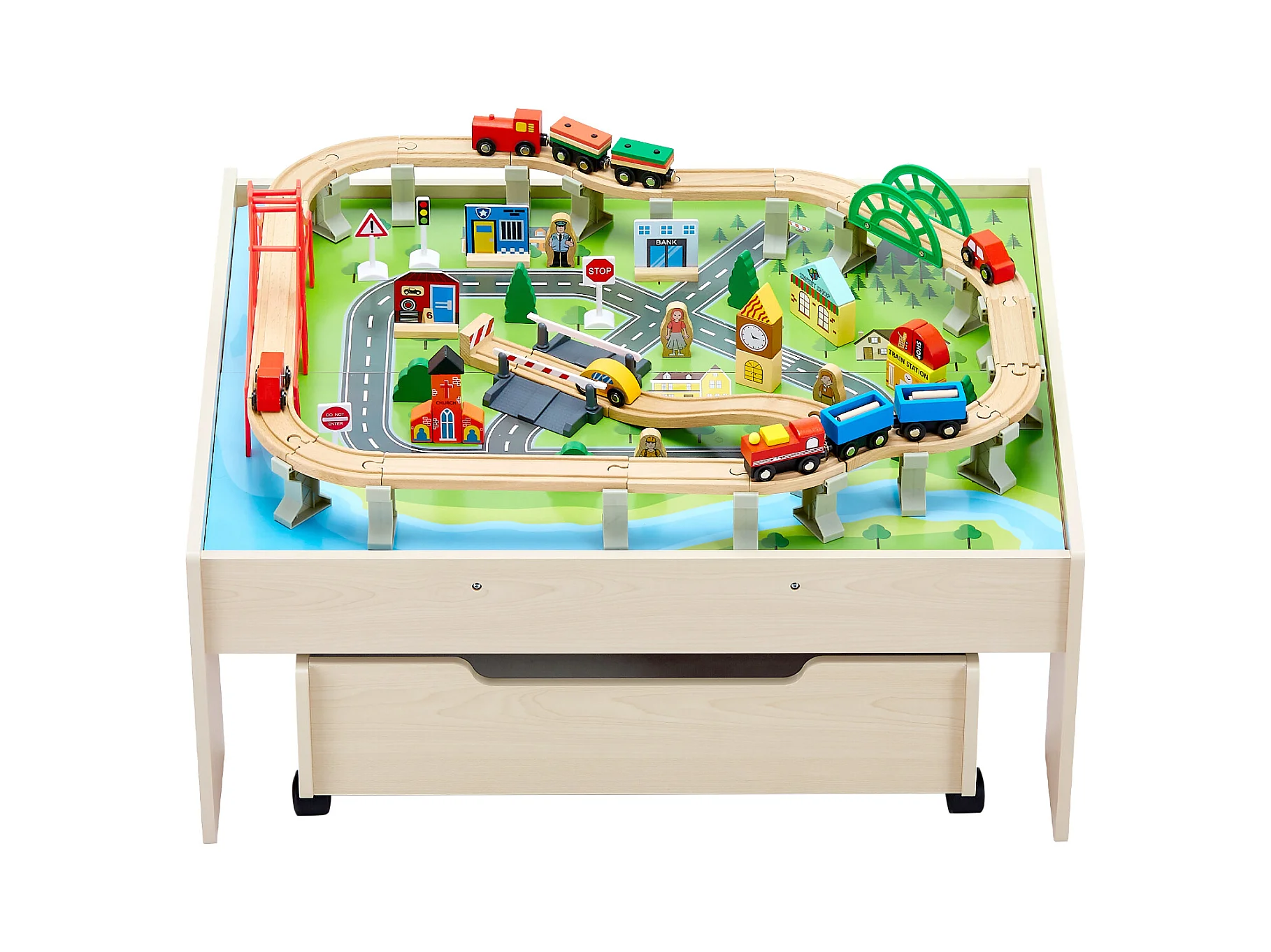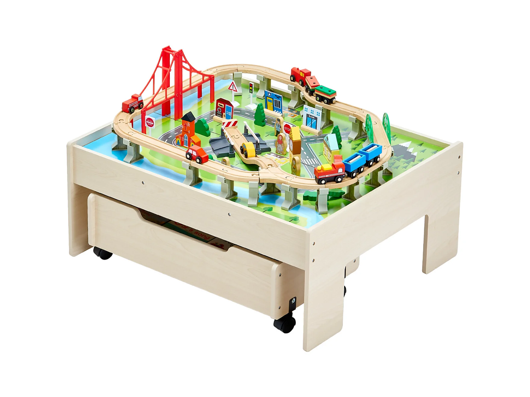 Table Circuit Train Bois SucceBuy, 100 PCS, avec Rail de Train, Table d'Activités 3 en 1 Double Face pour Jouer, Jouets Créatifs pour Enfants 3 Ans et Plus