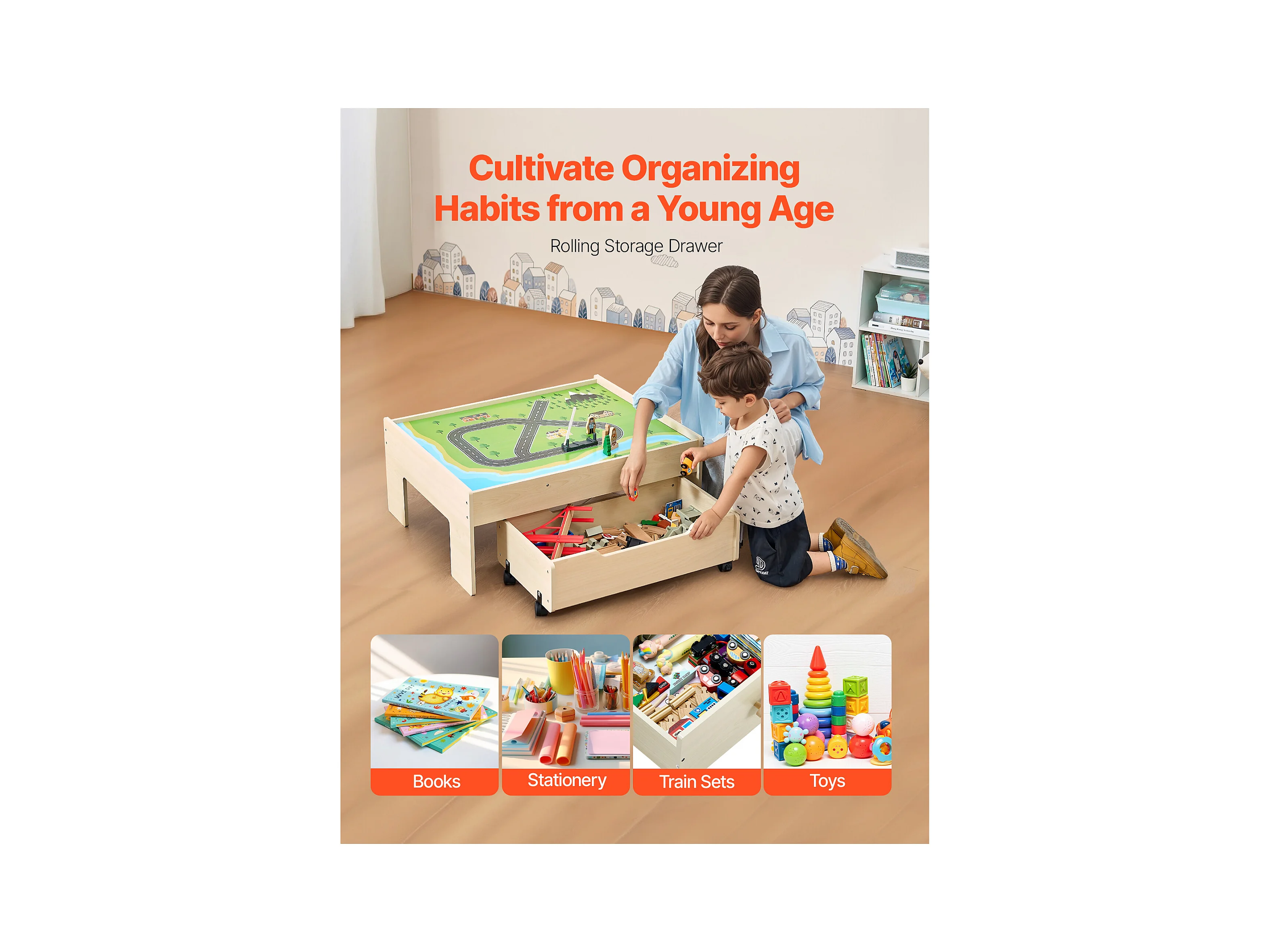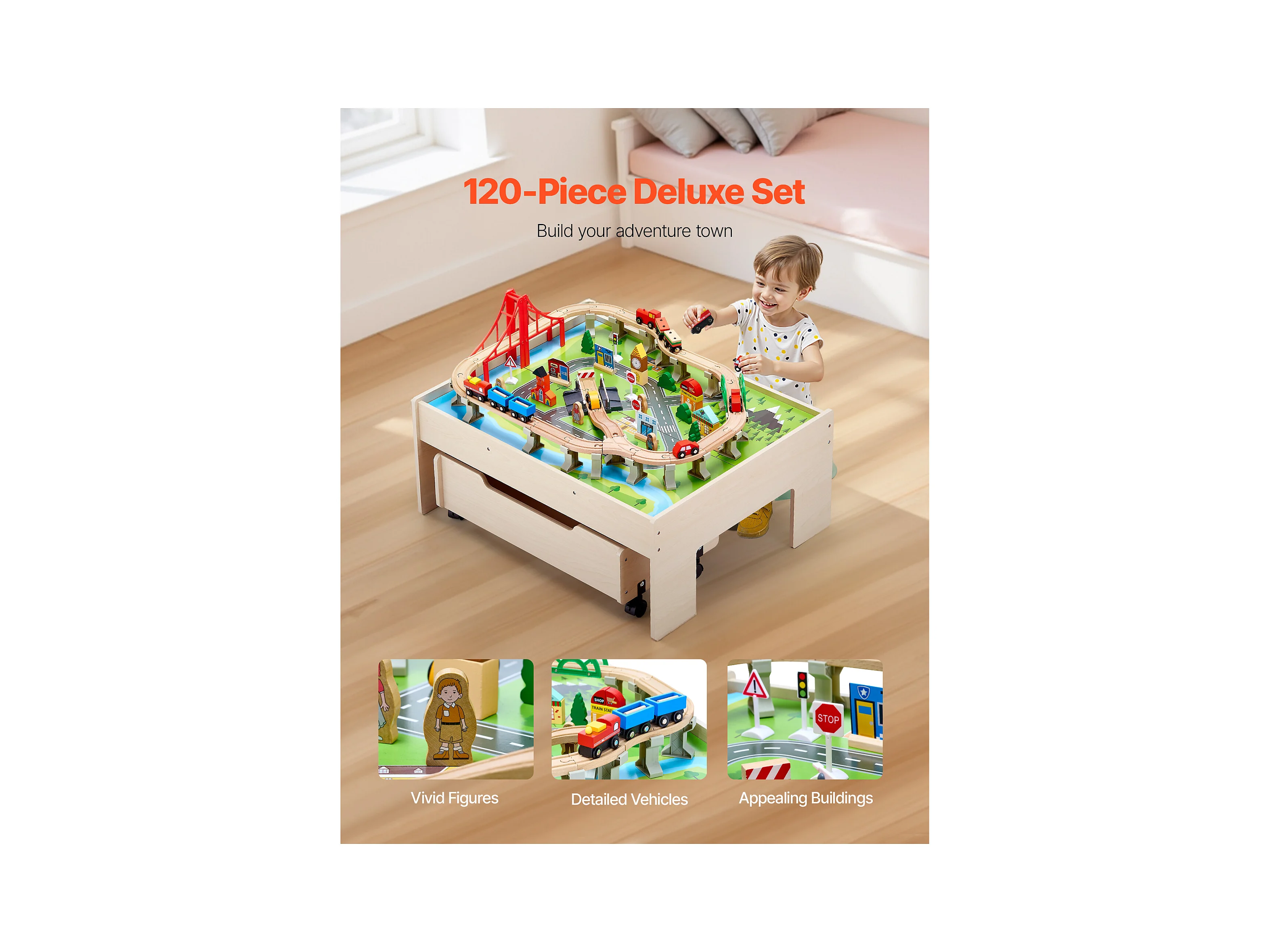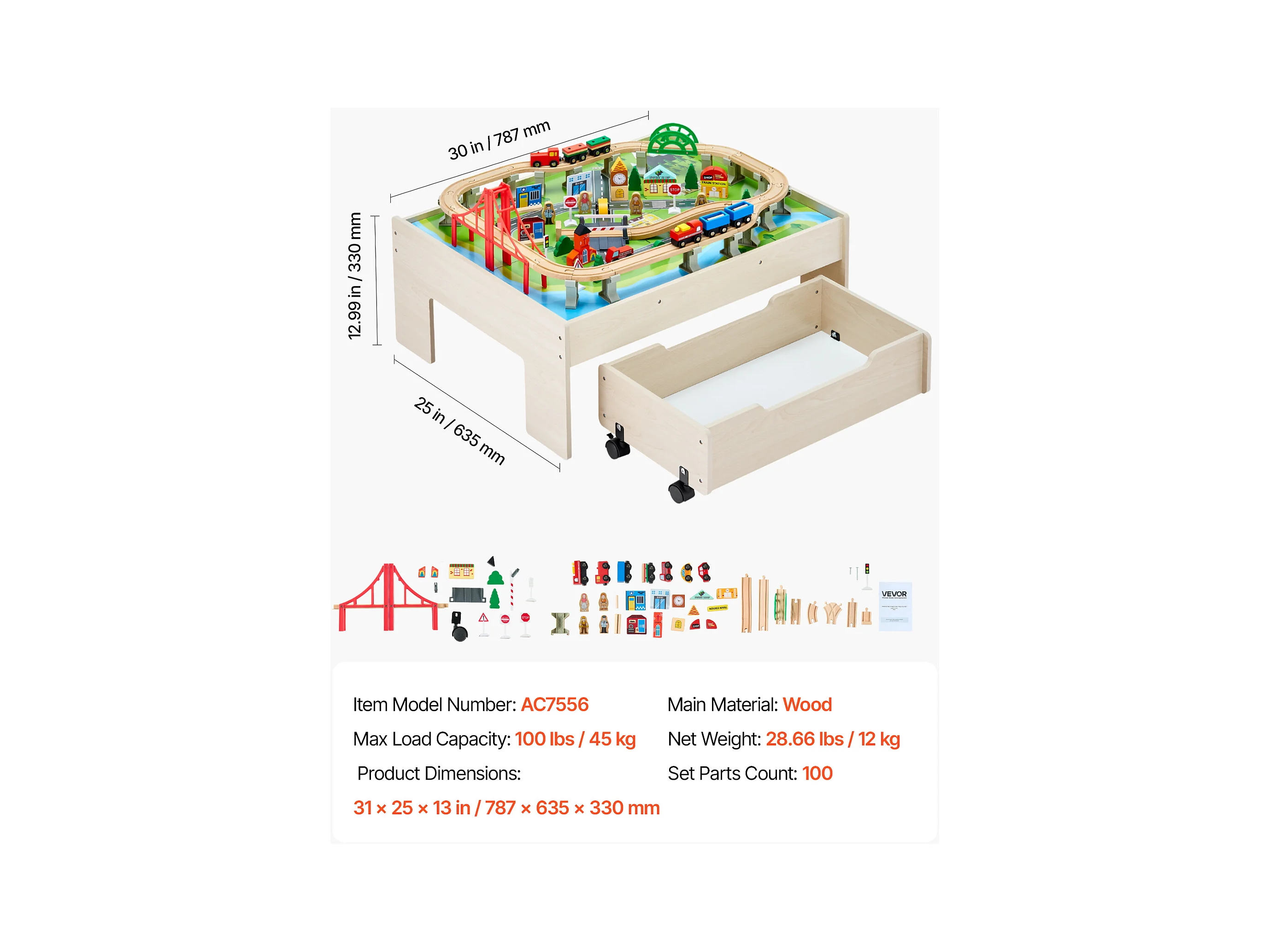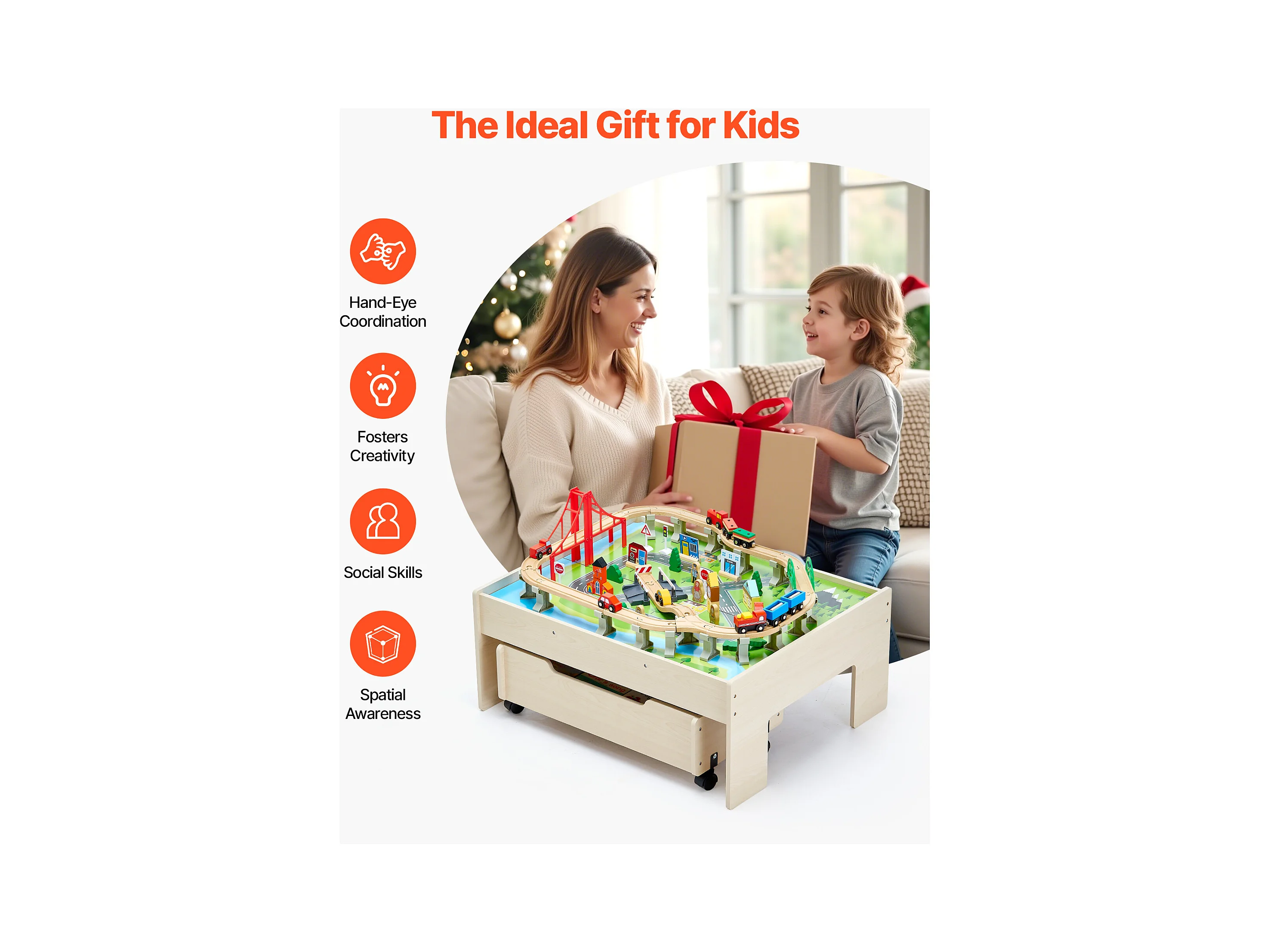 Table Circuit Train Bois SucceBuy, 100 PCS, avec Rail de Train, Table d'Activités 3 en 1 Double Face pour Jouer, Jouets Créatifs pour Enfants 3 Ans et Plus