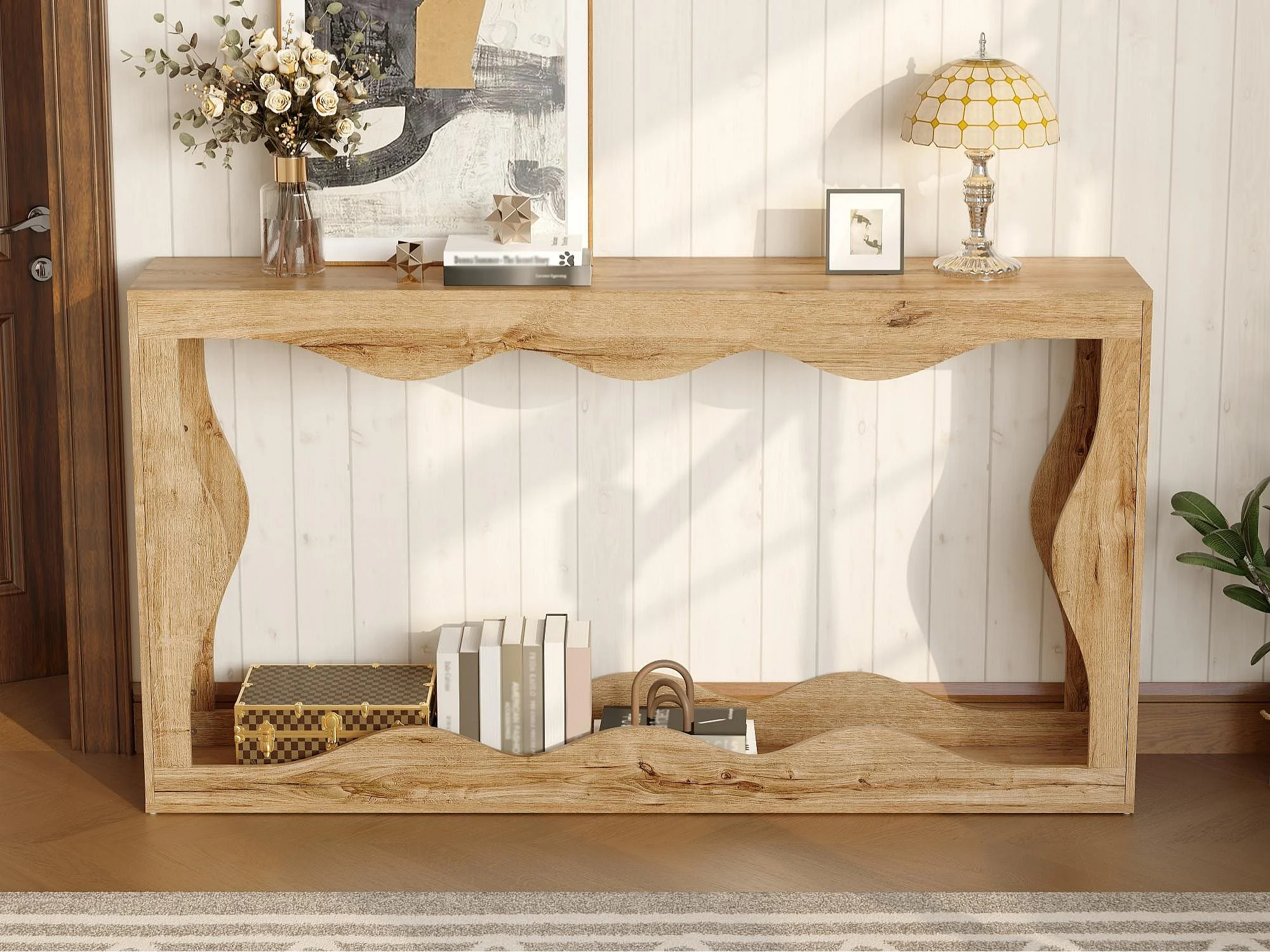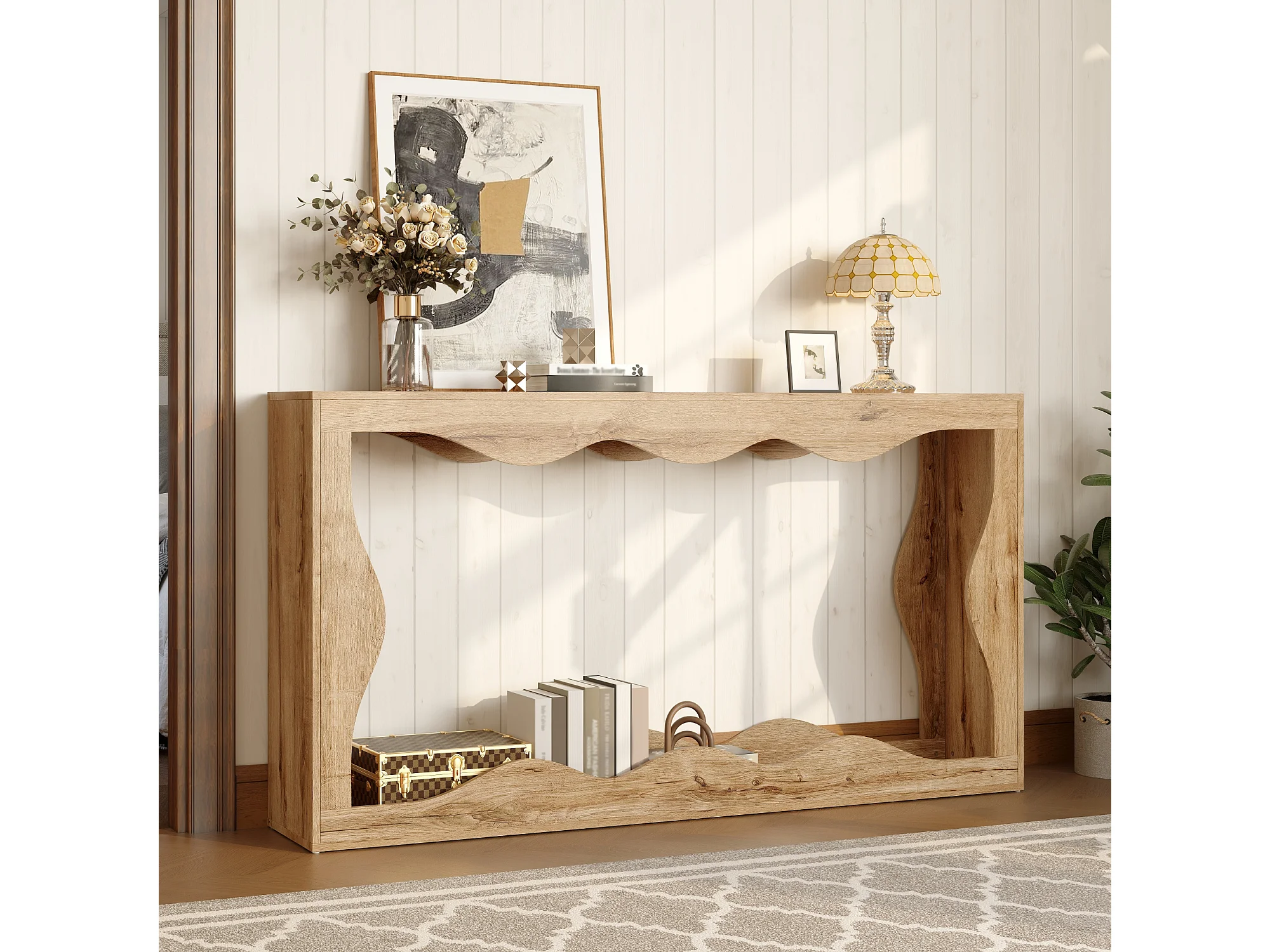 Table d'appoint à bords ondulés 160x30x86.5cm - Étagère double - Aspect bois - Étagère d'entrée - Panneaux de particules - Naturel
